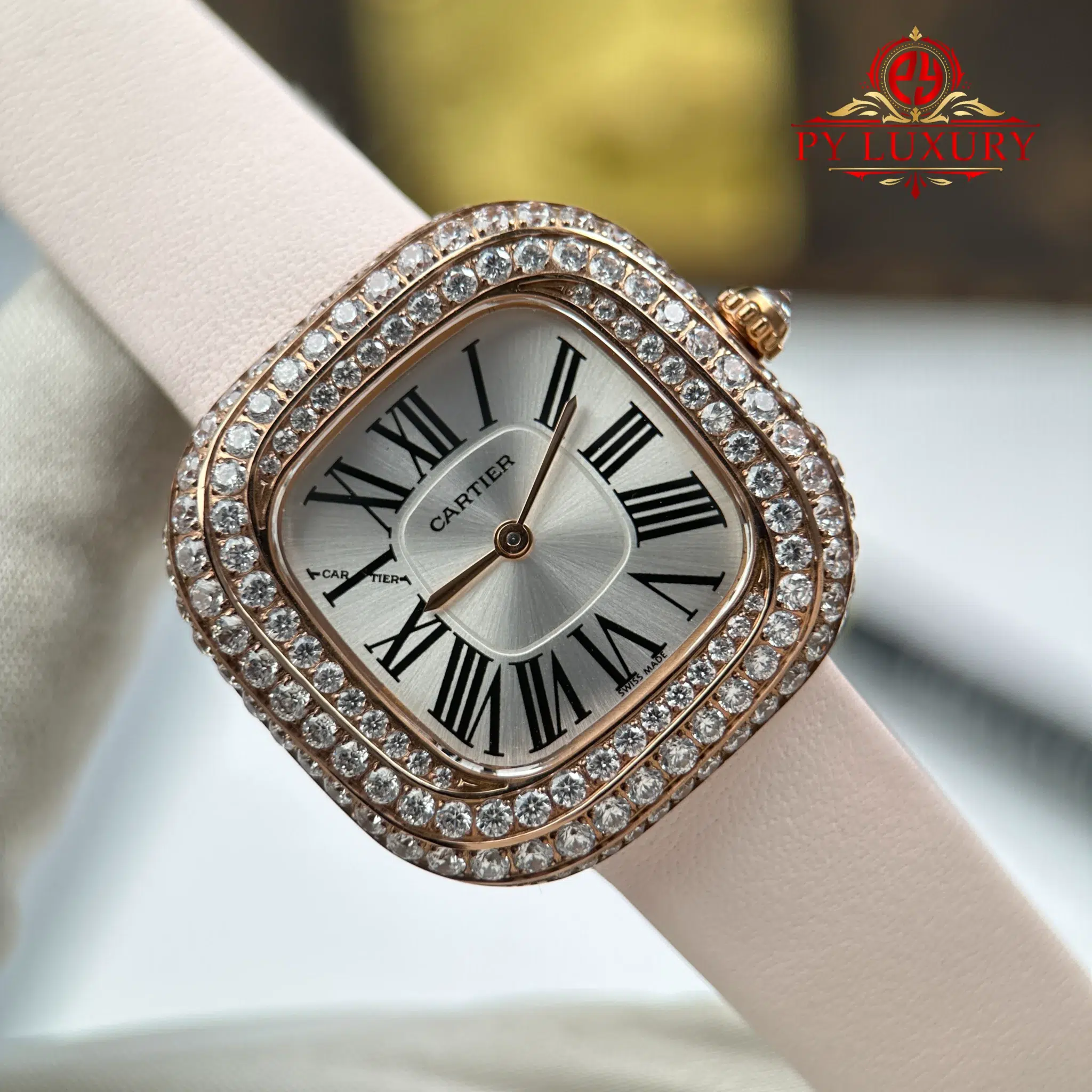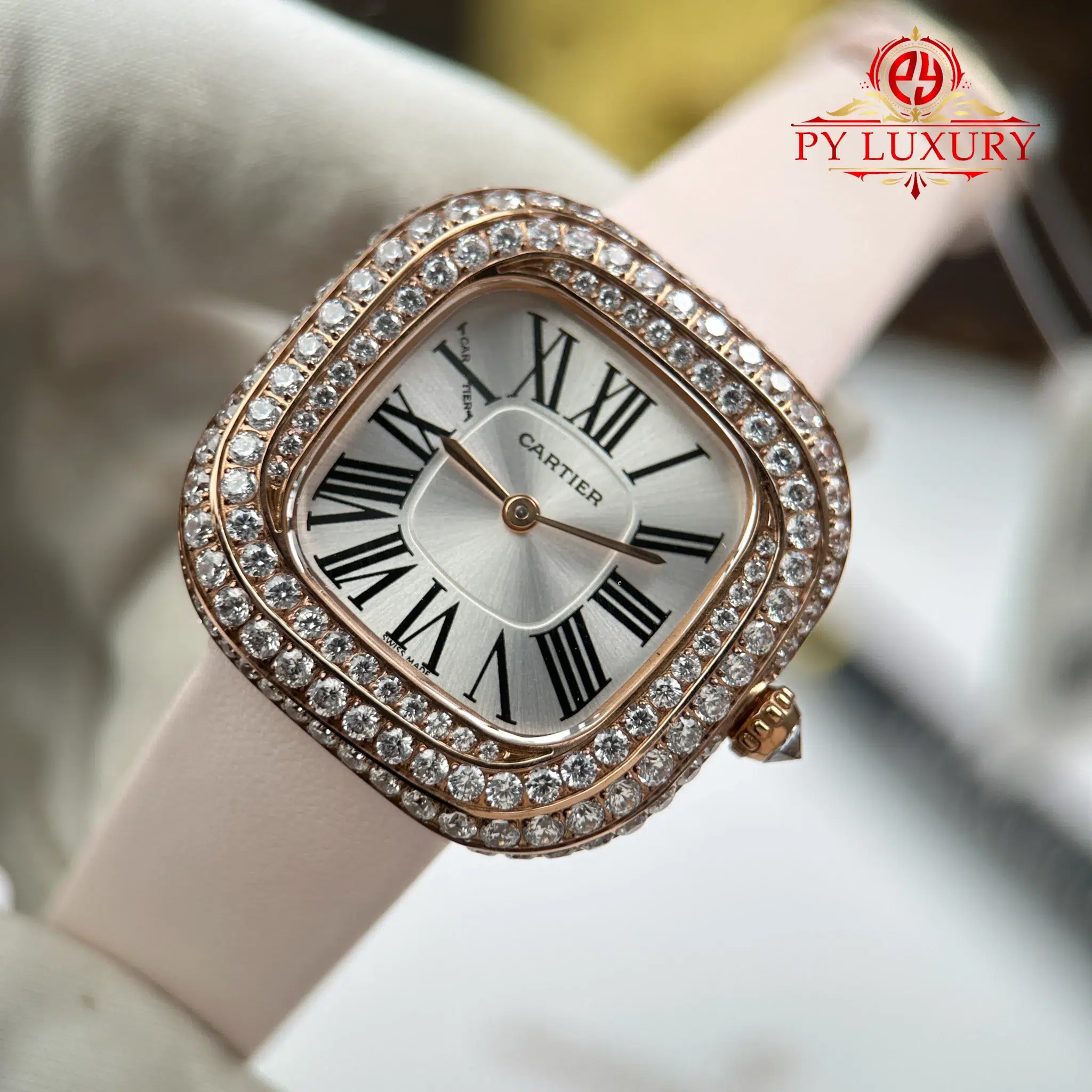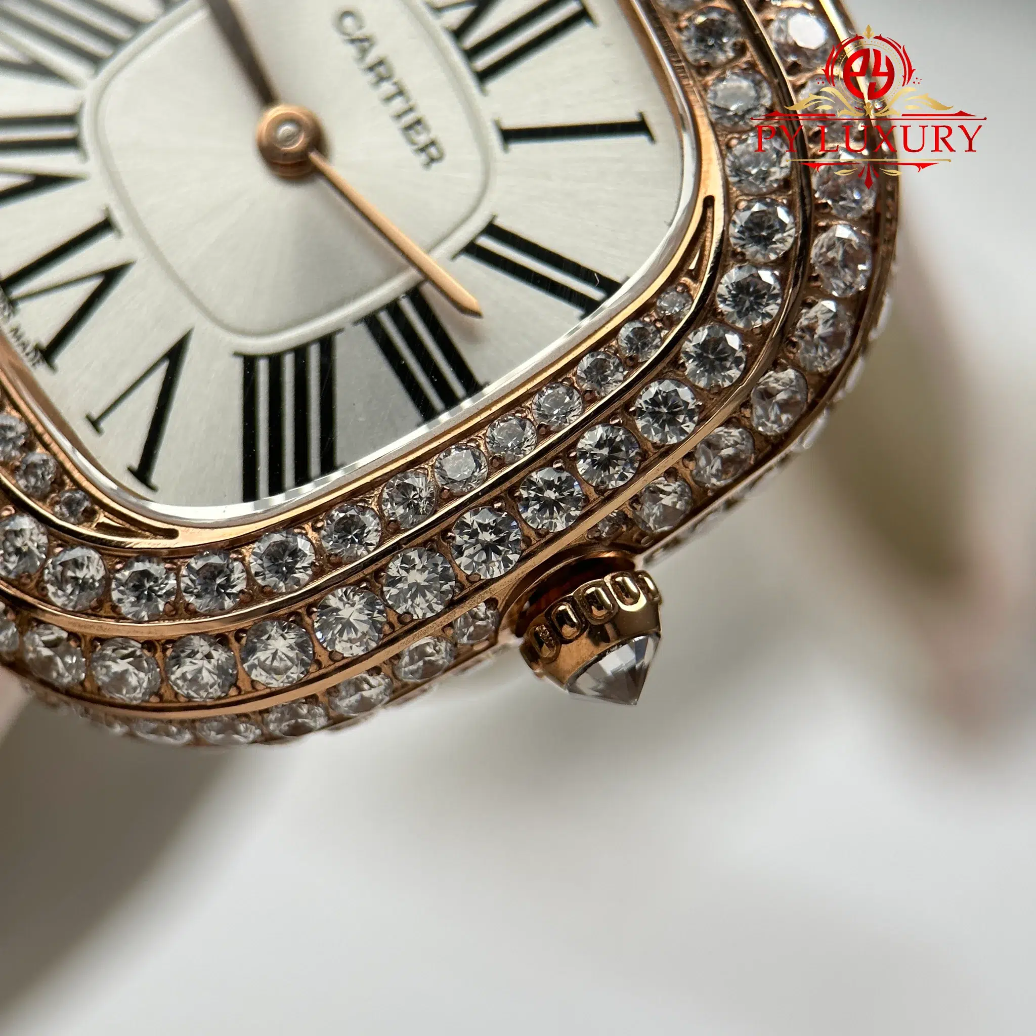 Video of the Cartier Coussin Medium Model WJCS0005 Rose Gold Spiral-set Diamonds Silver Dial Best Replica 30.4mm x 31.1mm: