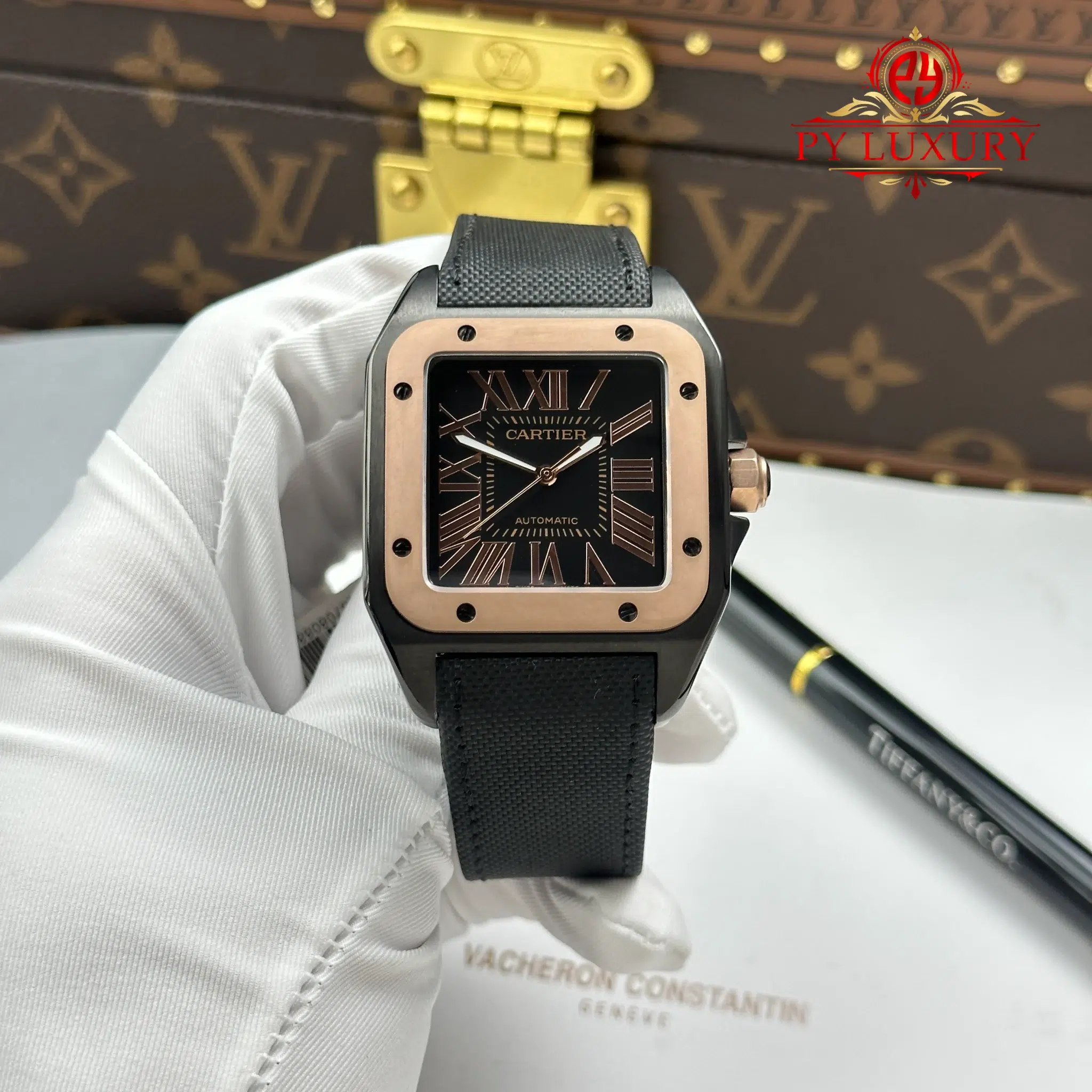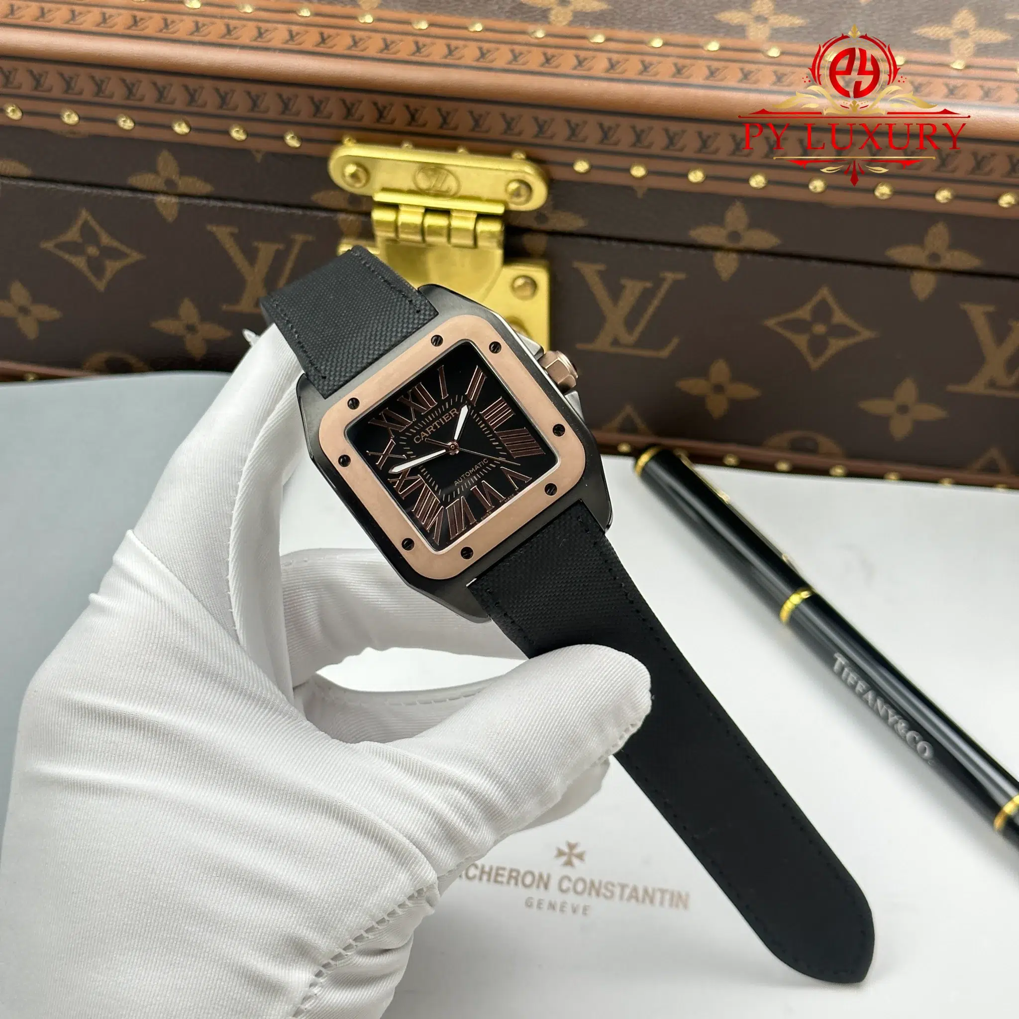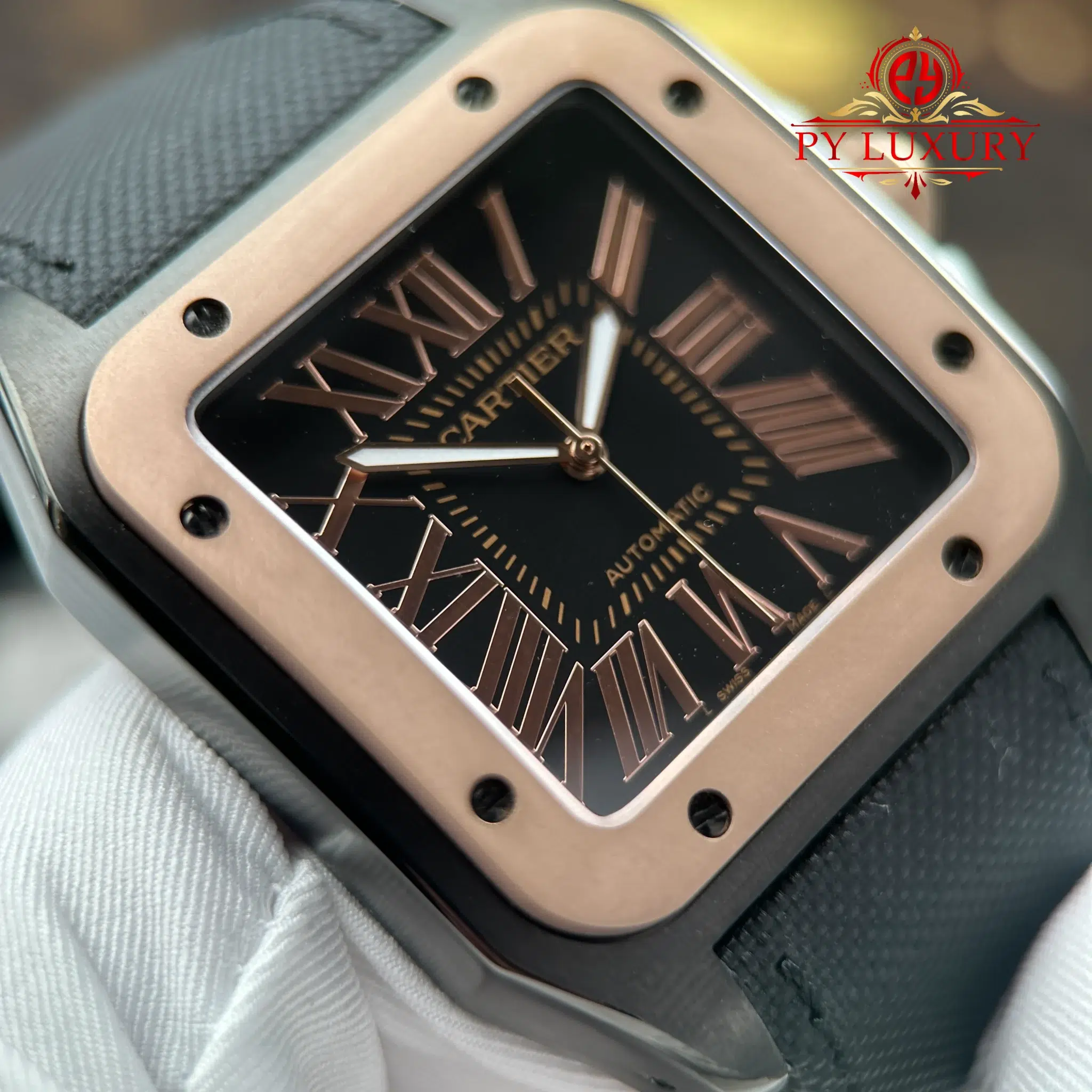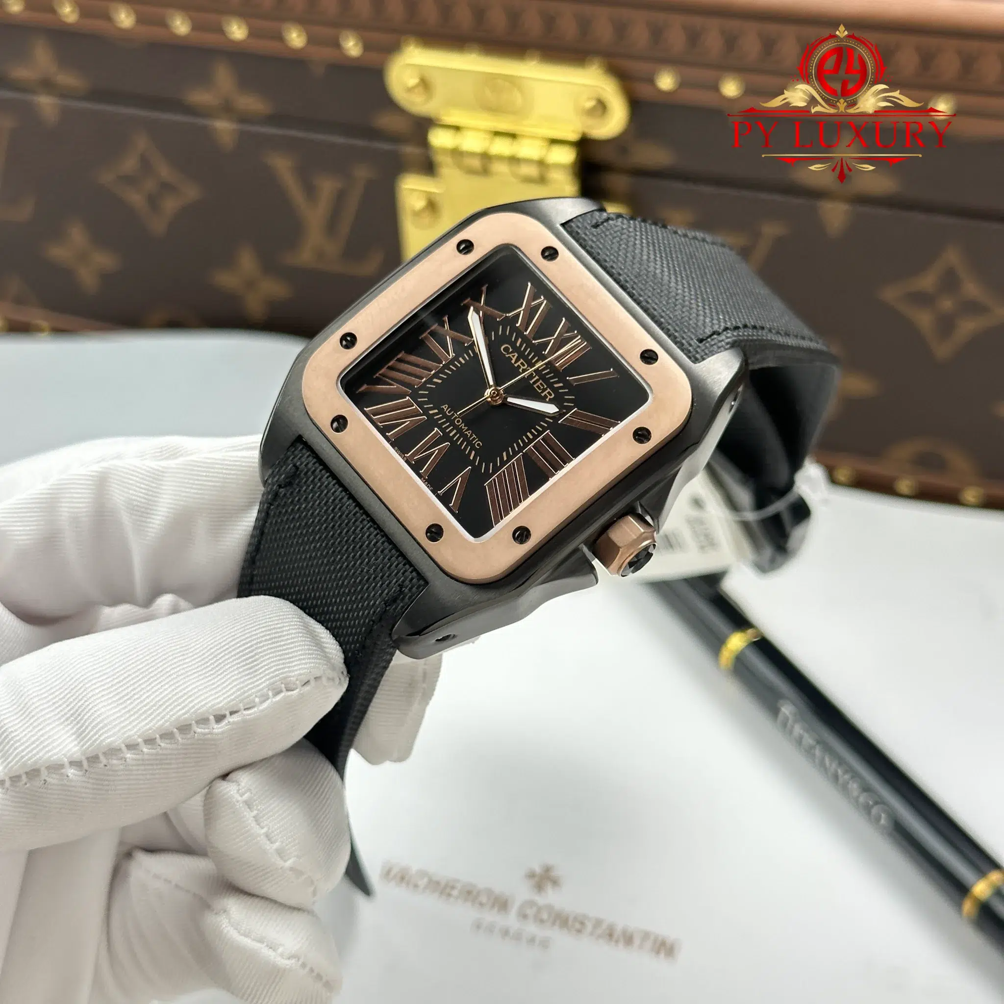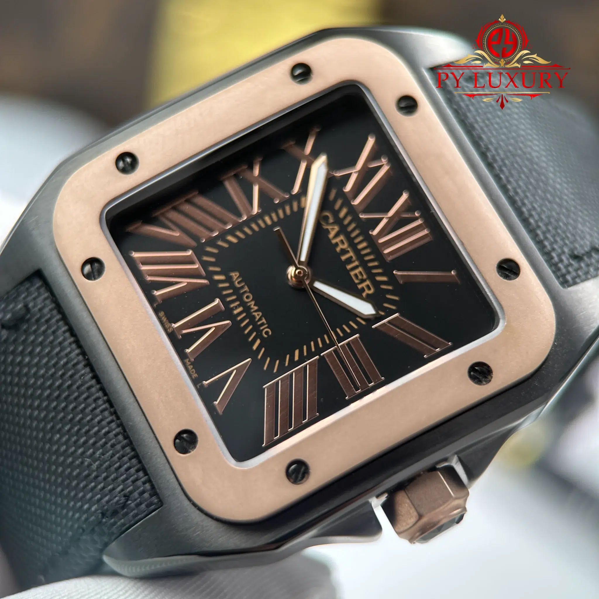 Video of the Cartier Santos 100 XL Black DLC Rose Gold Black Leather Strap Best Replica 43 x 51mm: