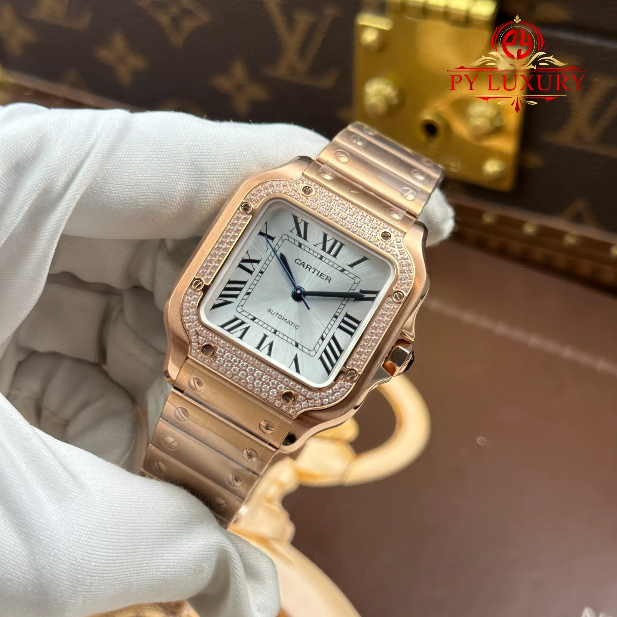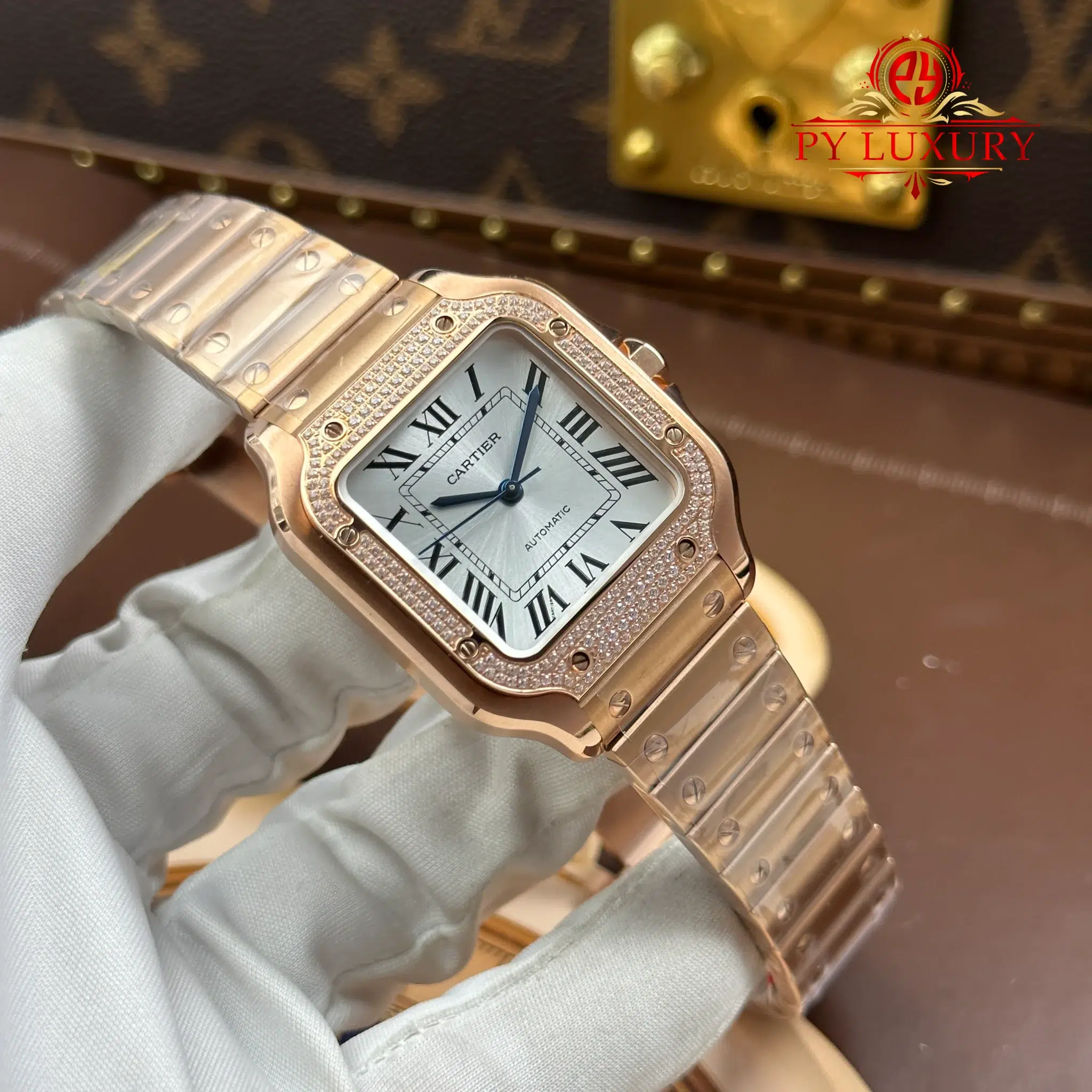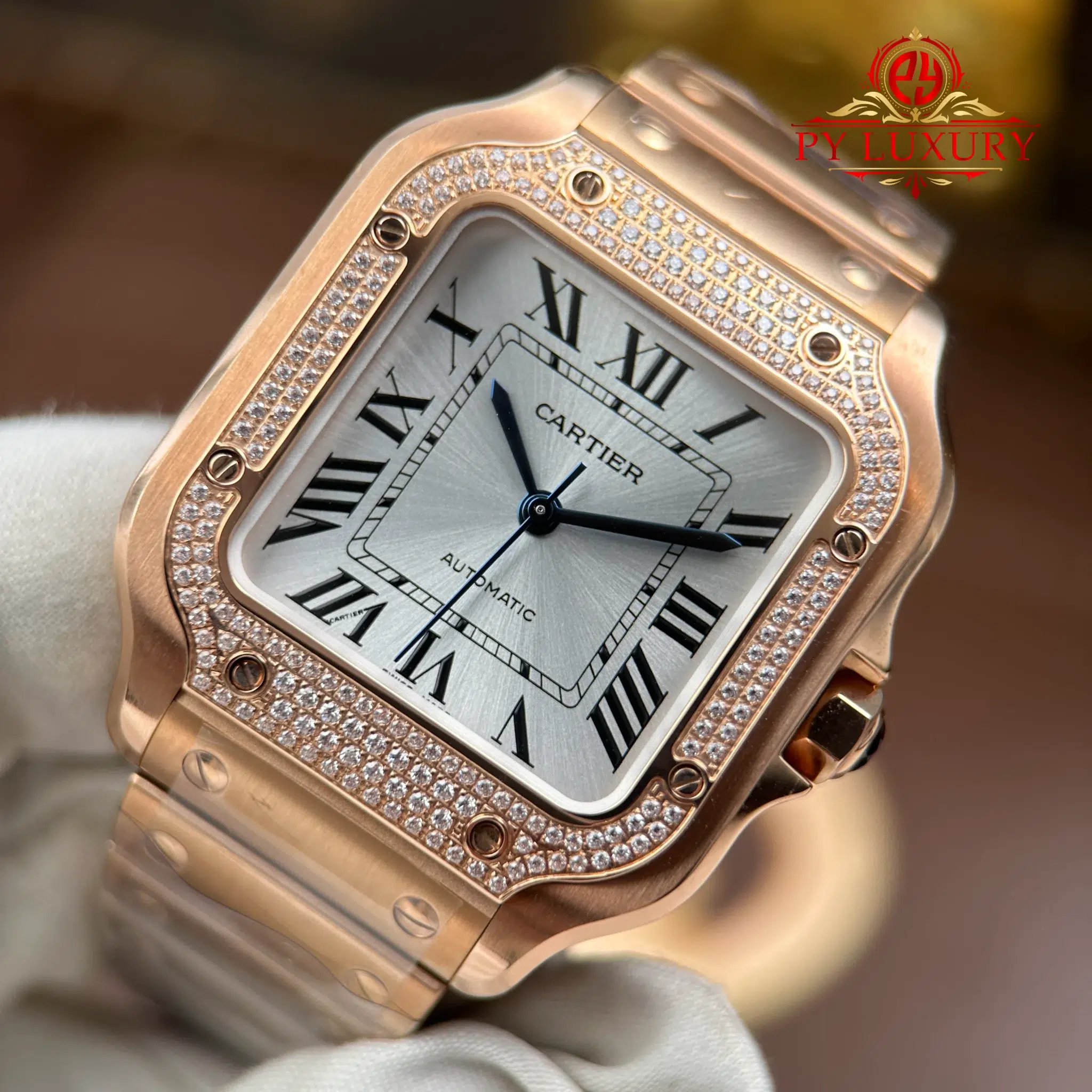 Video of the Cartier Santos WJSA0007 Rose Gold Silver Dial Diamond Bezel Best Replica 35.1mm from BV Factory at Py-Luxury: