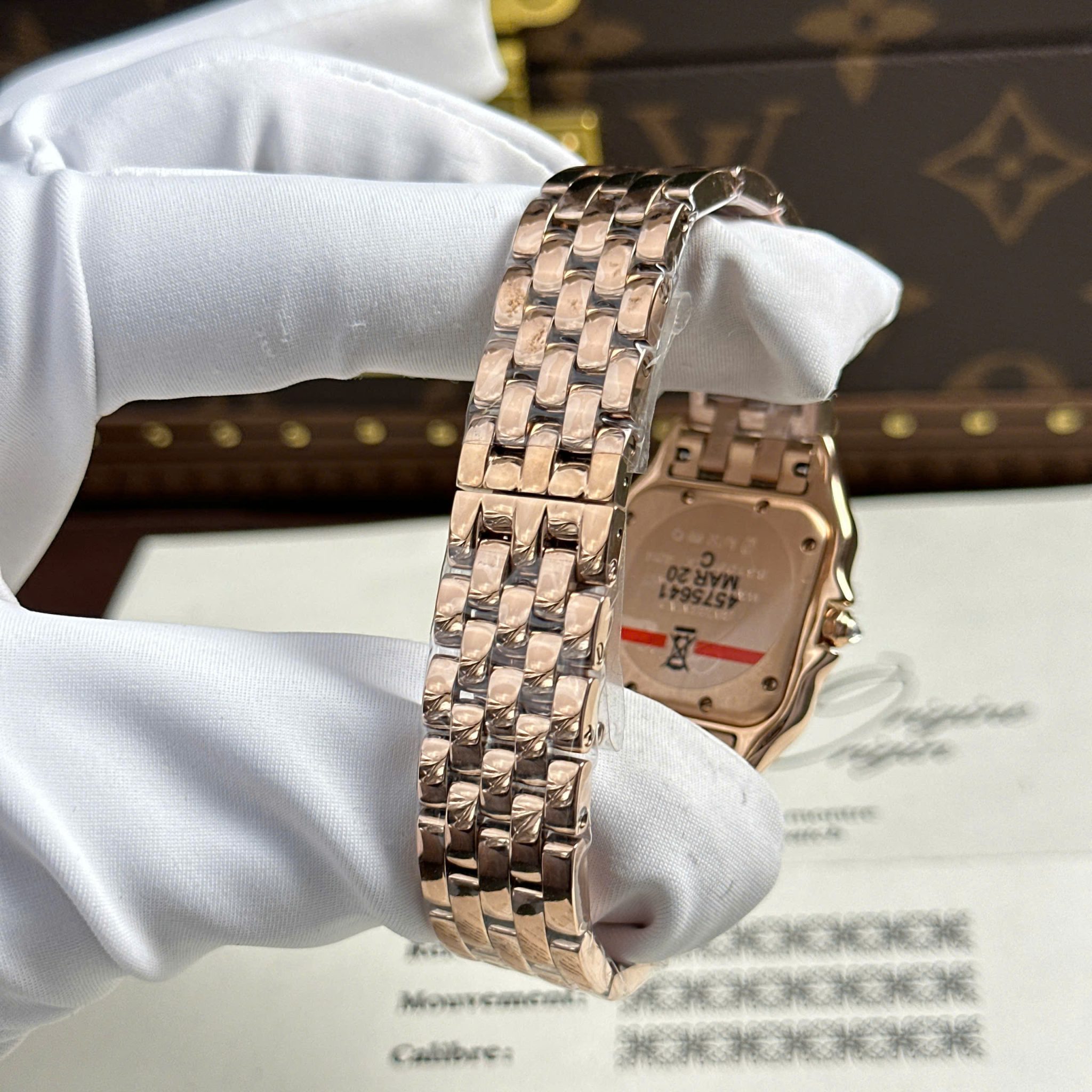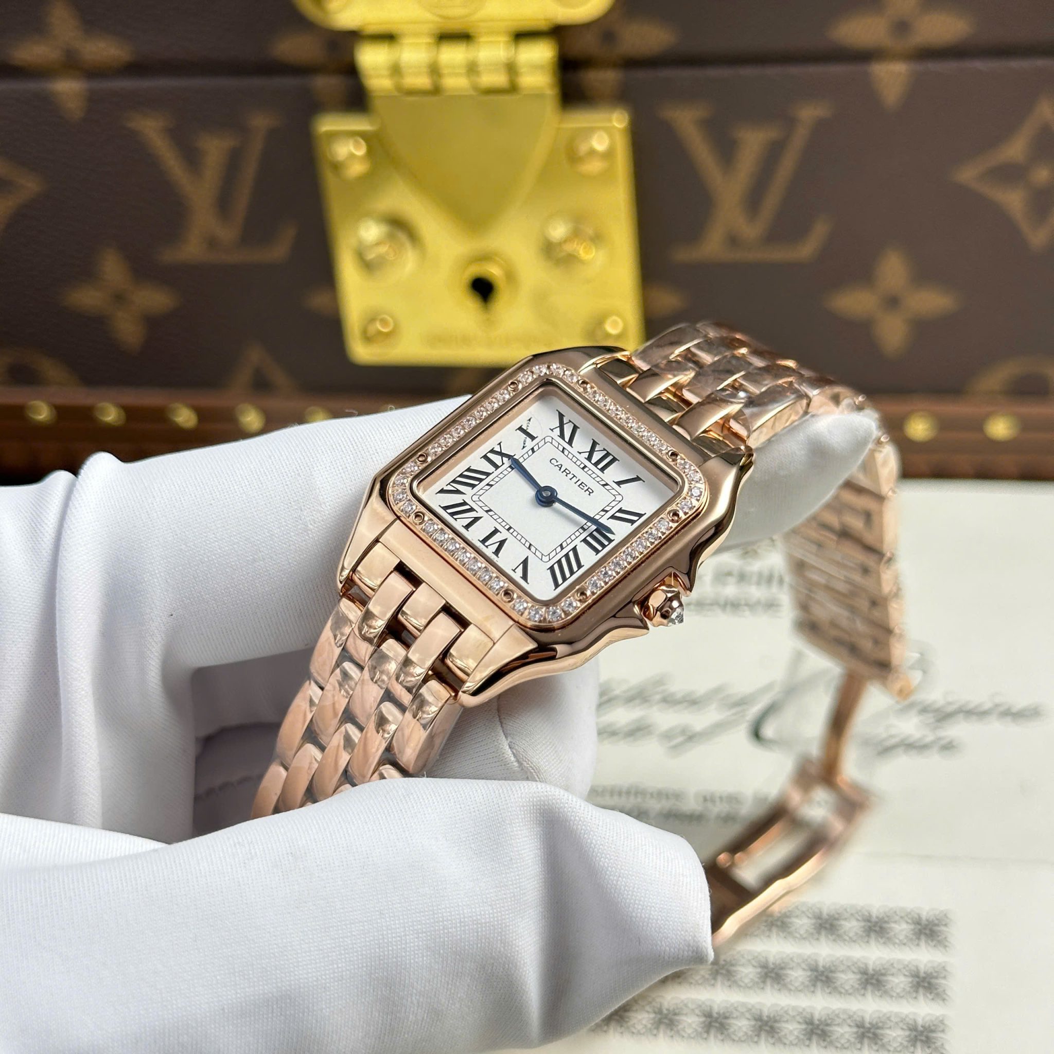 Đồng Hồ Nữ Cartier Panthère Medium Model Vàng Hồng Mặt Trắng Viền Đá Replica 27mm x 36mm