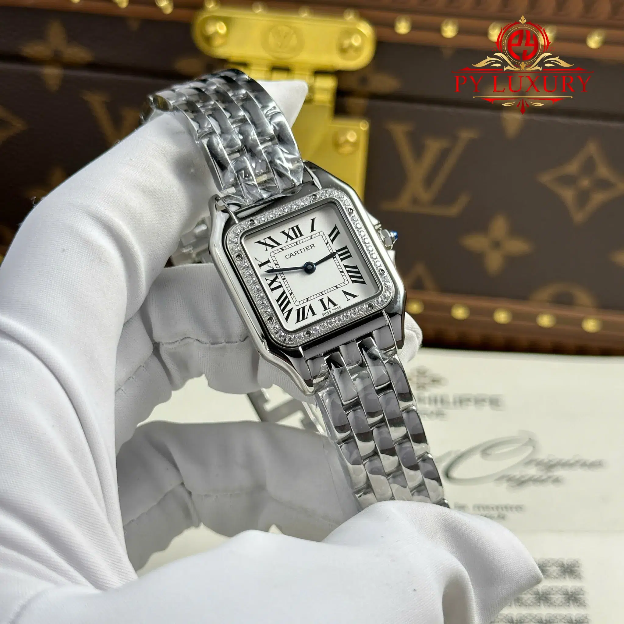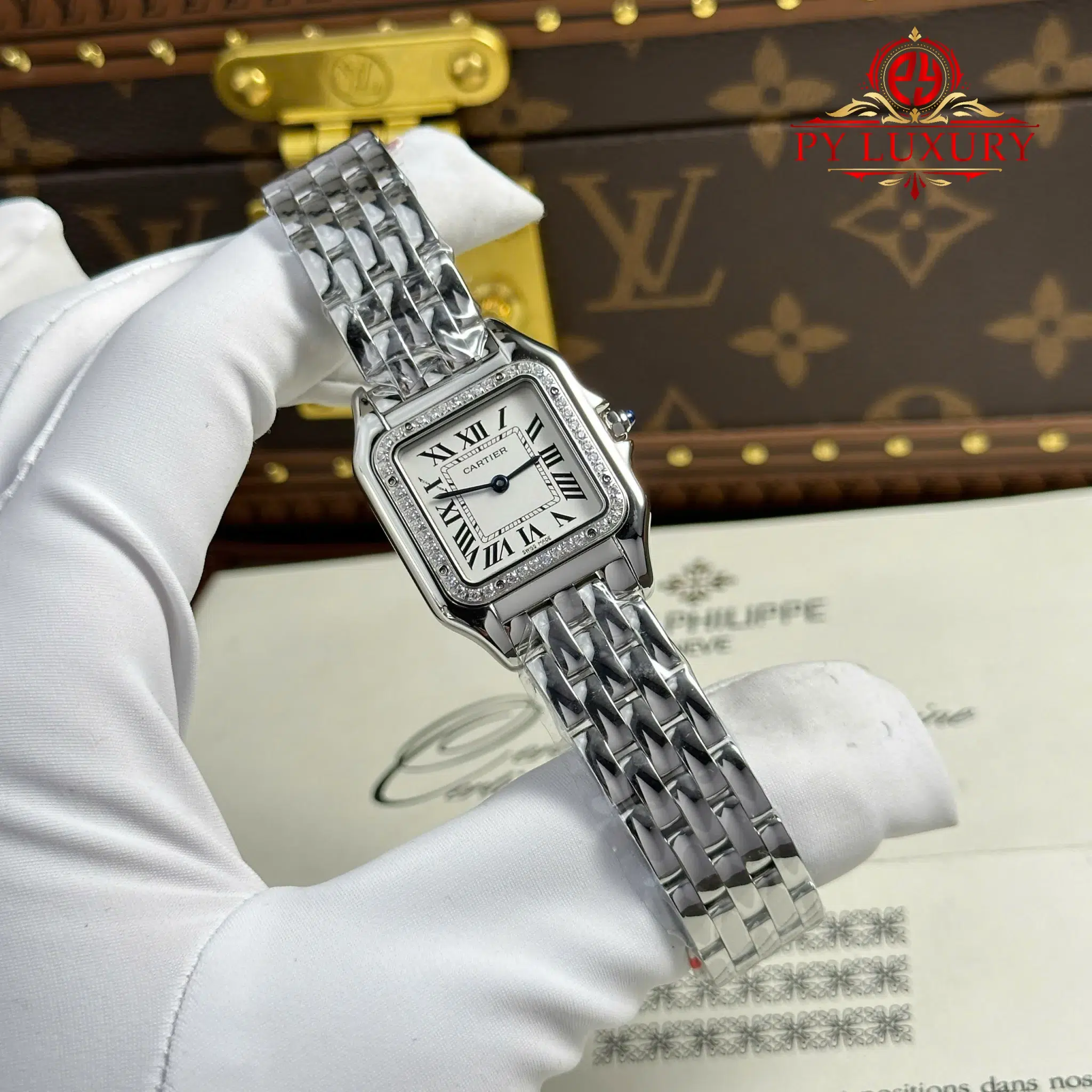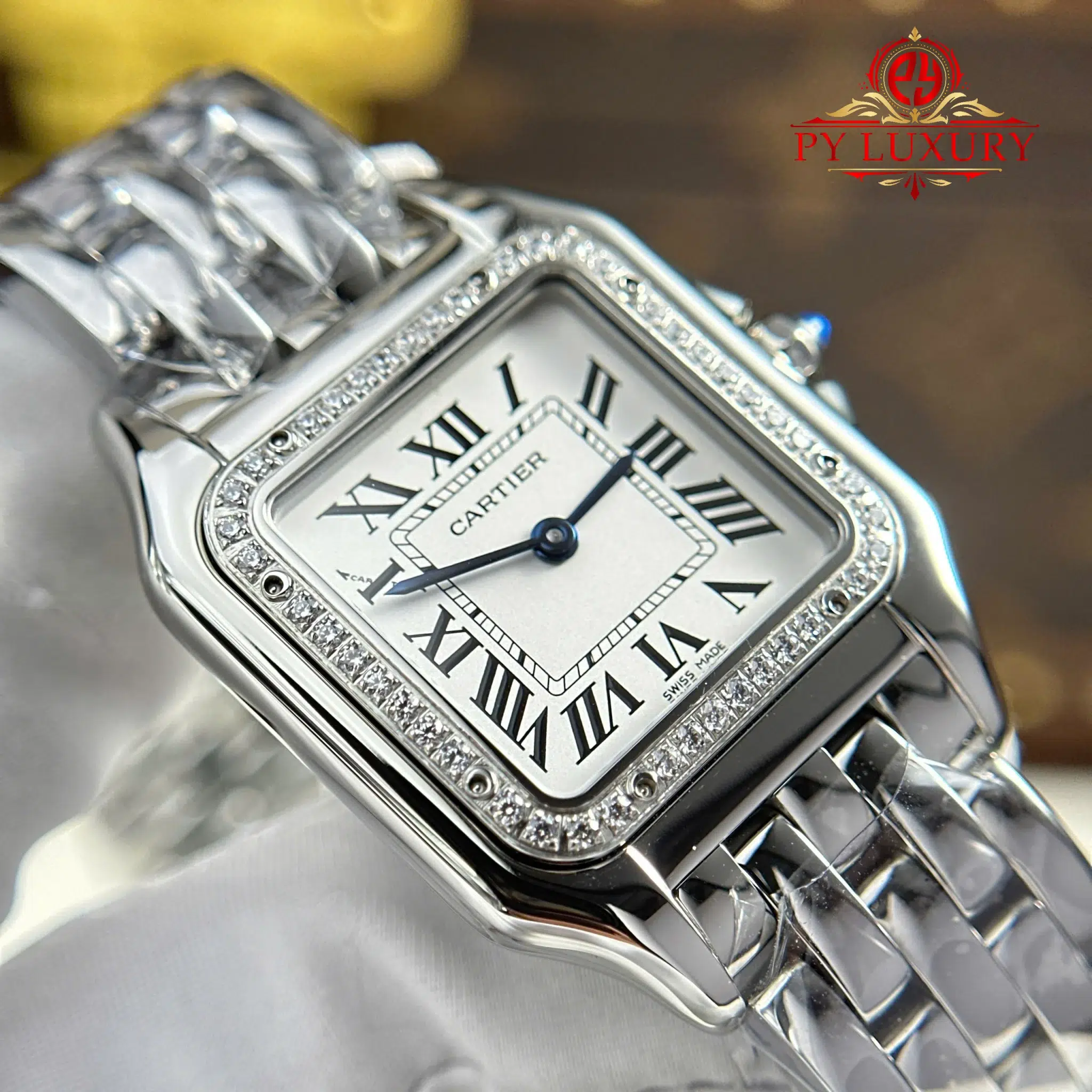Đồng Hồ Nữ Cartier Panthère Vỏ Thép Mặt Trắng Viền Đá CZ Replica 27mm x 36mm