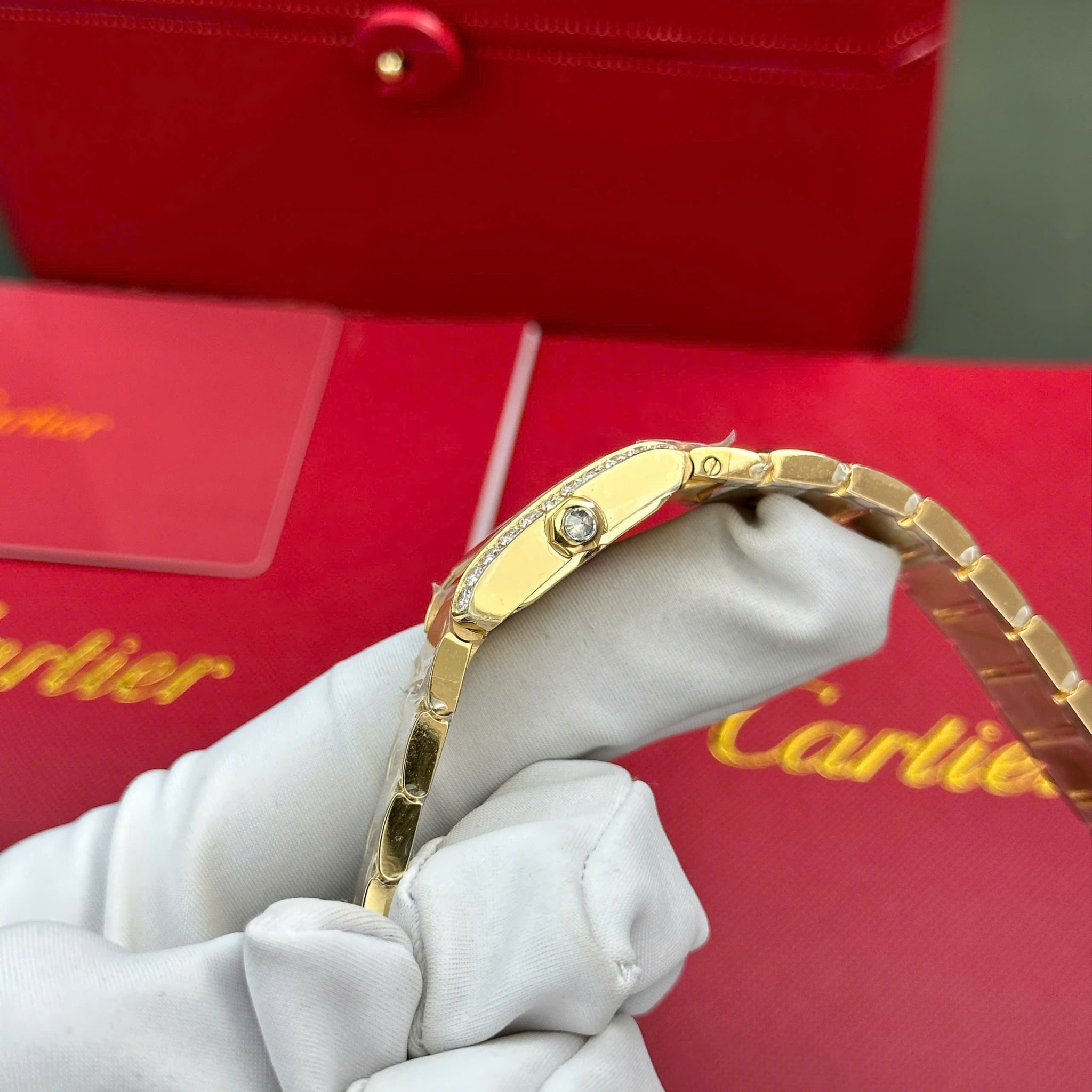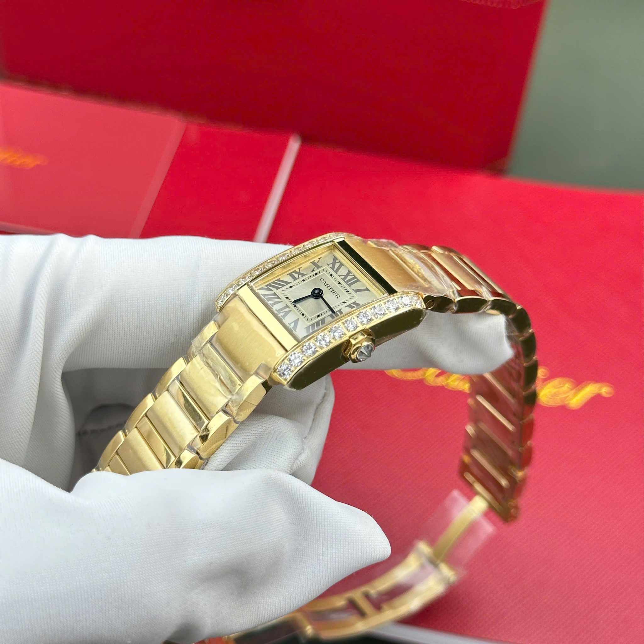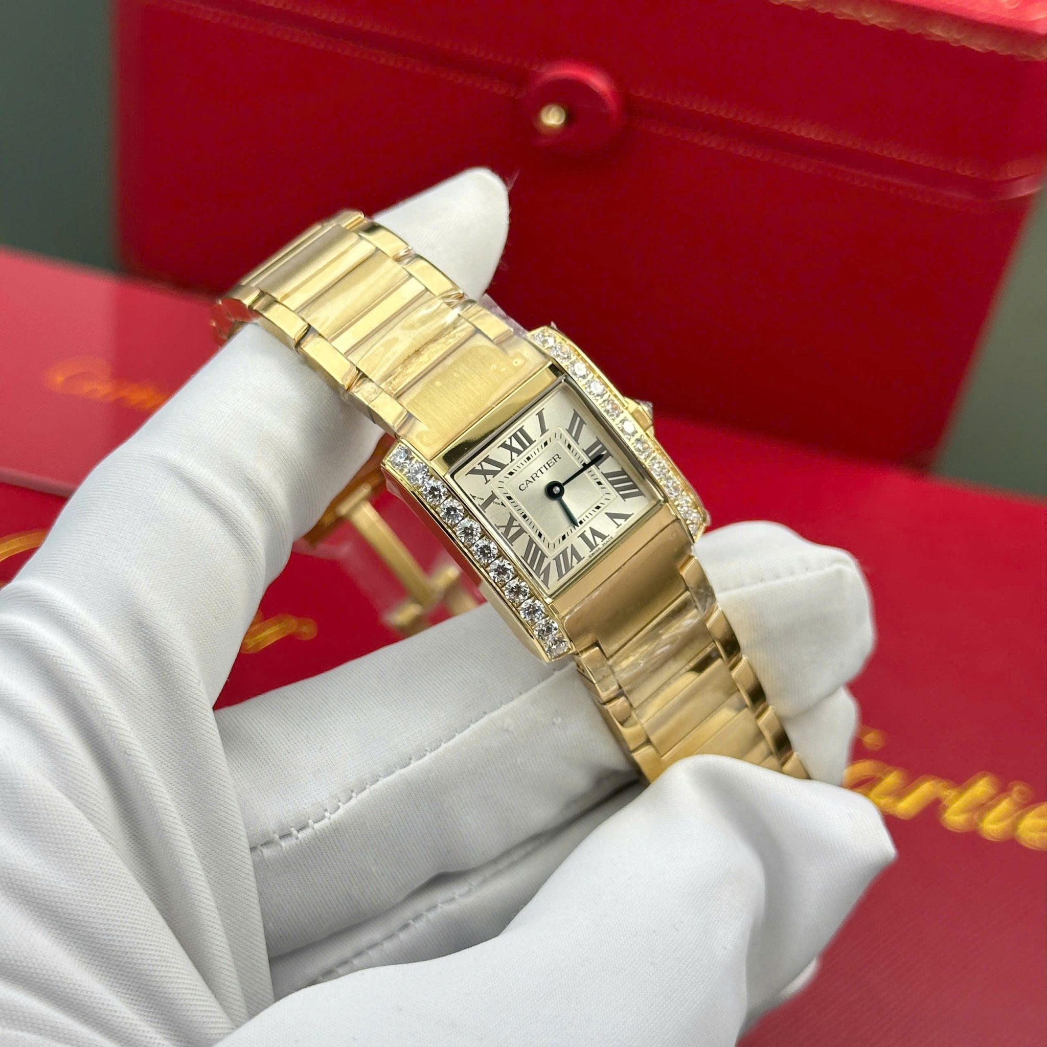 Đồng Hồ Nữ Cartier Tank Francaise WJTA0062 Vàng Vàng Mặt Số Tia Nắng Vàng Viền Đá Replica 25.7 x 21.2mm