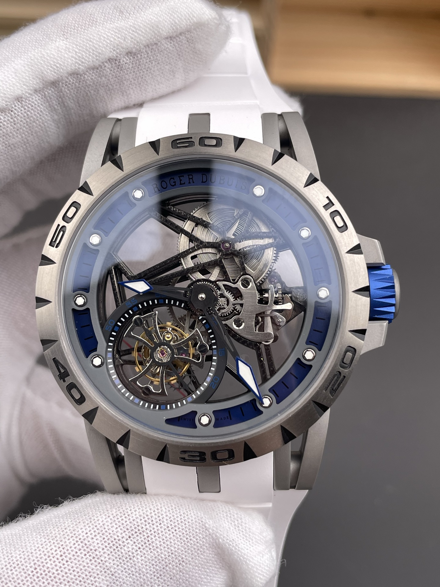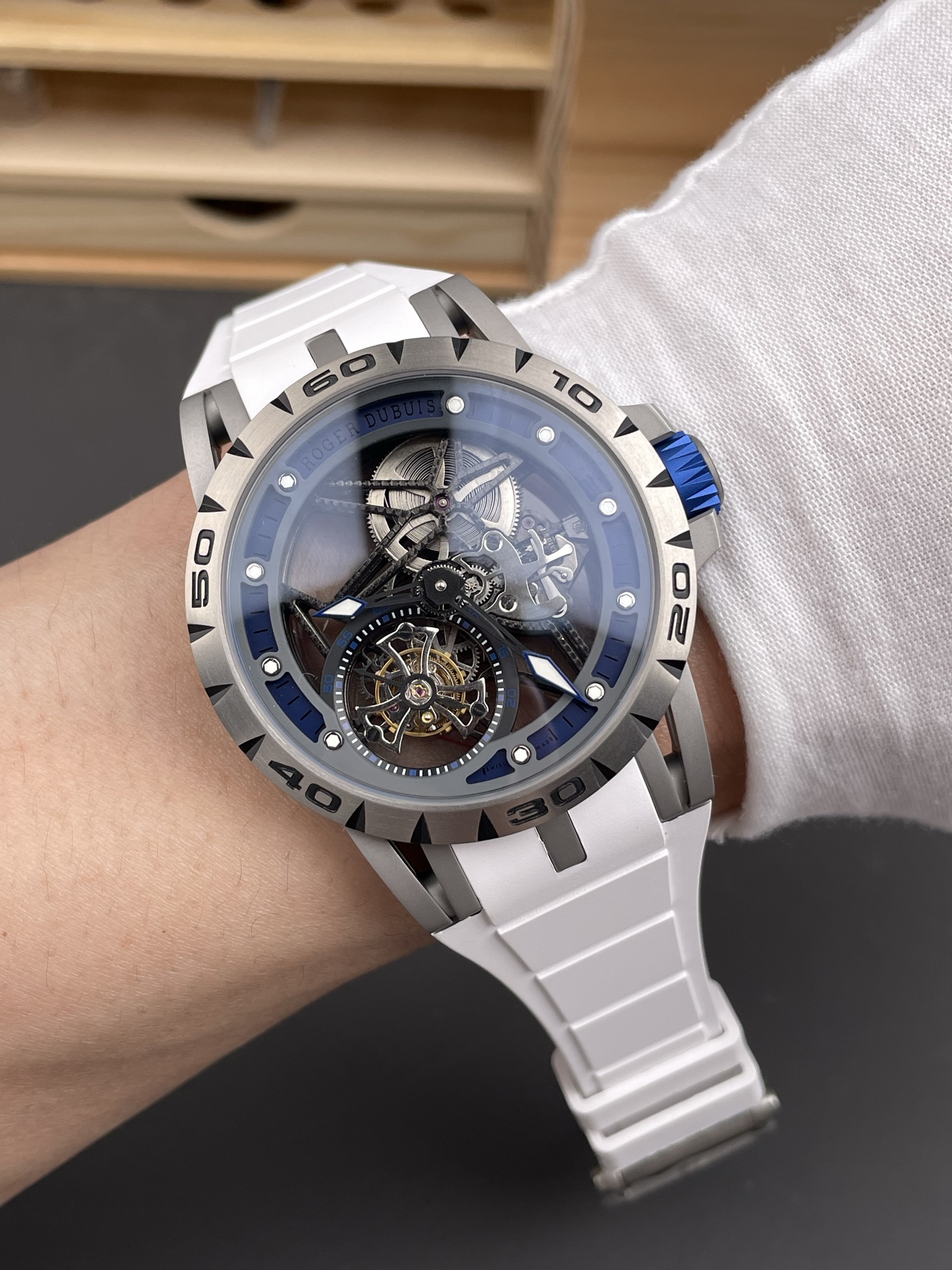 Đồng Hồ Roger Dubuis Excalibur Spider Skeleton Flying Tourbillon RDDBEX0546 Mặt Số Bạc & Xanh Replica 1:1 YS Factory 45mm