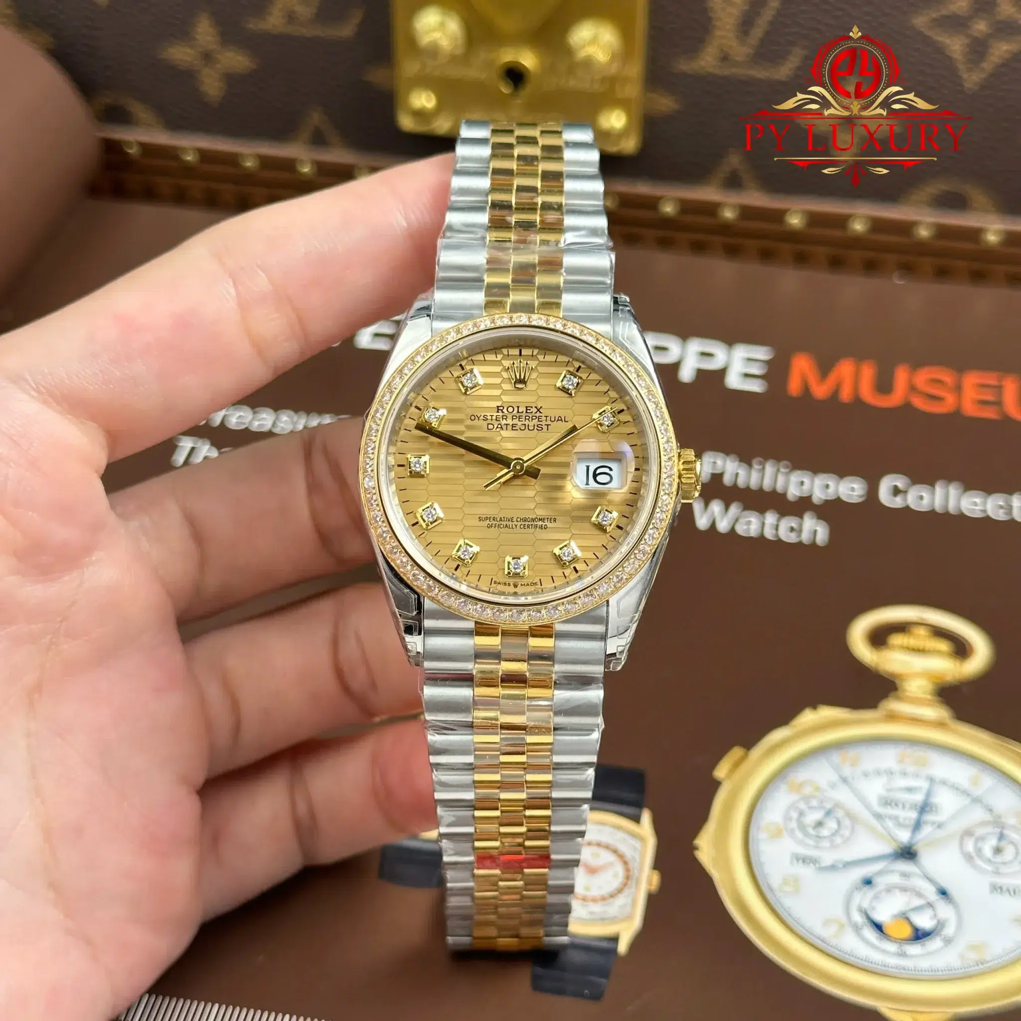 Đồng Hồ Rolex Datejust 126283RBR Demi Vàng Mặt Số Nếp Gấp Vàng Cọc Số Đá Viền Đá Dây Jubilee Replica 1:1 VSF 36mm