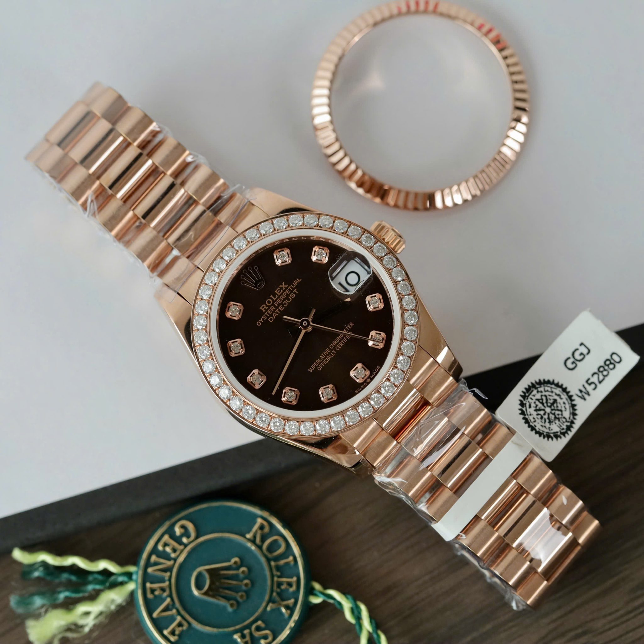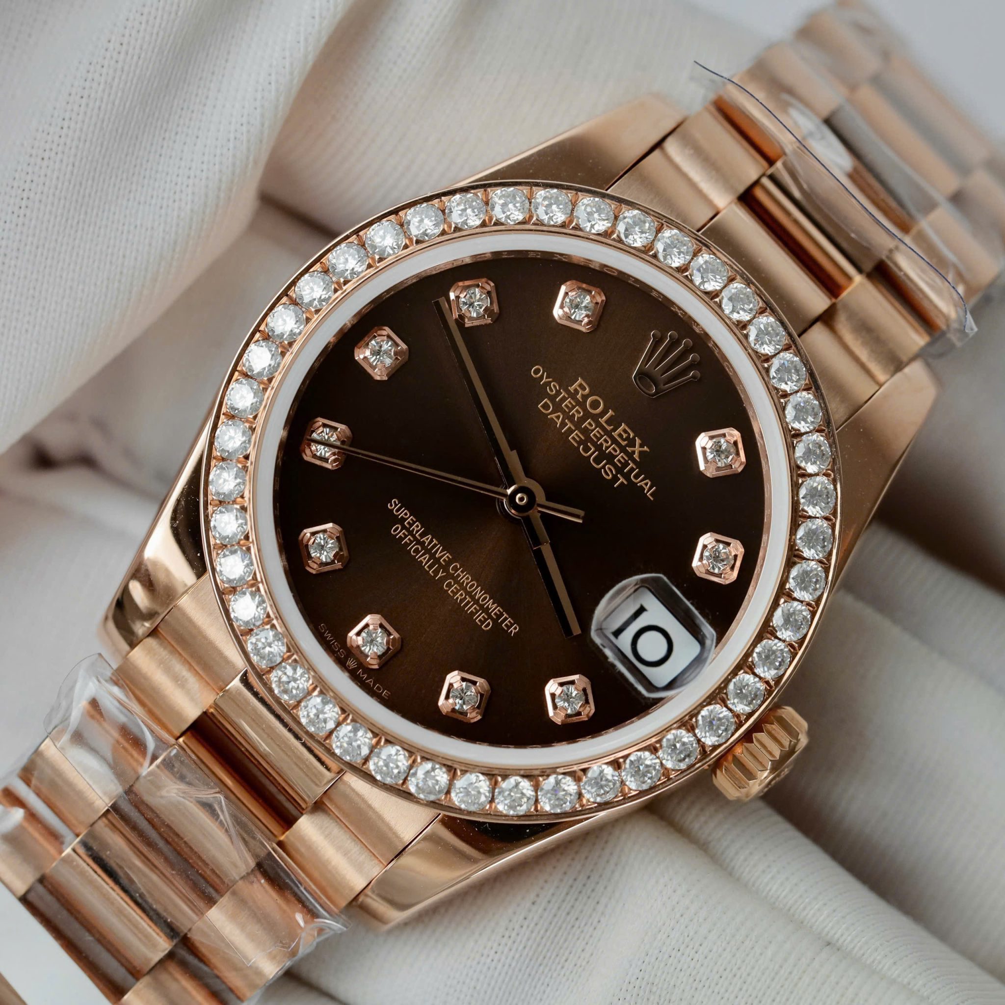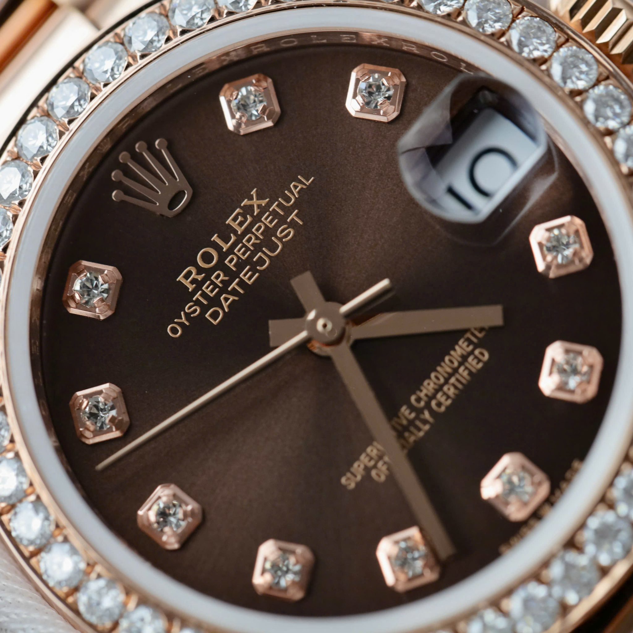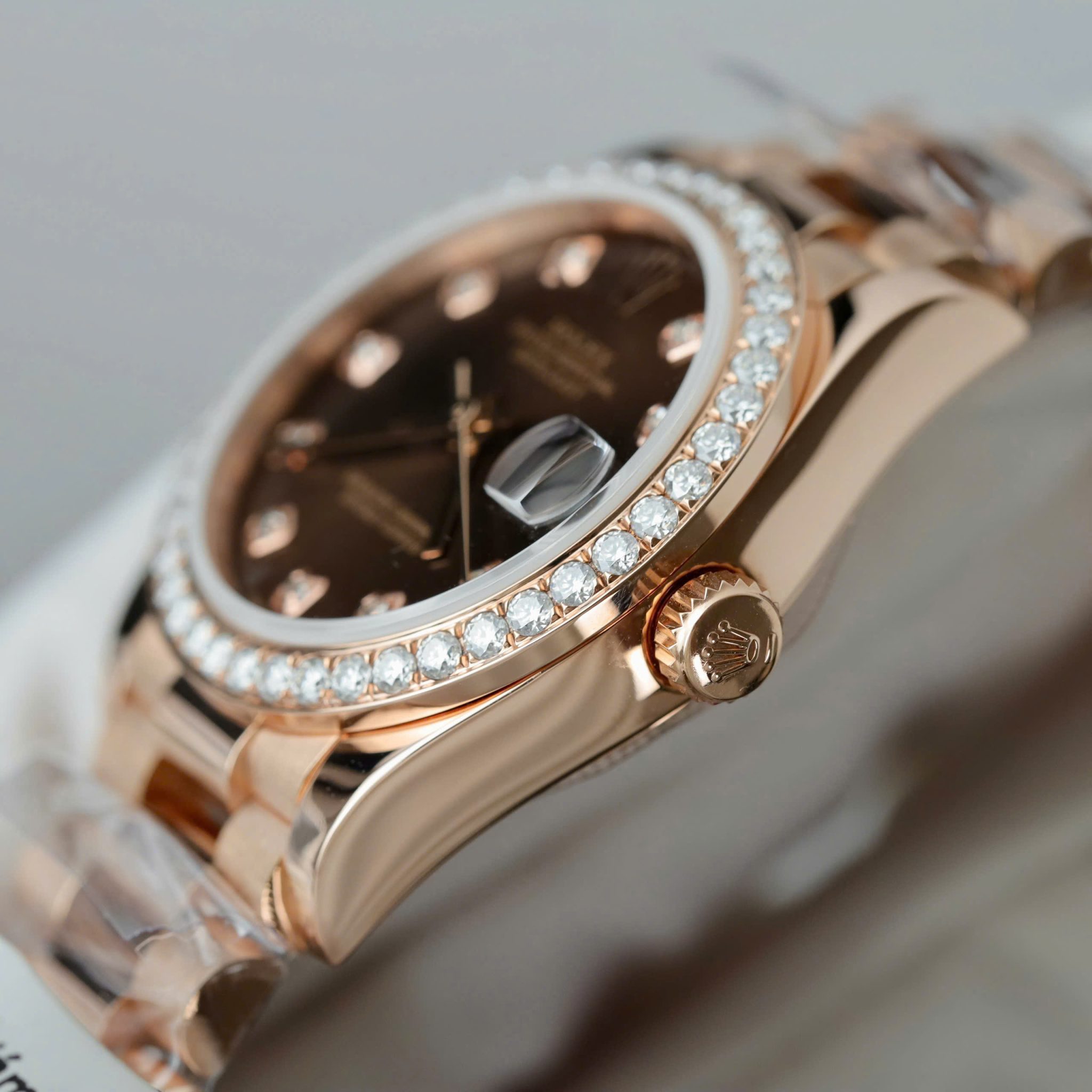 Đồng Hồ Rolex Datejust 278285RBR Mặt Chocolate Bọc Vàng 18K Viền Đá Moissanite 31mm