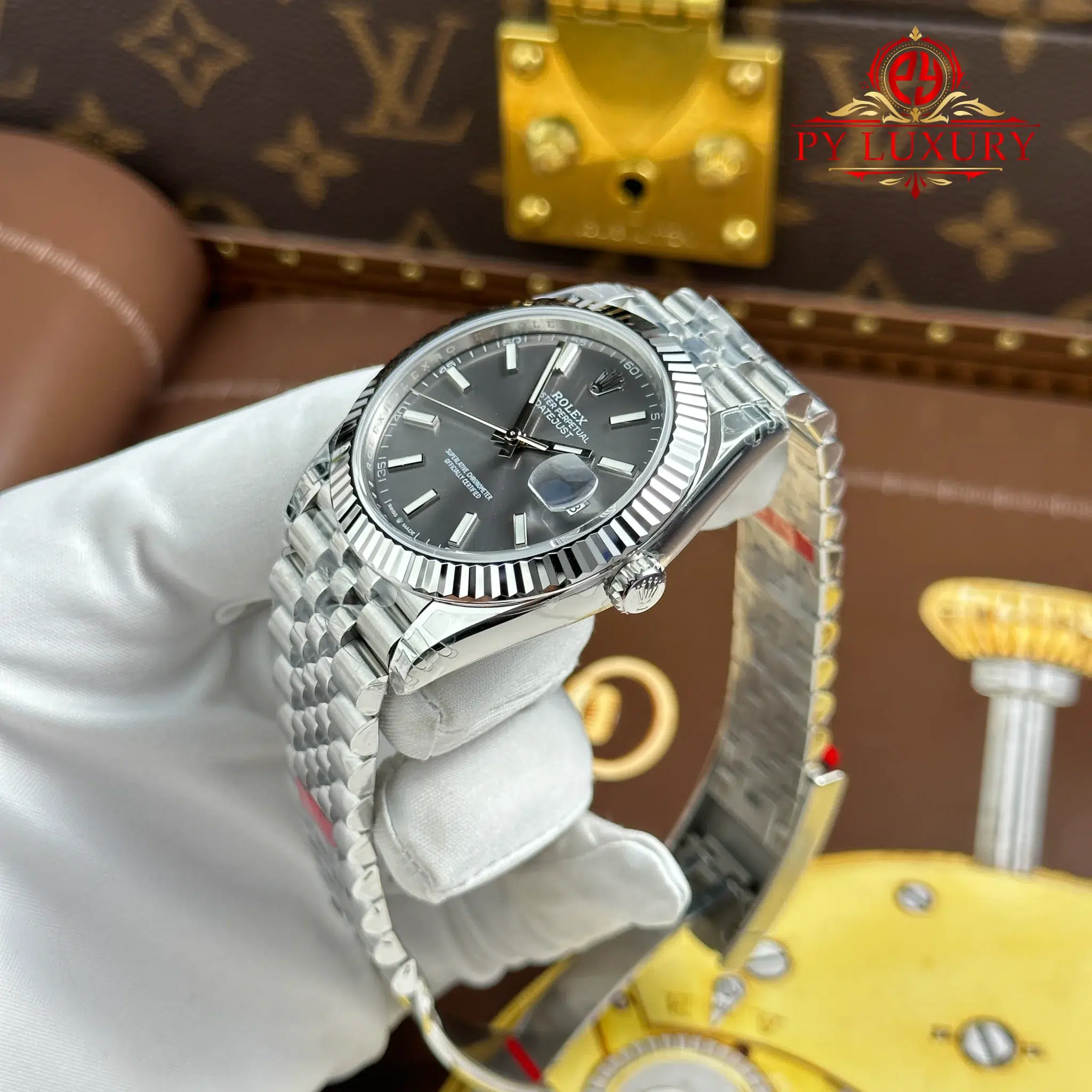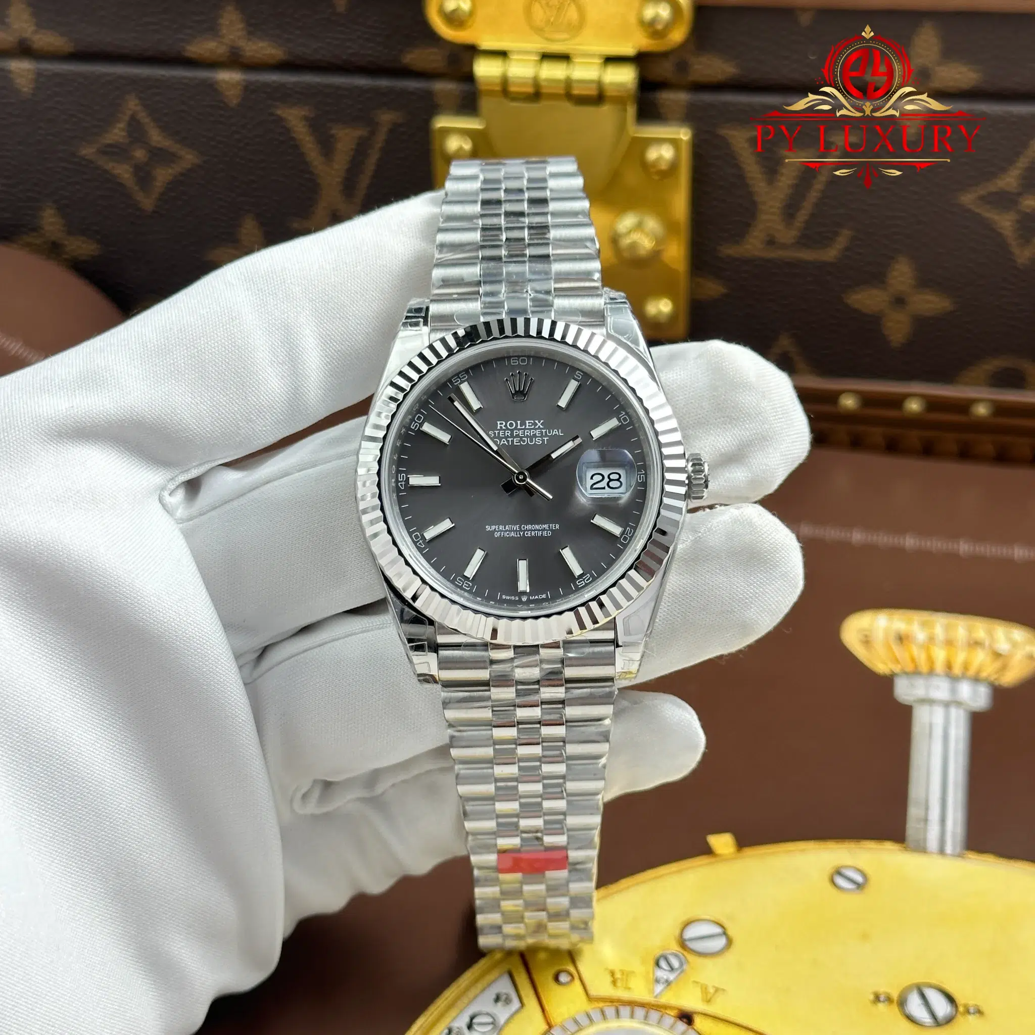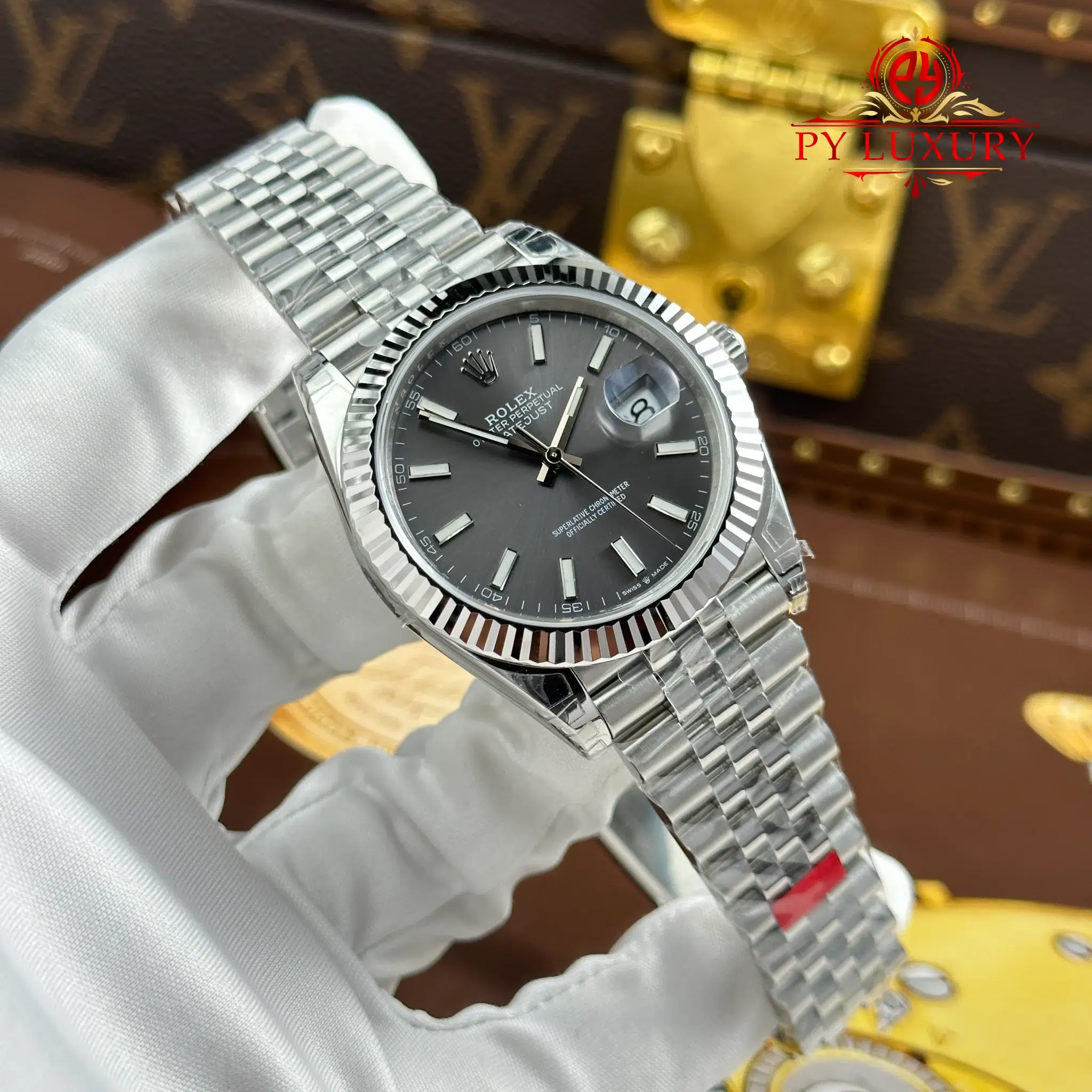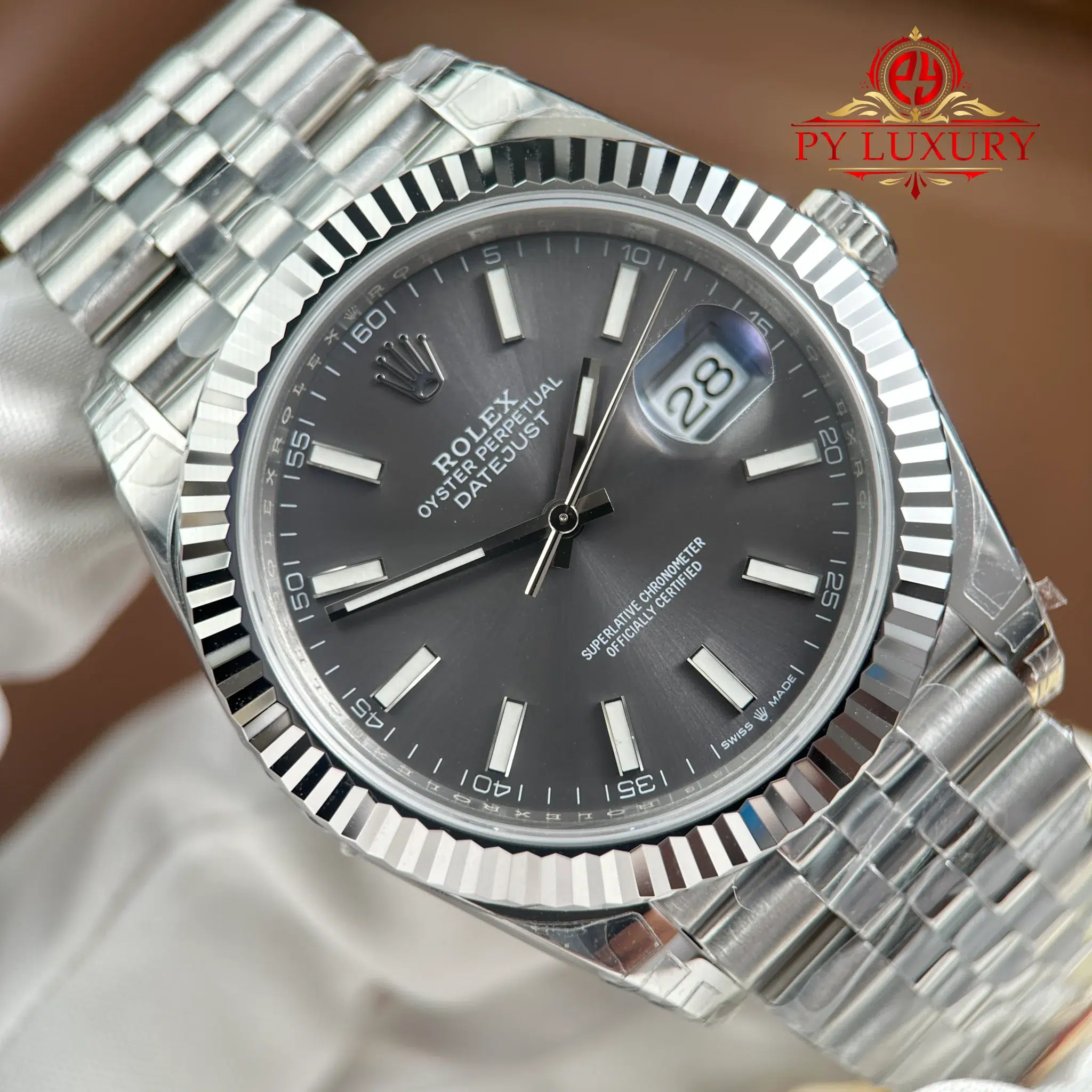 Đồng Hồ Rolex Datejust Mặt Số Xám Cọc Số Dạ Quang Dây Jubilee Replica 1:1 VSF 41mm