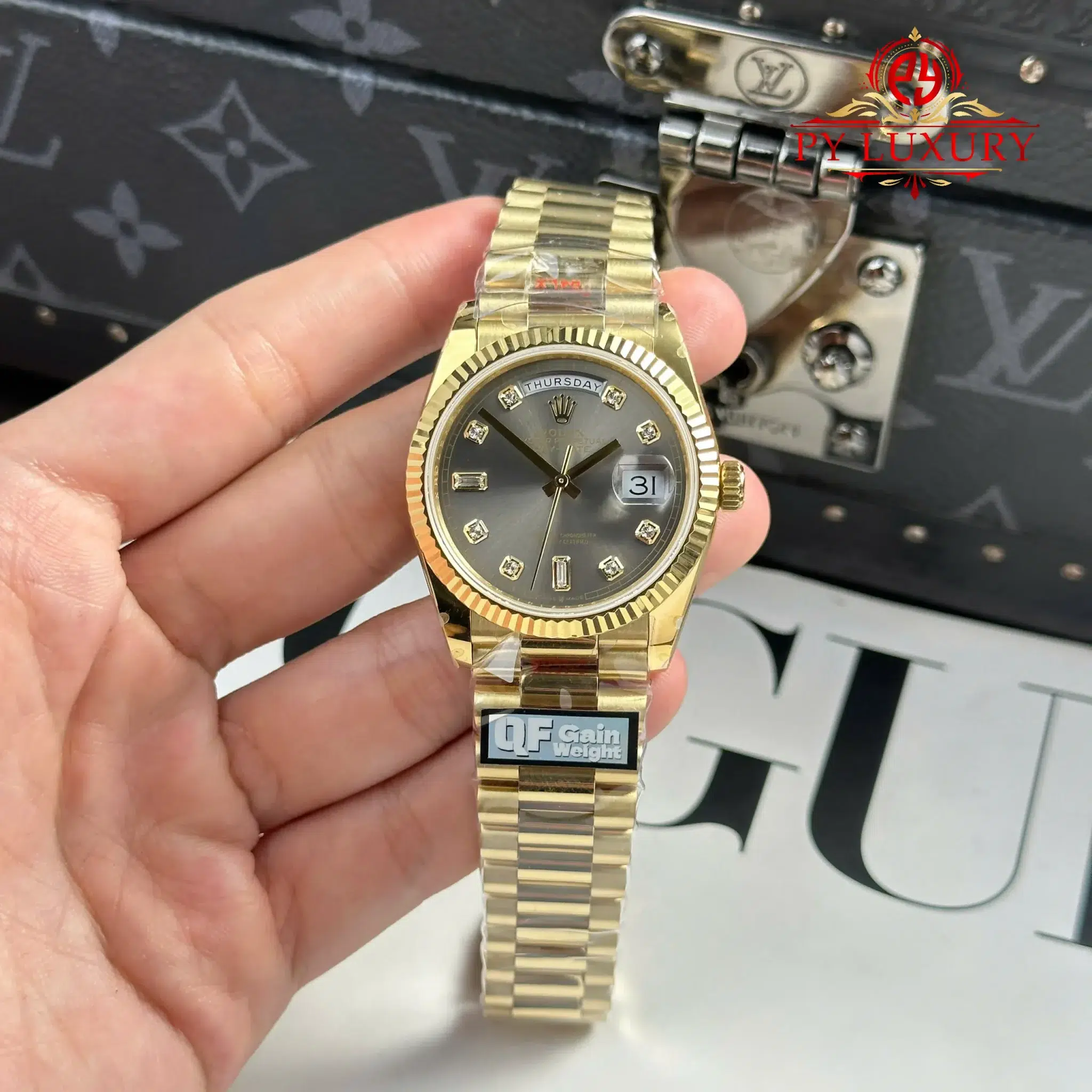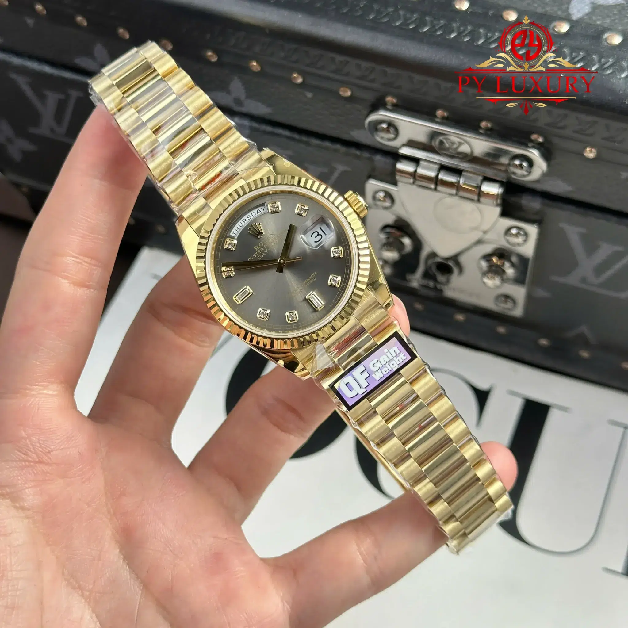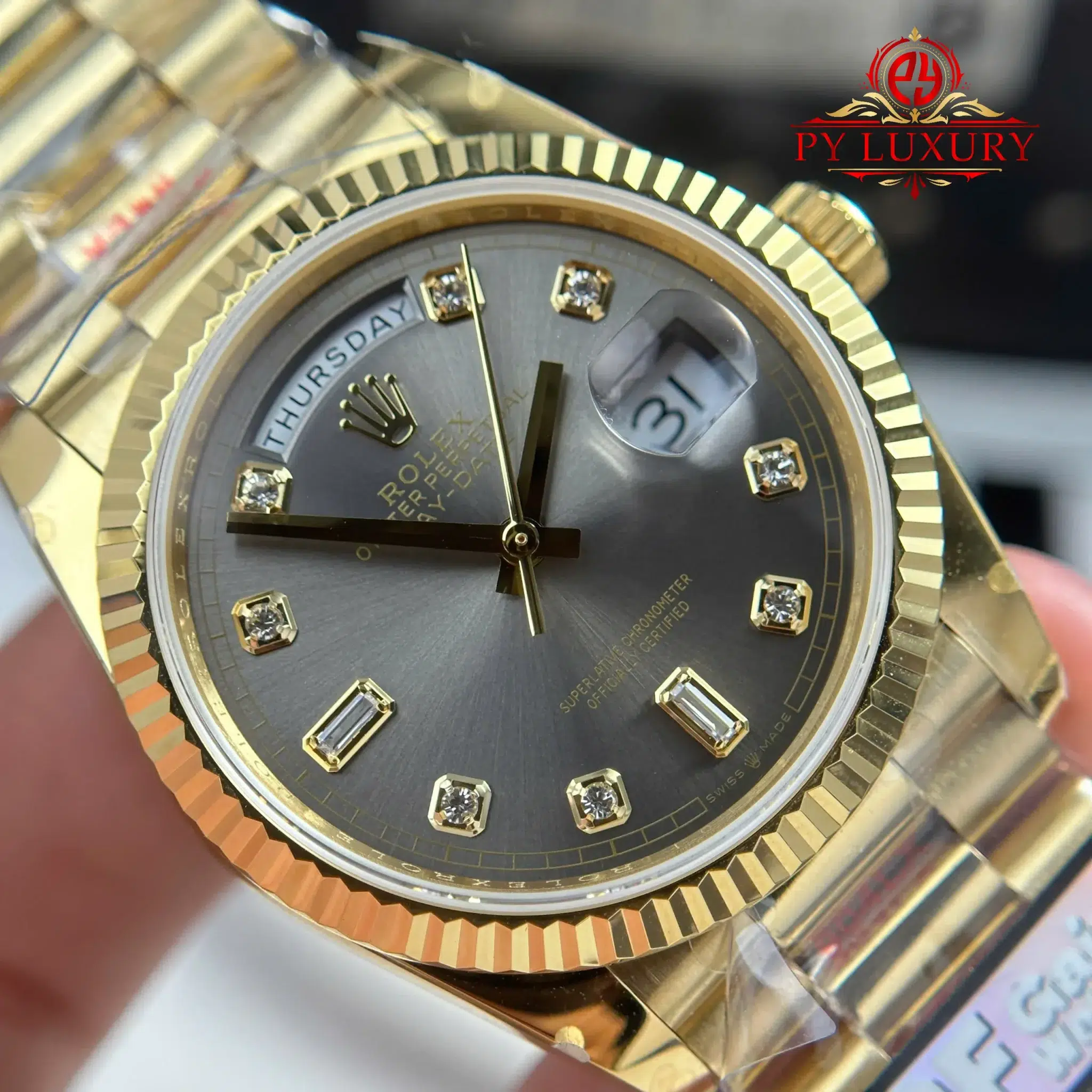 Video chi tiết Đồng Hồ Rolex Day-Date 128238-0022 Vàng Gold Mặt Xám Đậm Cọc Số Đính Đá 158g Rep 1:1 của nhà máy QF tại Py-Luxury: