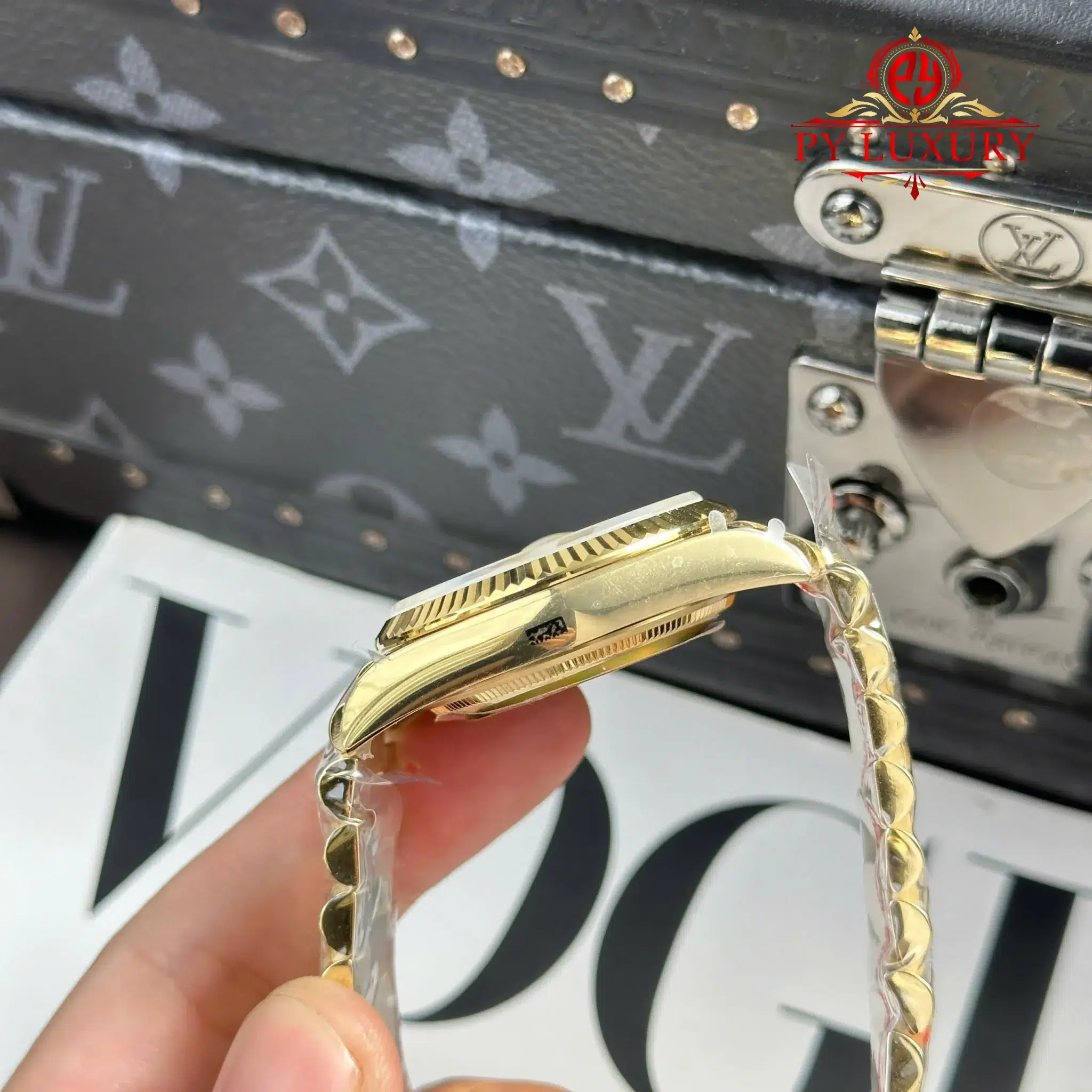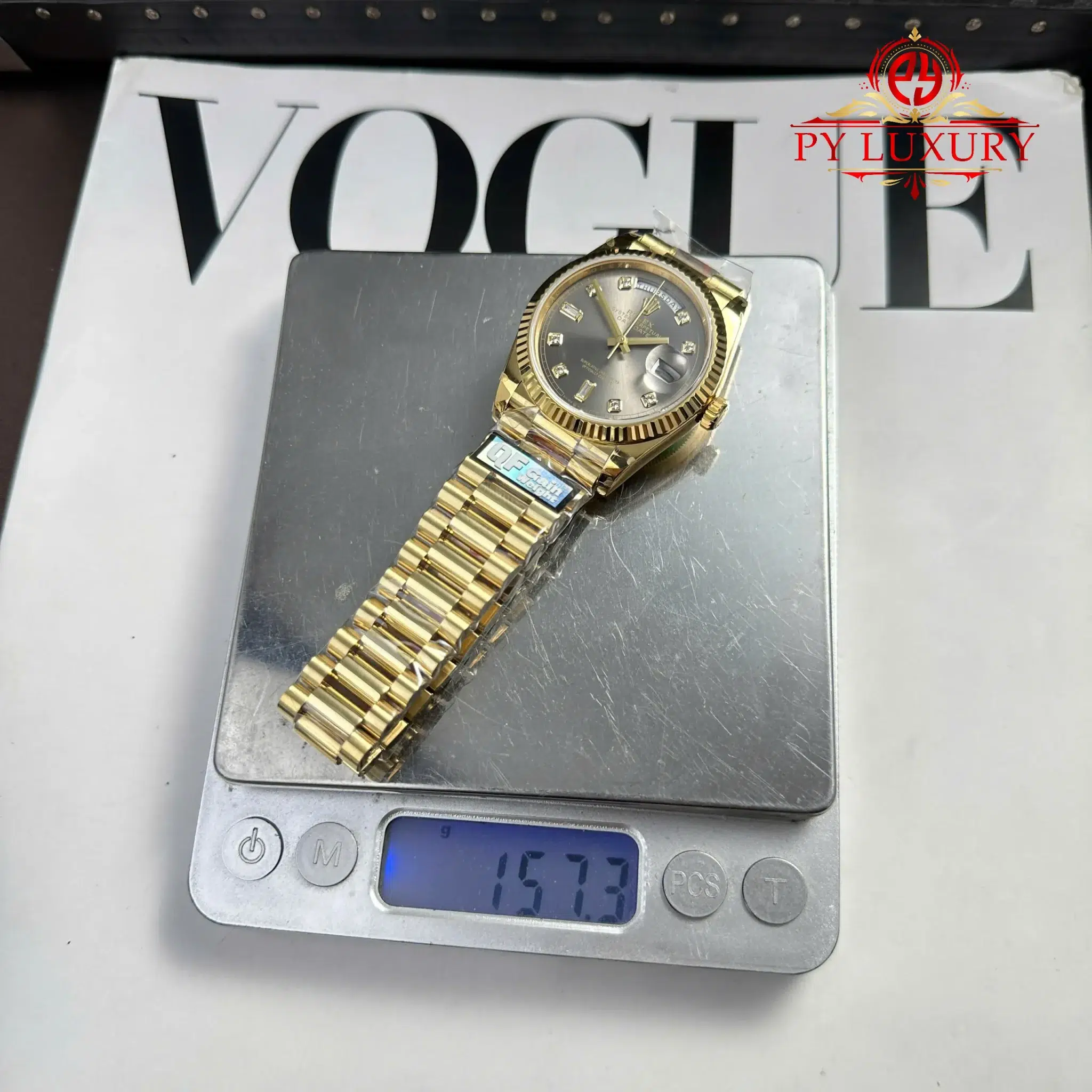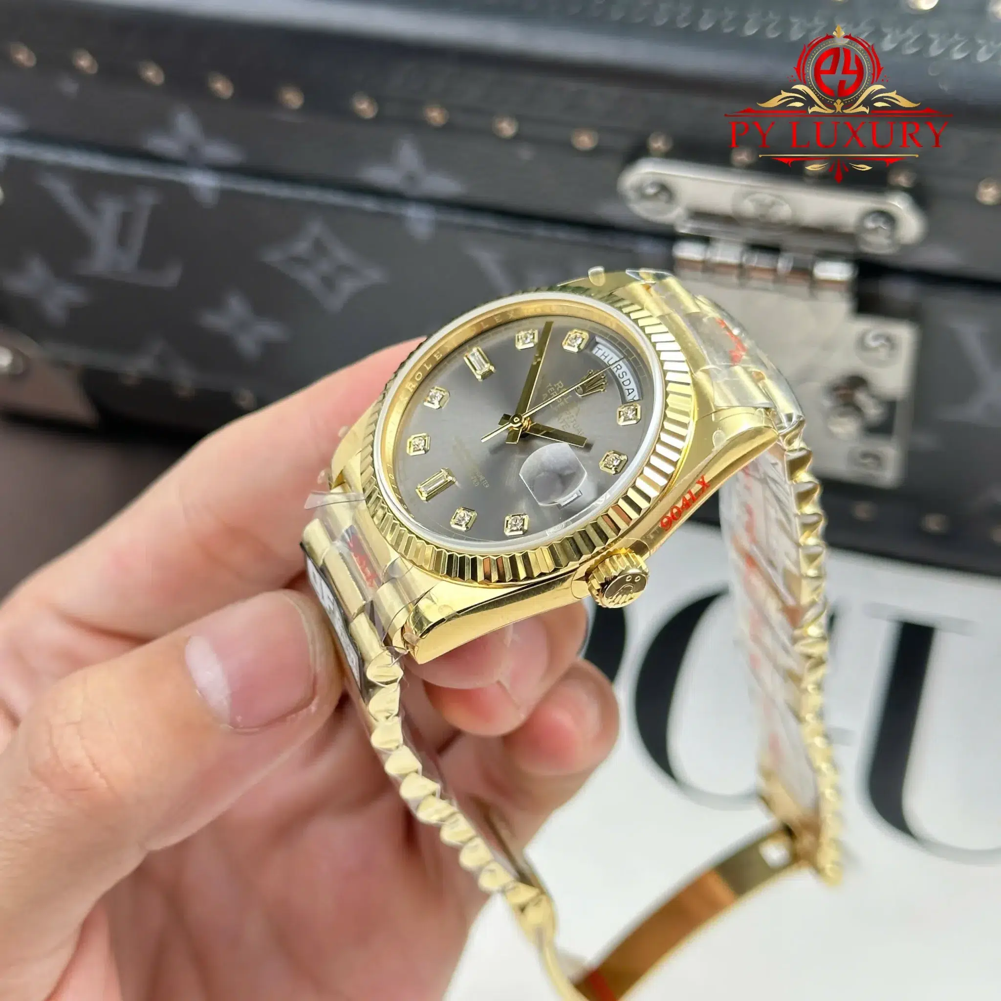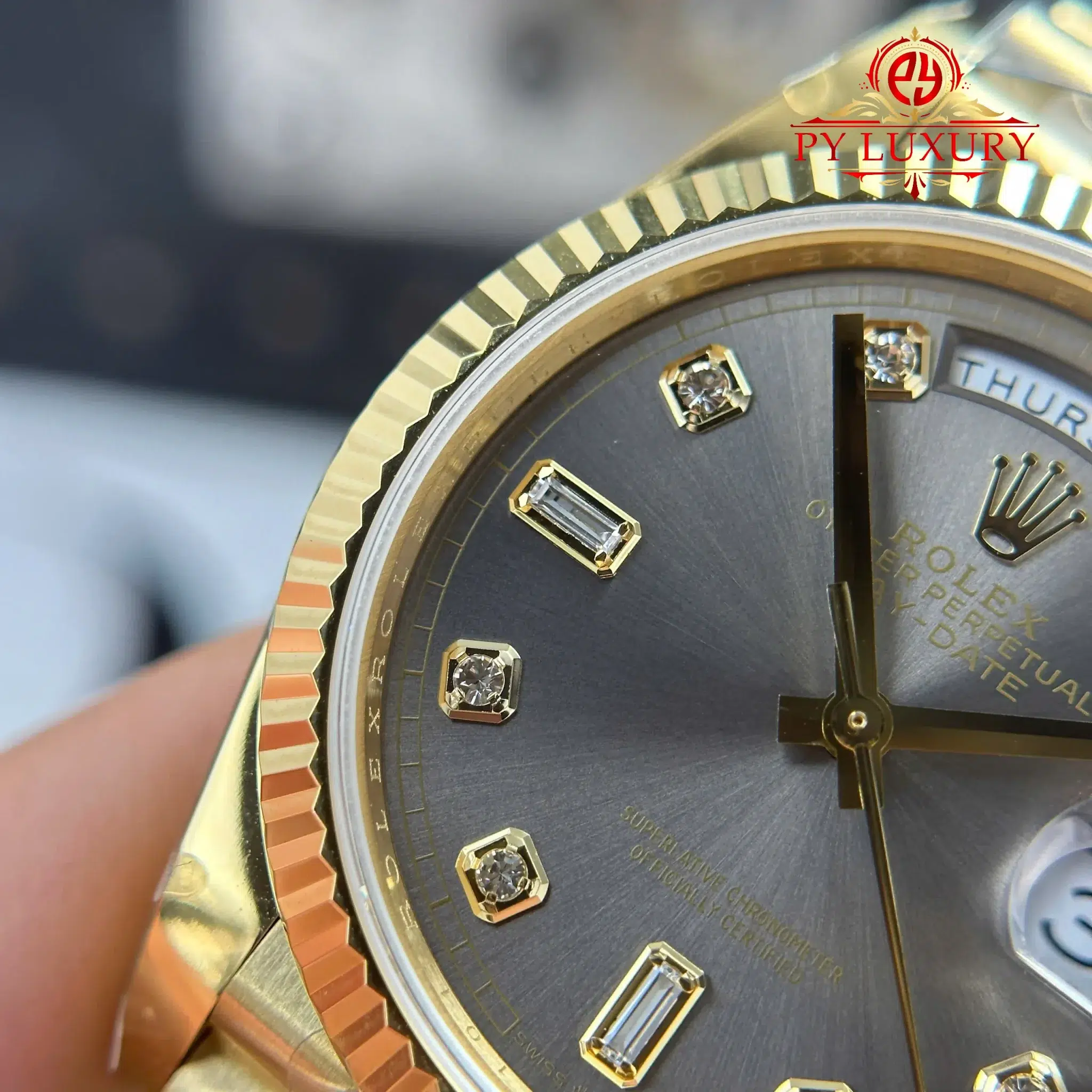 Video chi tiết Đồng Hồ Rolex Day-Date 128238-0022 Vàng Gold Mặt Xám Đậm Cọc Số Đính Đá 158g Rep 1:1 của nhà máy QF tại Py-Luxury: