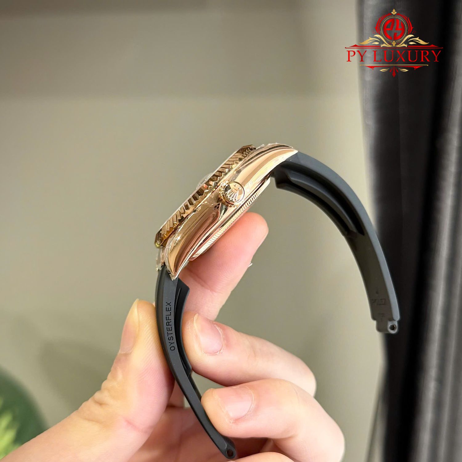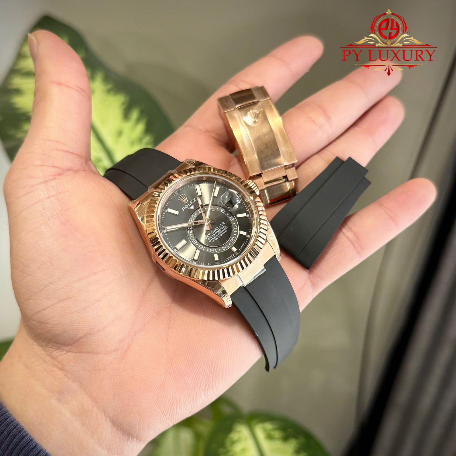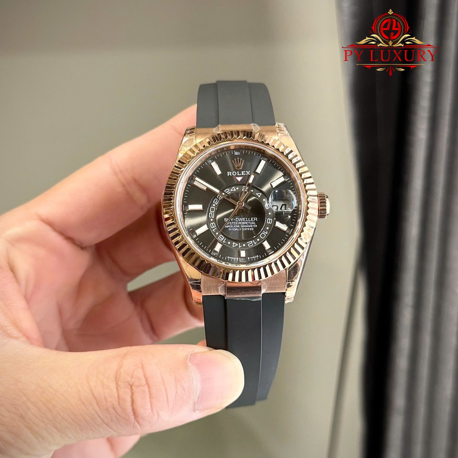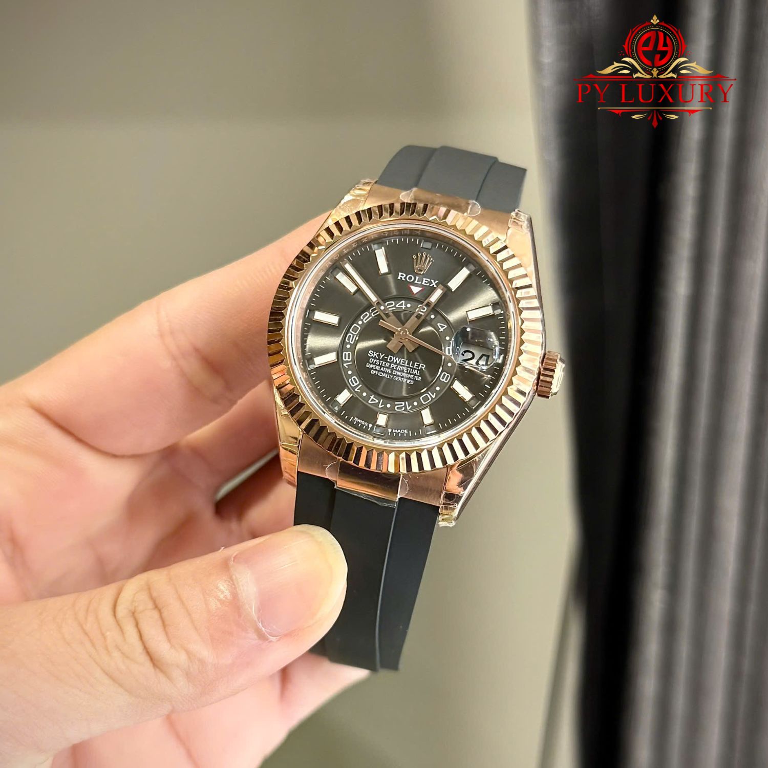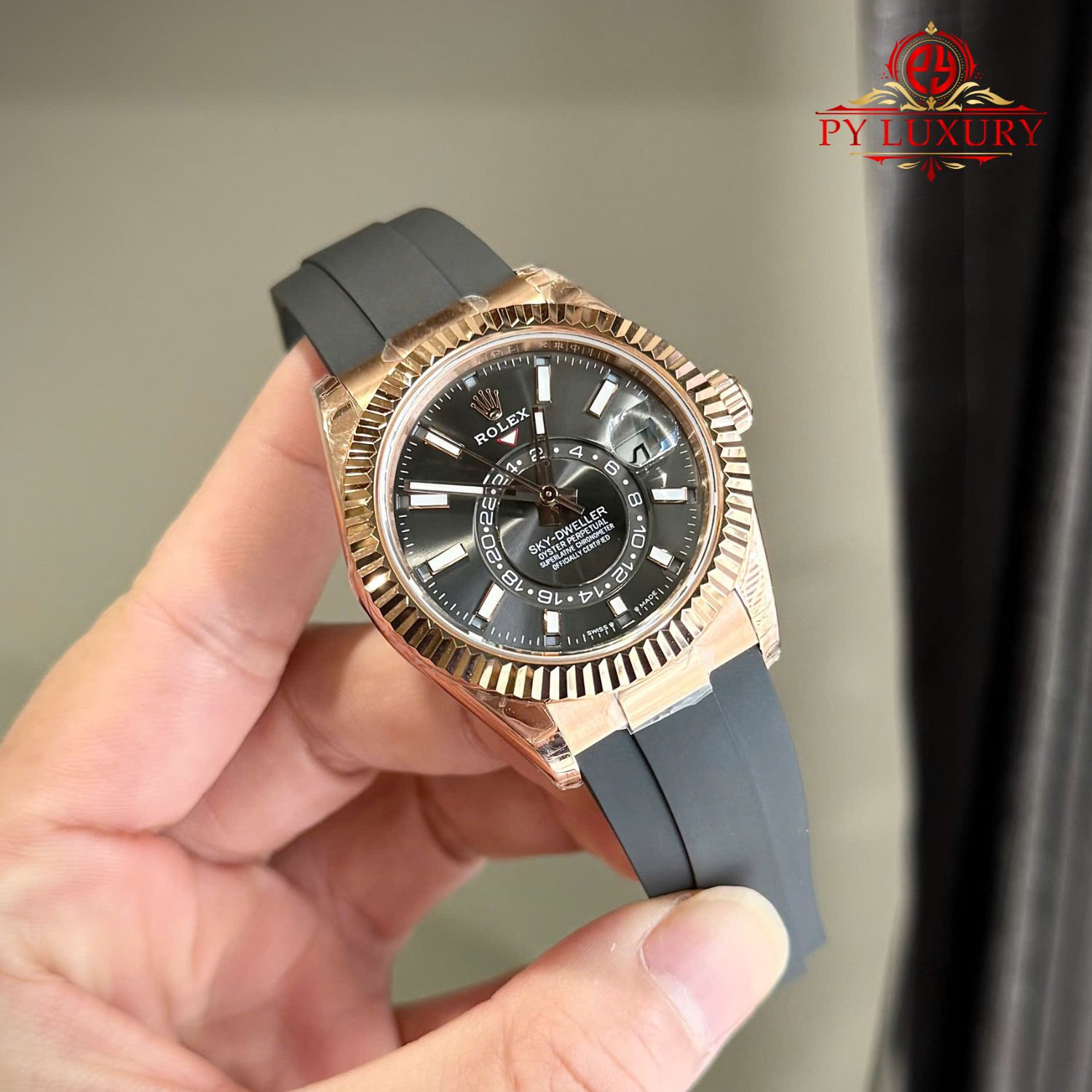 Đồng Hồ Rolex Sky-Dweller 326235 Vàng Hồng Mặt Xám Dây Cao Su Replica 42mm