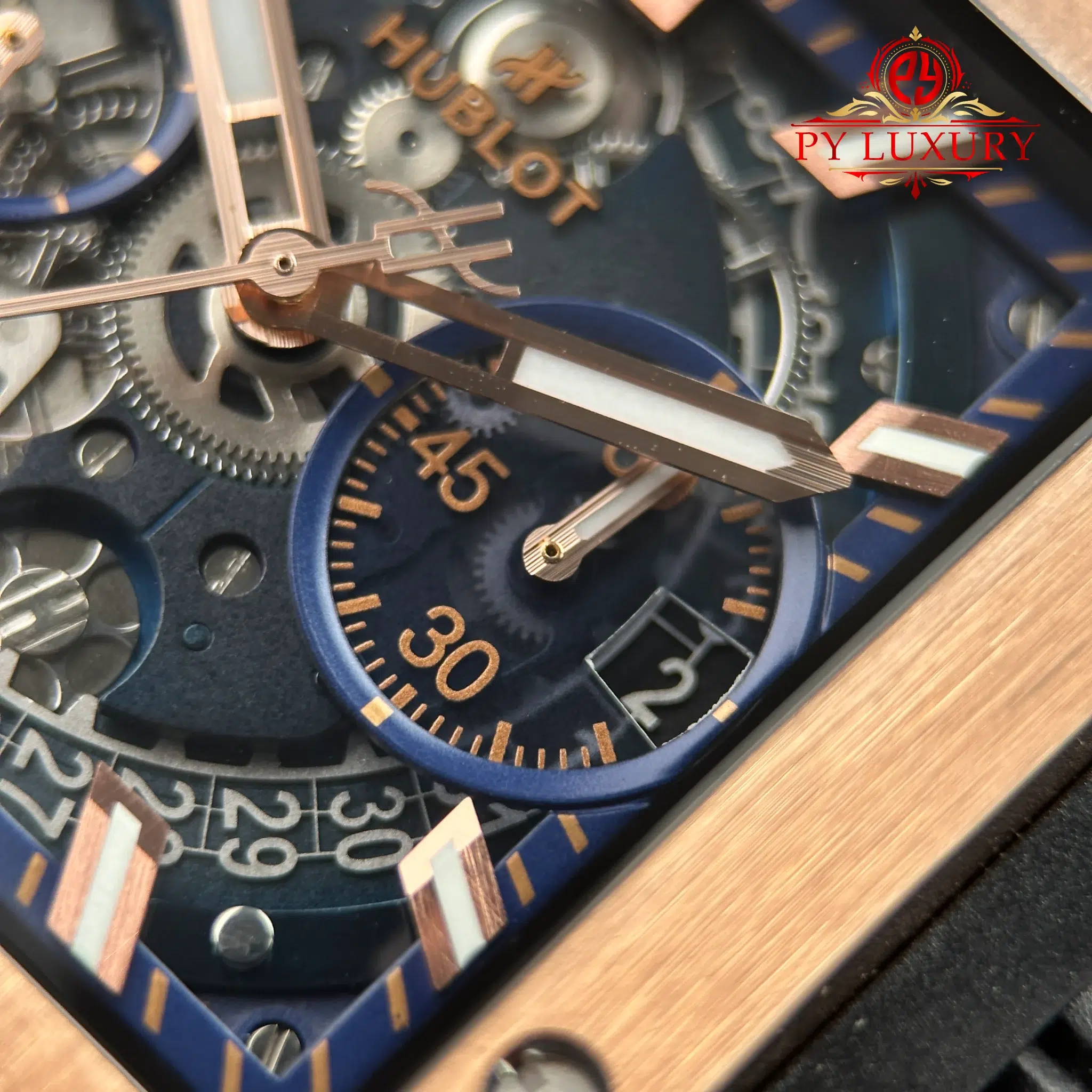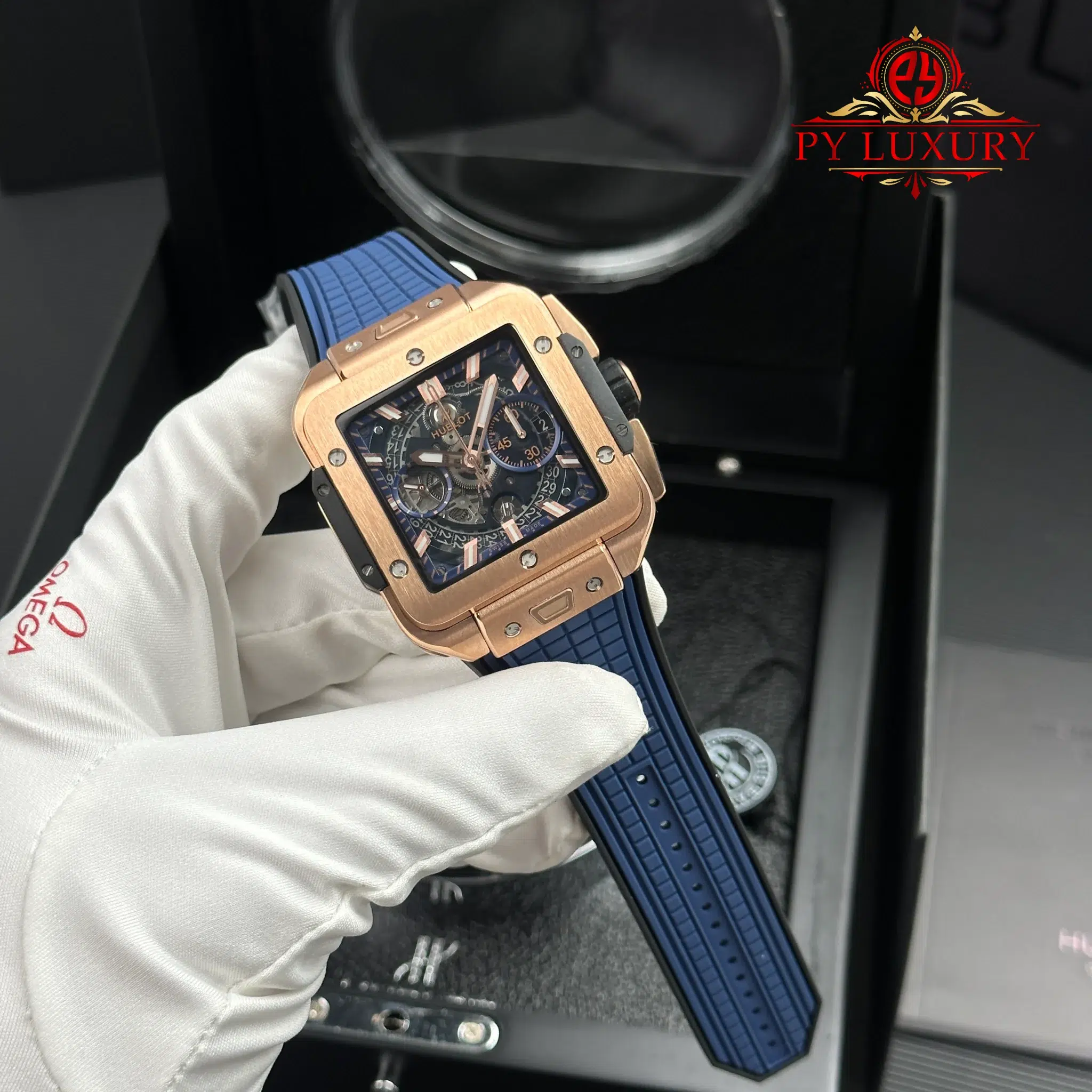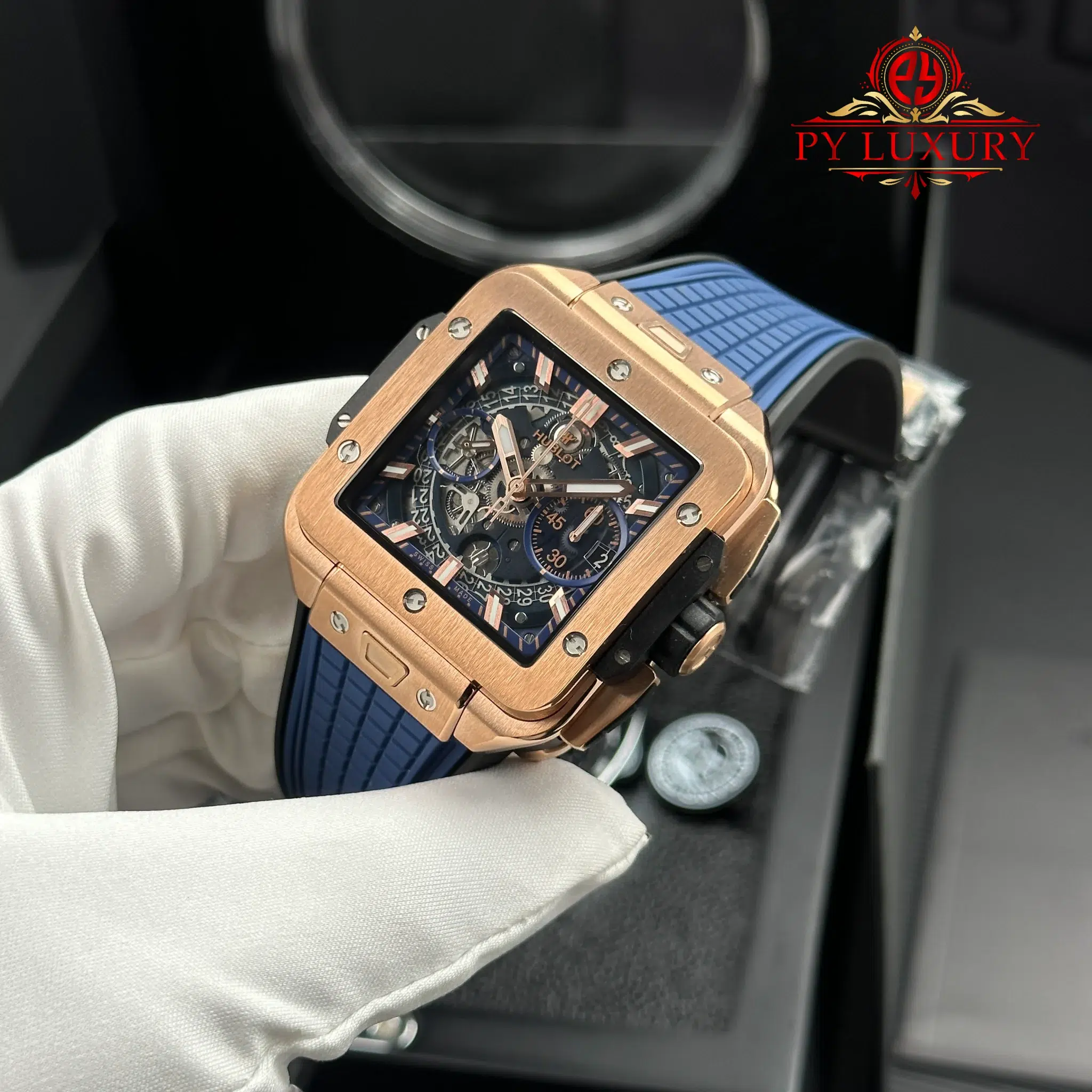 Video of the Hublot Square Bang Unico King Gold Blue Rubber Strap Best Replica BBF 42mm at Py-Luxury:
