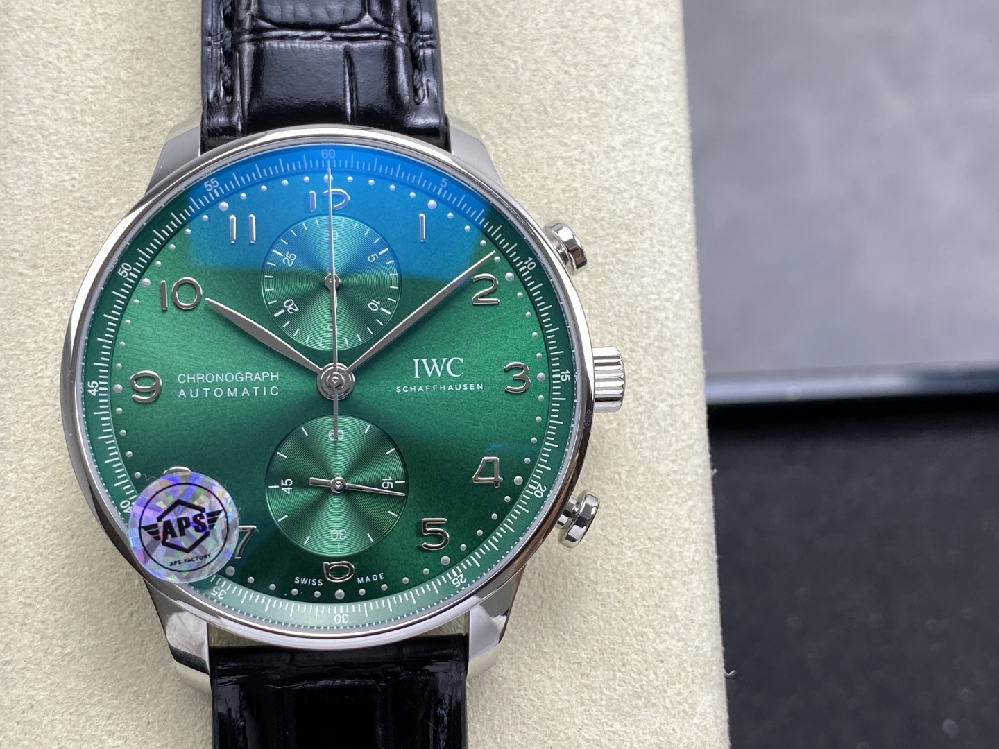 Video of the IWC Portugieser IW371615 Chronograph Green Dial Leather Strap Super Clone 41mm from APS Factory: