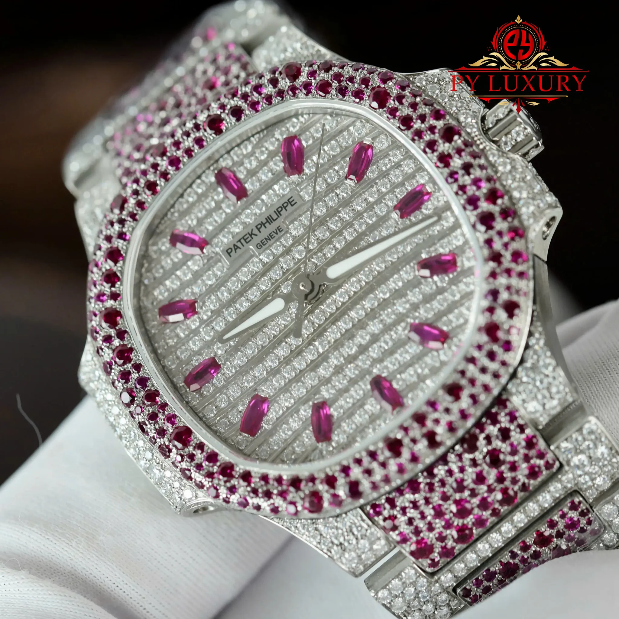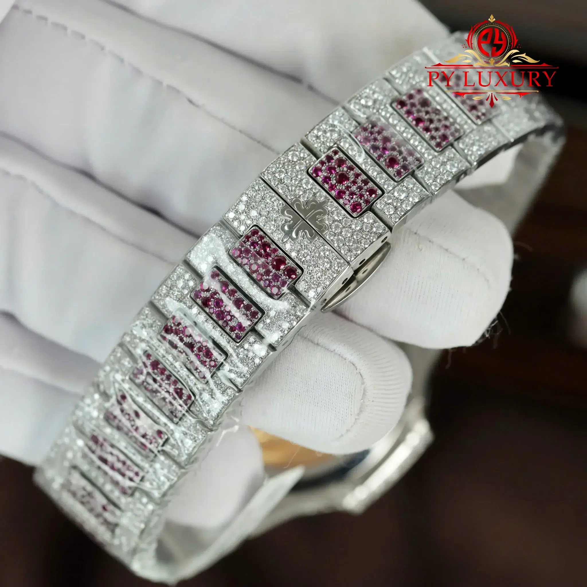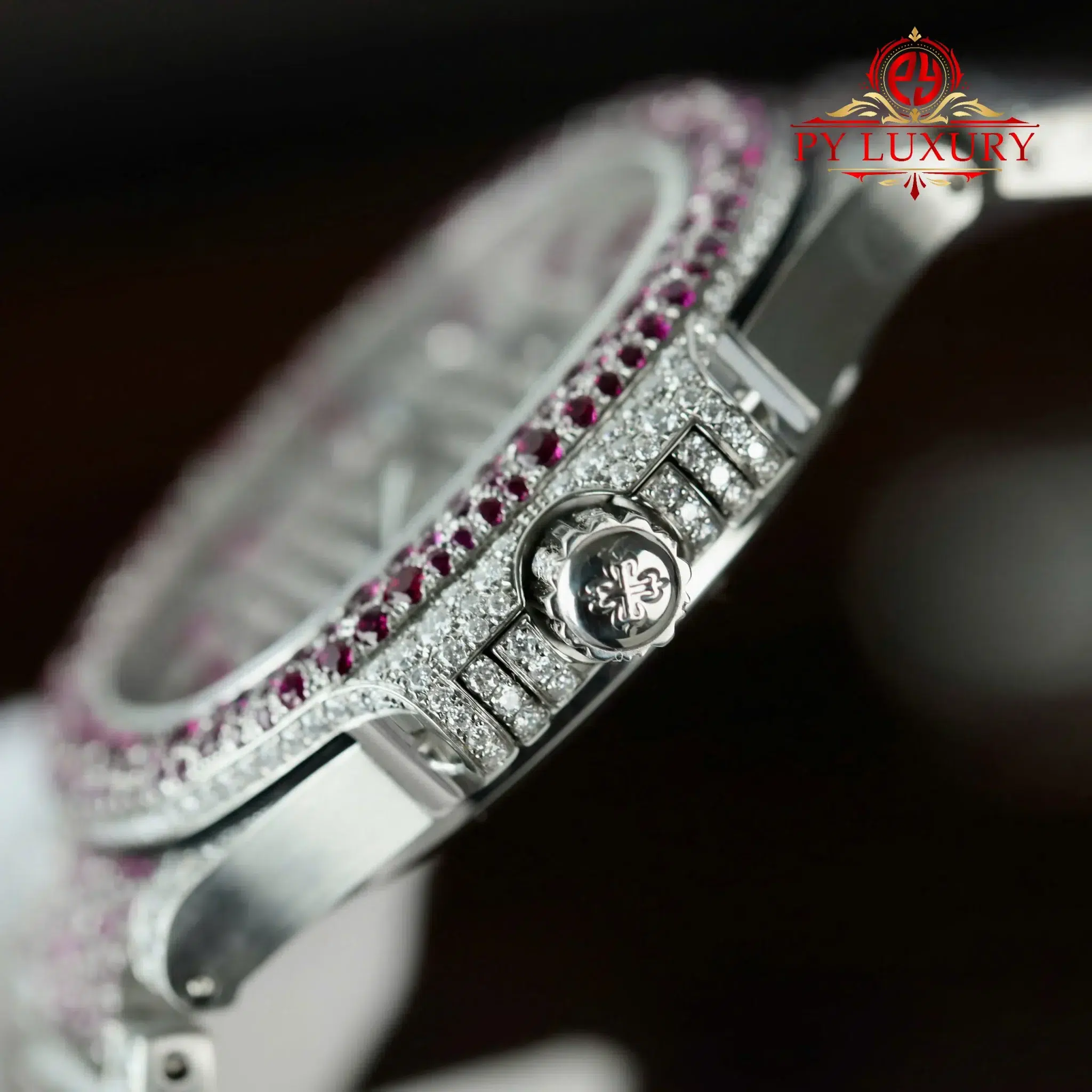 Video of the Patek Philippe Ladies Natilus 7118/1452G-001 Iced Out Moissanite & Rubies Best Replica 35.2mm at Py-Luxury:
