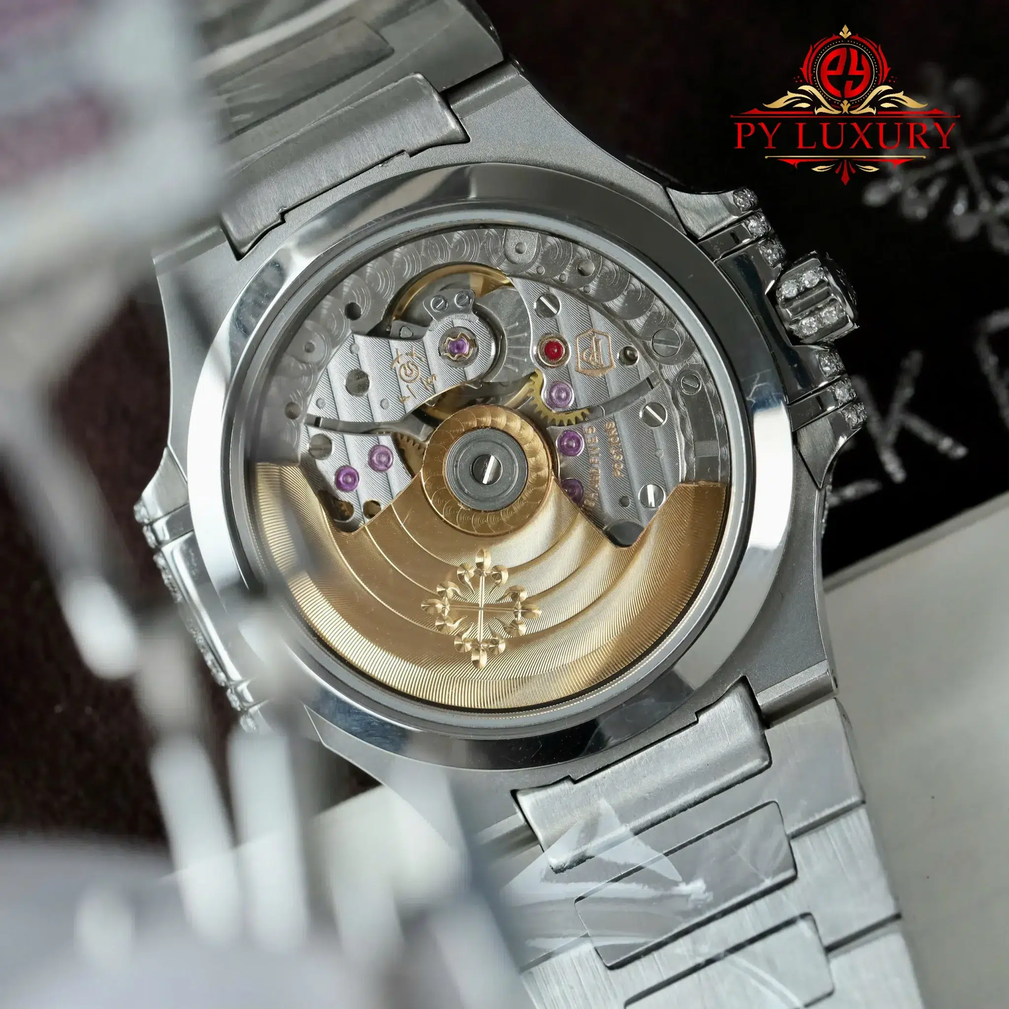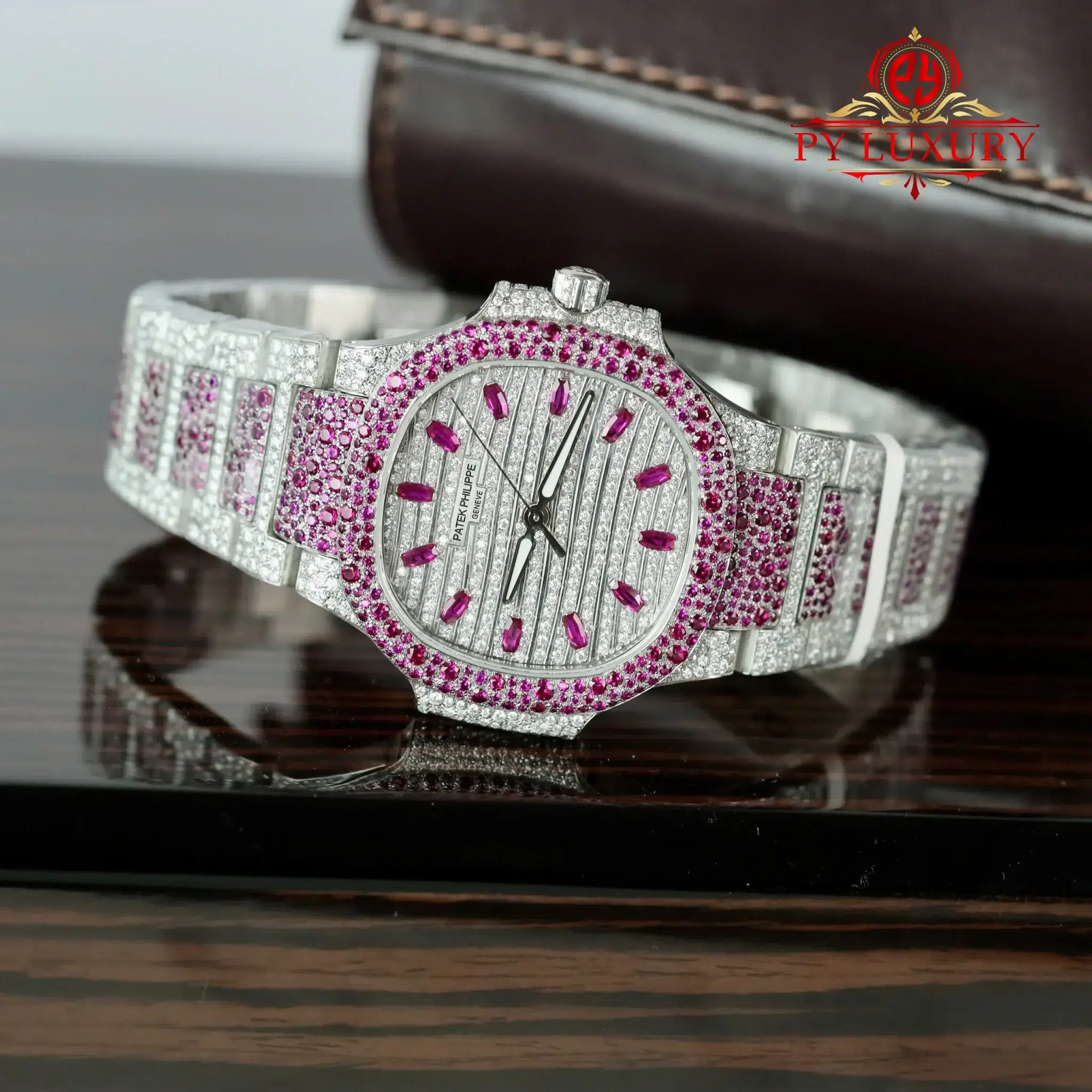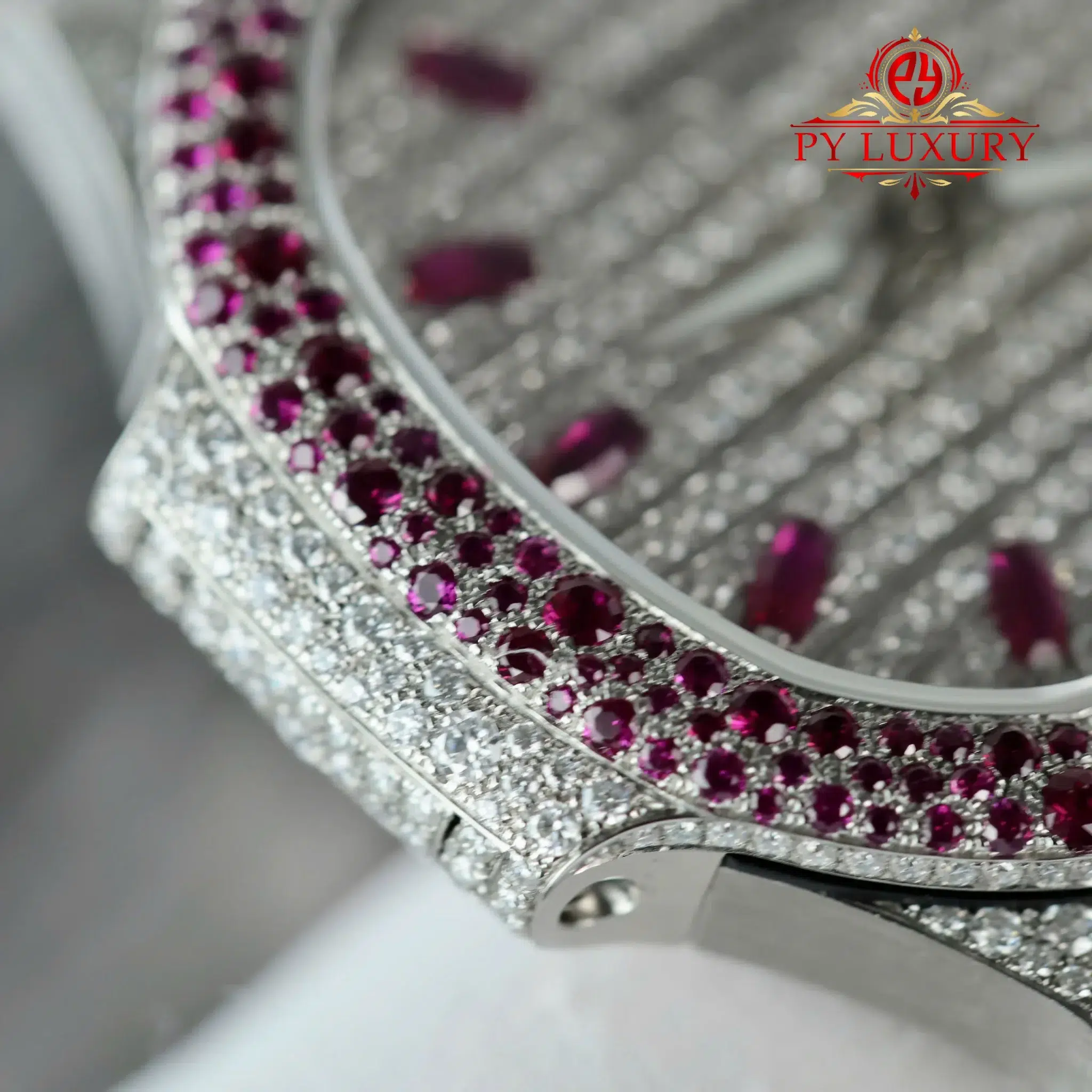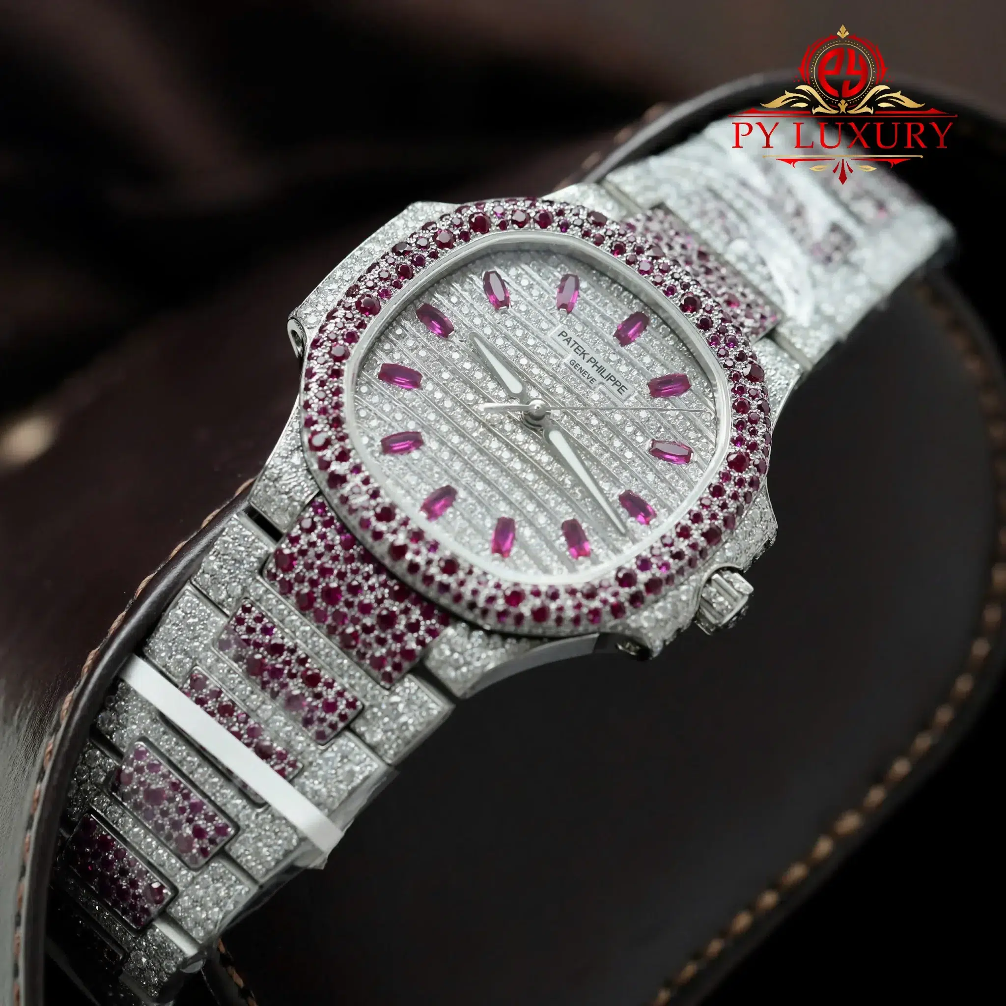 Video of the Patek Philippe Ladies Natilus 7118/1452G-001 Iced Out Moissanite & Rubies Best Replica 35.2mm at Py-Luxury: