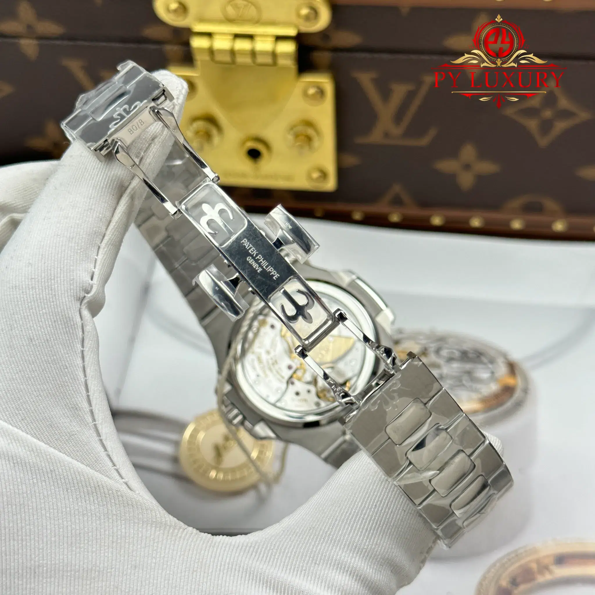 The case is crafted from premium stainless steel, exuding an air of elegance and sophistication. Instead of numerals, the Patek Philippe Nautilus 5712/1A-001 features luminescent hour markers.