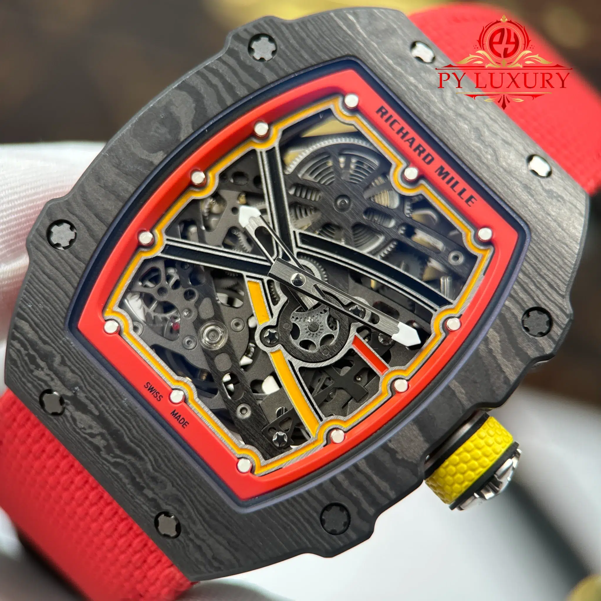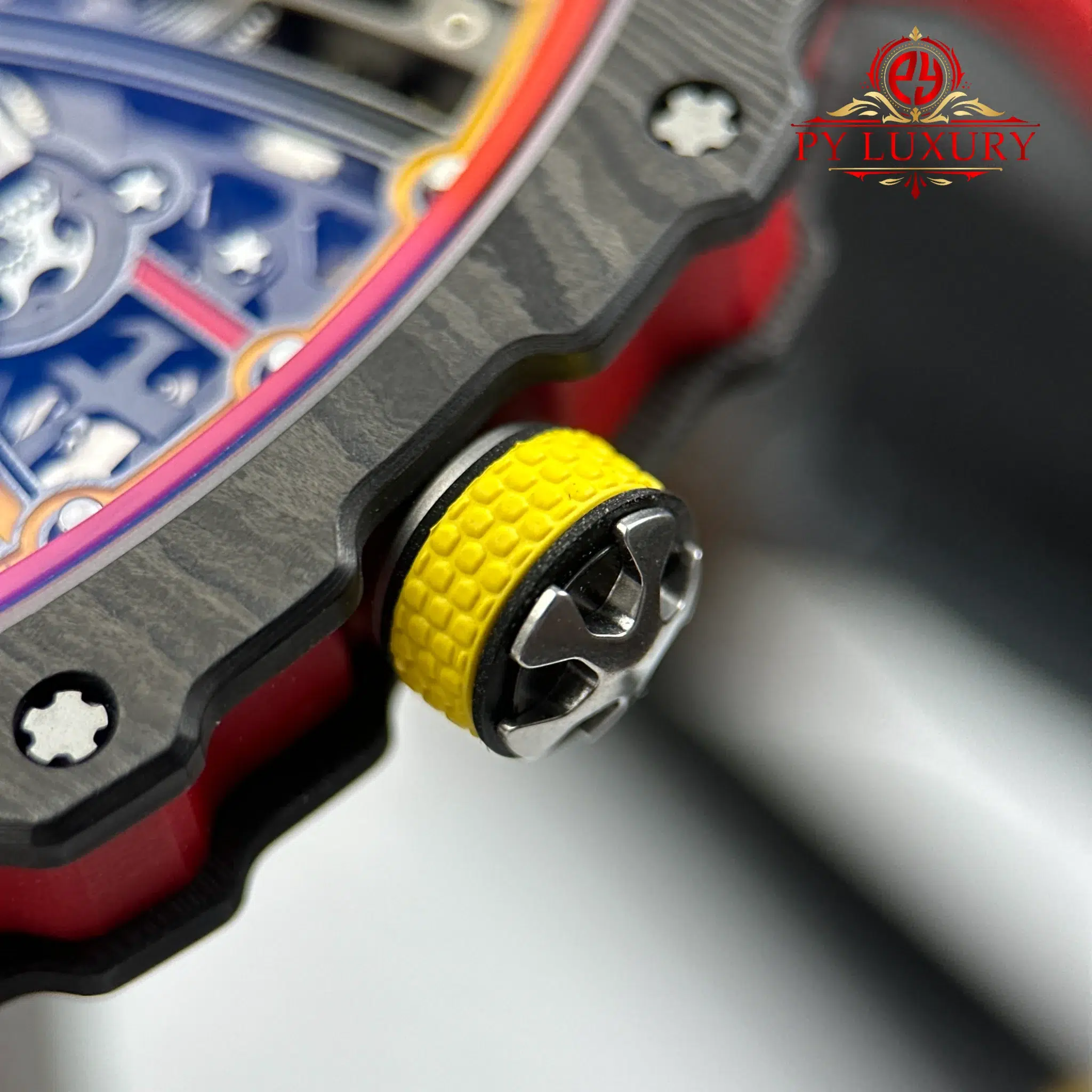 The RM67-02 Alexander Zverev Carbon NTPT 1:1 Super Clone at Py-Luxury is a flawless recreation of the special edition watch designed to honor renowned tennis player Alexander Zverev. Combining a sporty design with high-end features, this watch utilizes a case made from Carbon NTPT – an ultra-light, impact-resistant, and durable material.