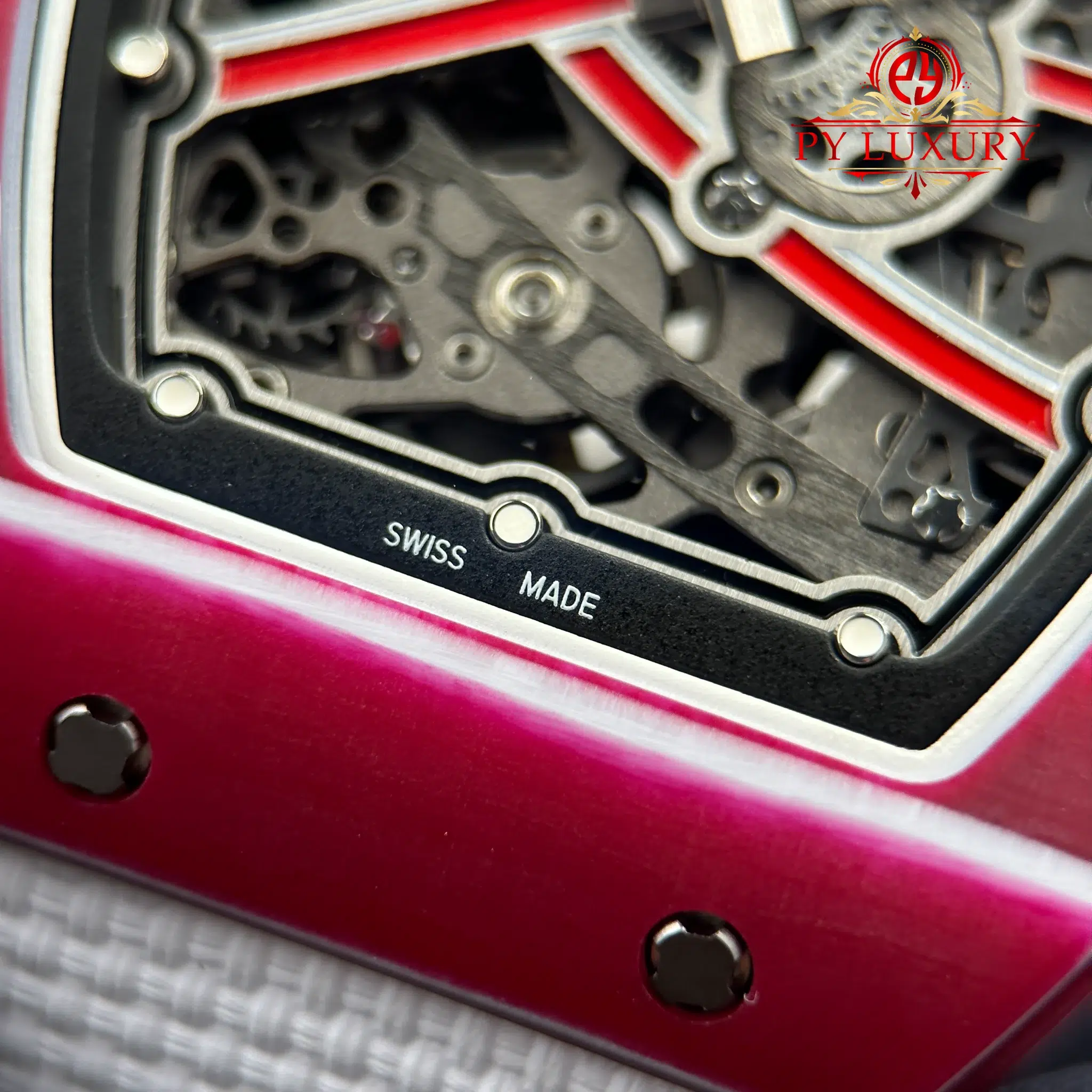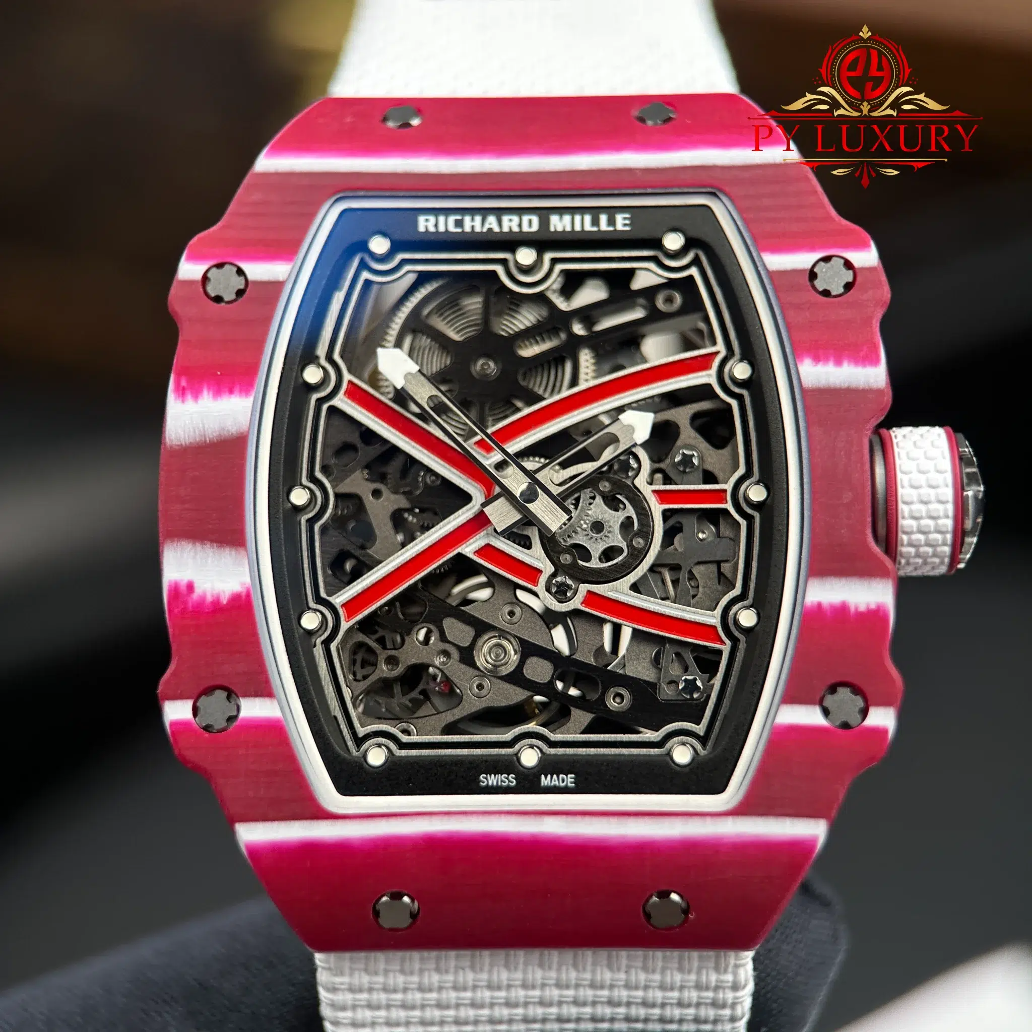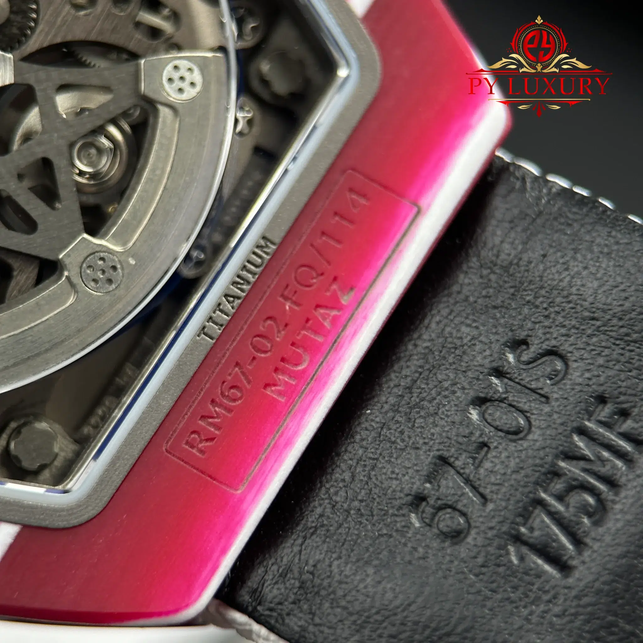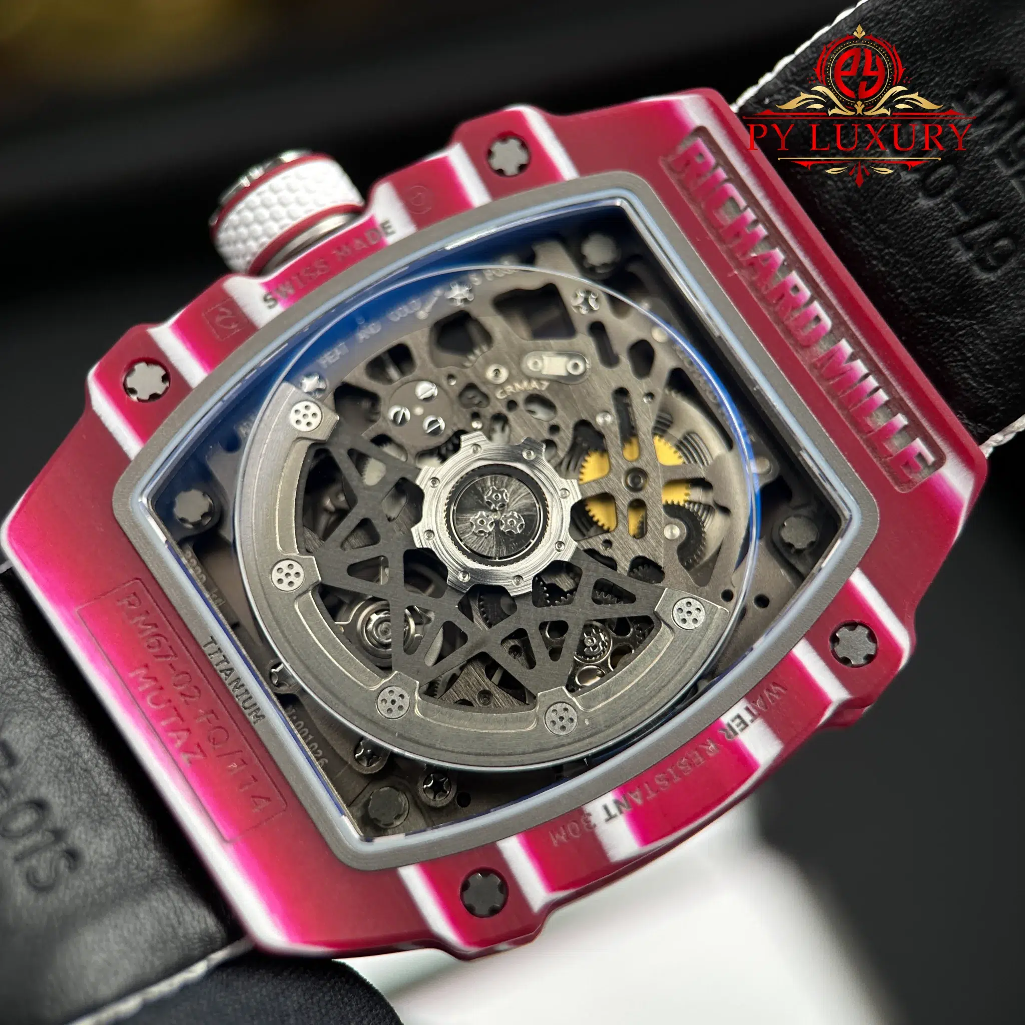 The case of the RM67-02 Mutaz Barshim Quartz TPT 1:1 super clone is crafted from Quartz TPT, a special material known for its impact resistance and high durability. This material also gives the watch a unique aesthetic and vibrant appearance. The compact size and lightweight design make it an ideal choice for both sports activities and everyday use.