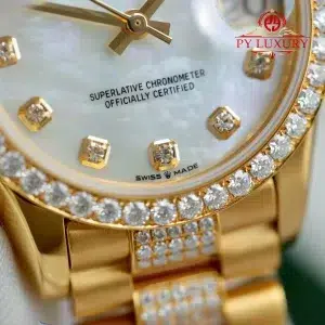 Video of the Rolex Datejust Lady 18K Yellow Gold Plated Custom Natural MOP Dial Moissanite Bezel Moissanite Bracelet Best Replica 31mm at Py-Luxury: