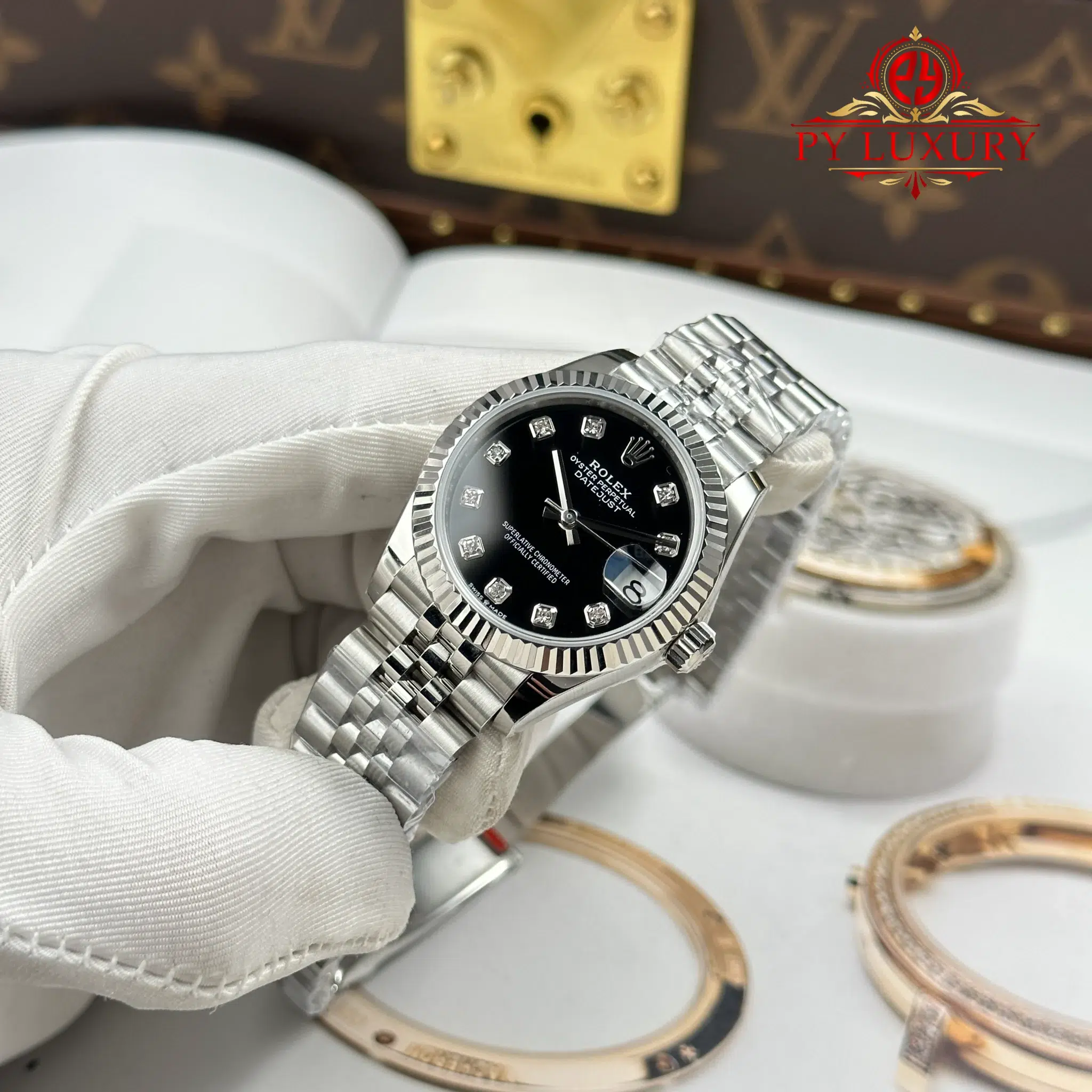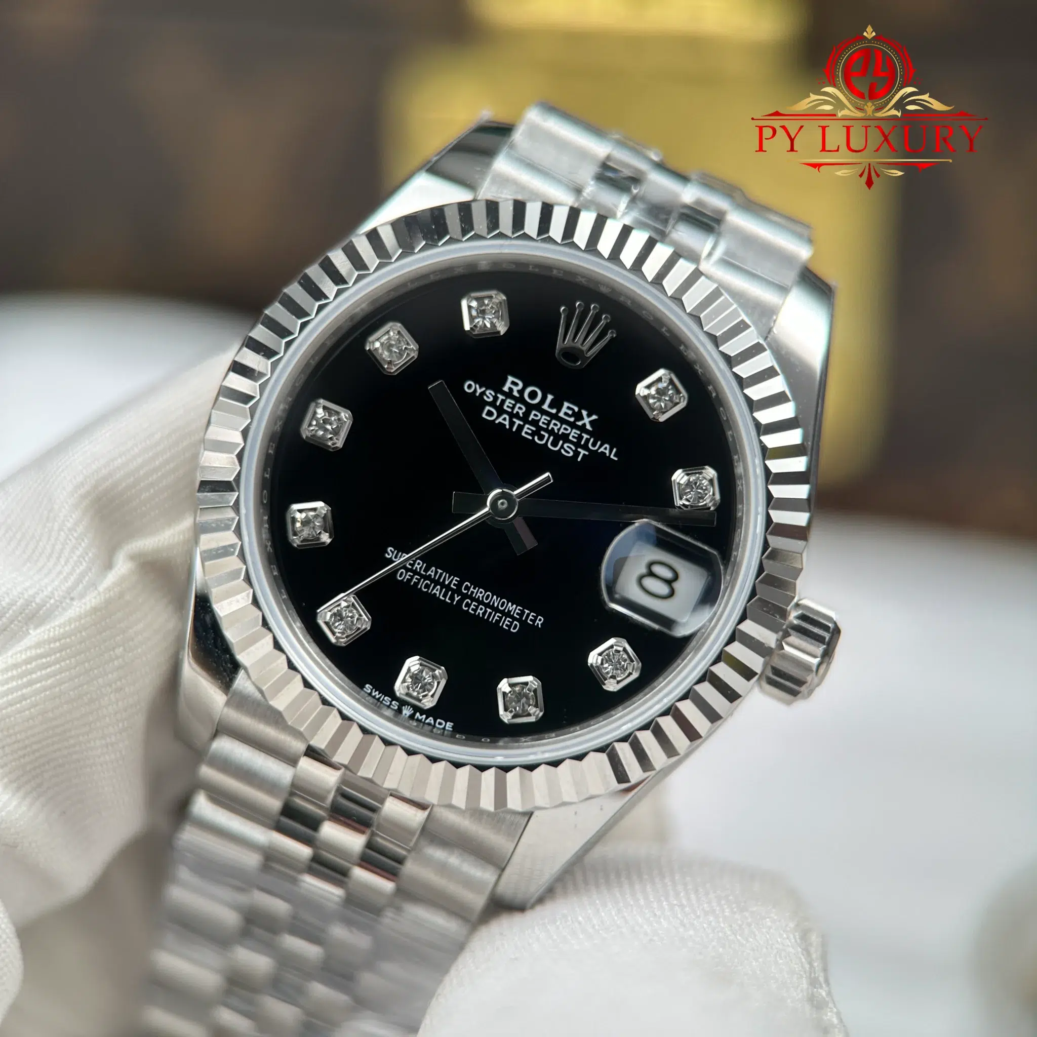 Video of the Rolex Datejust Lady Black Diamond Dial Fluted Bezel Jubilee Bracelet Best Replica 31mm from AR Factory at Py-Luxury: