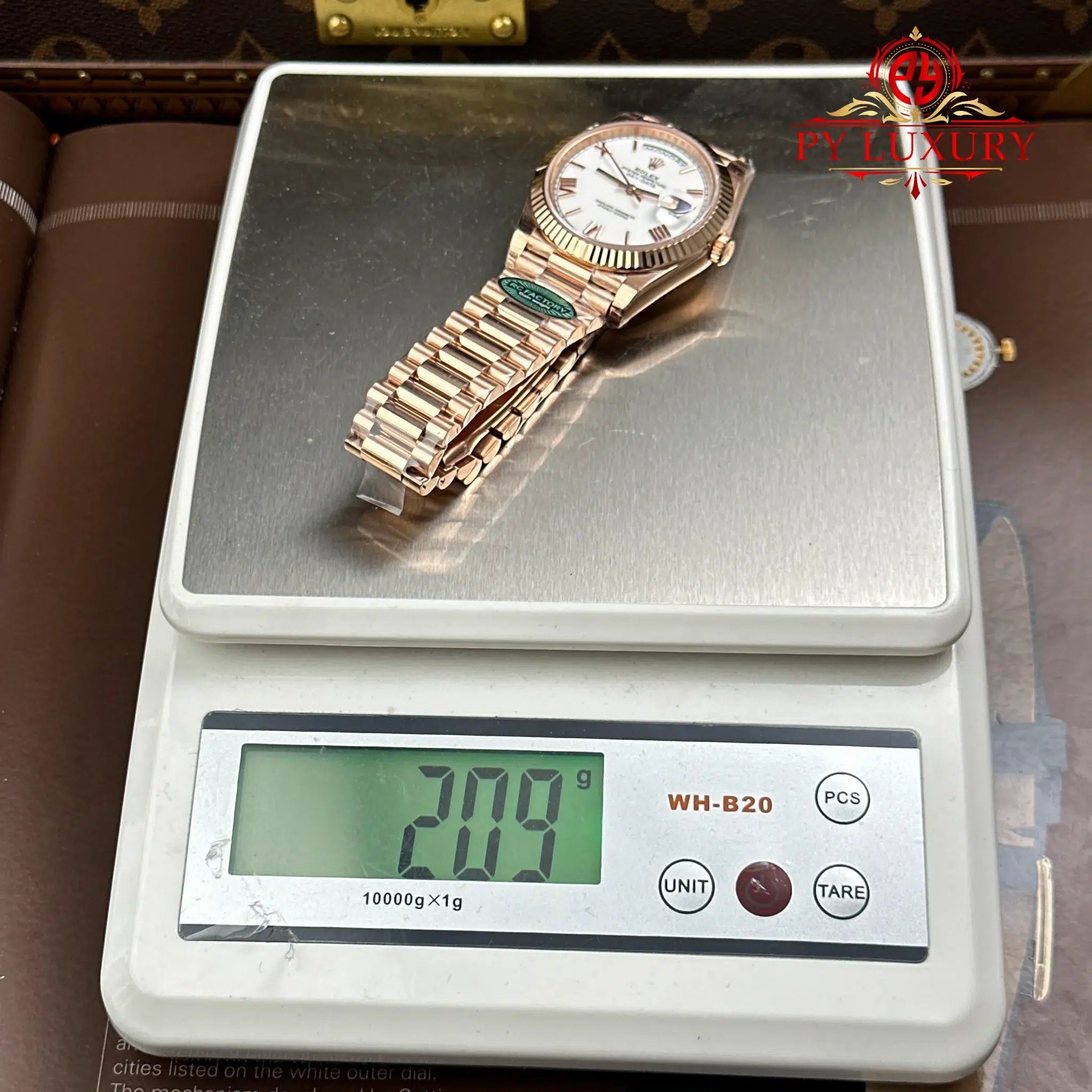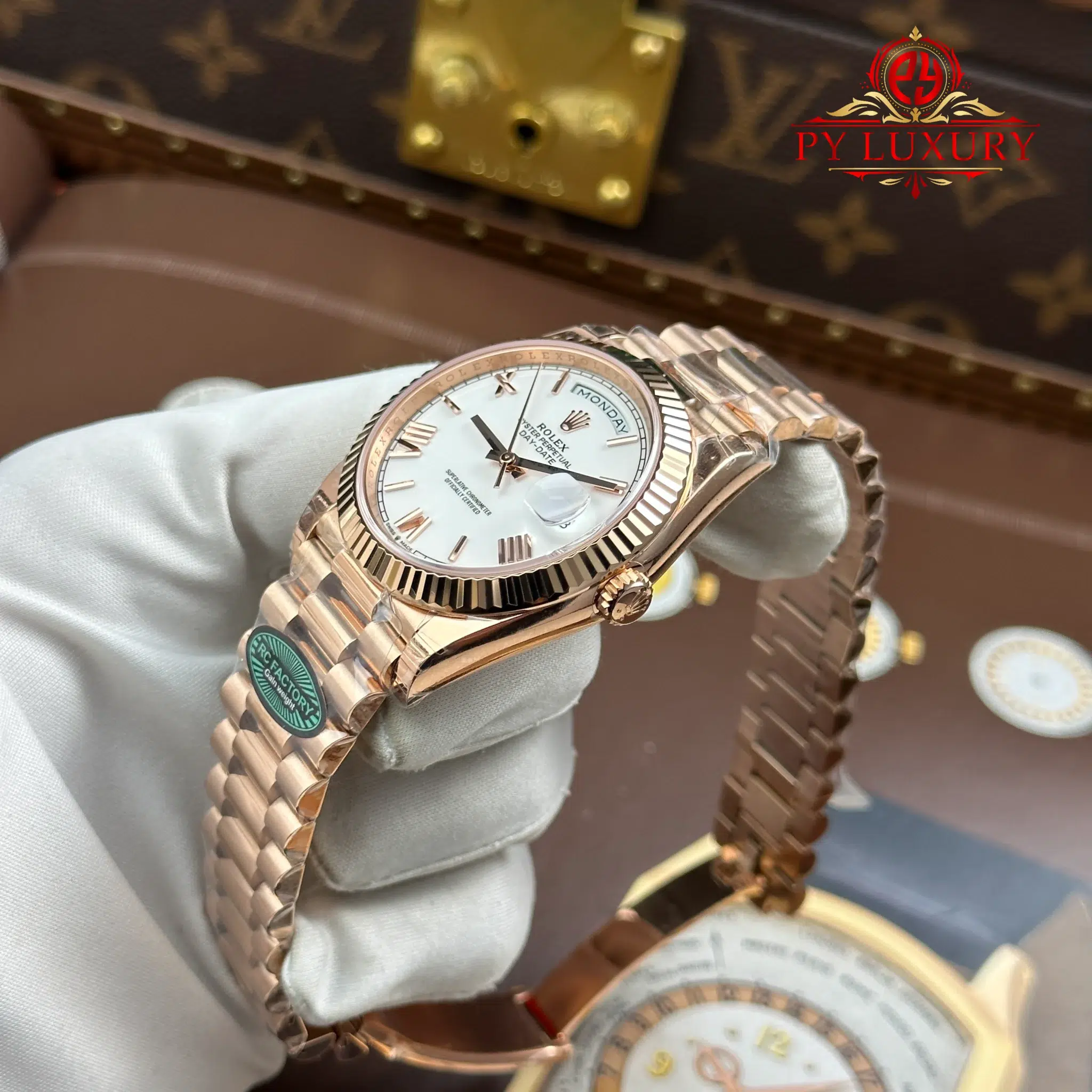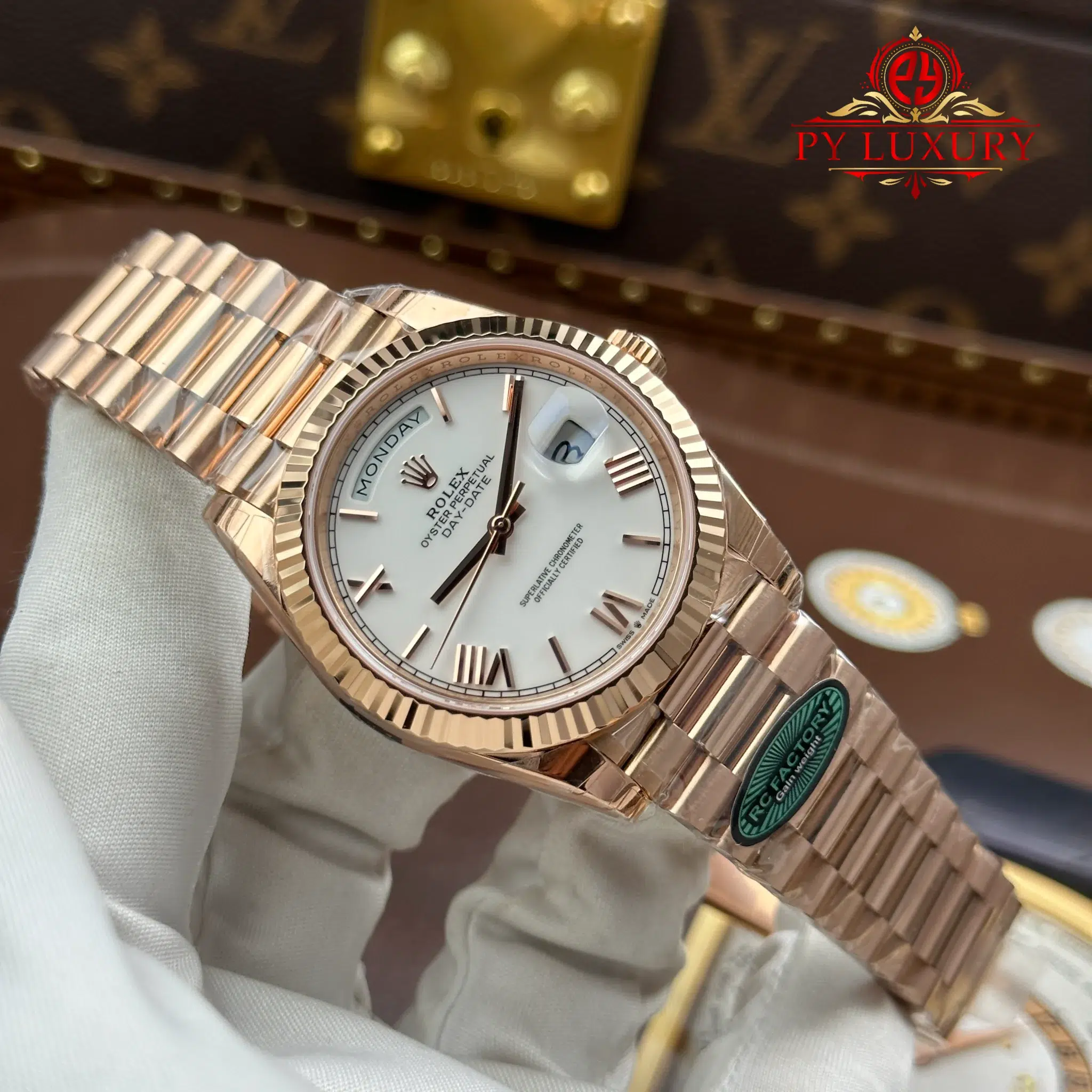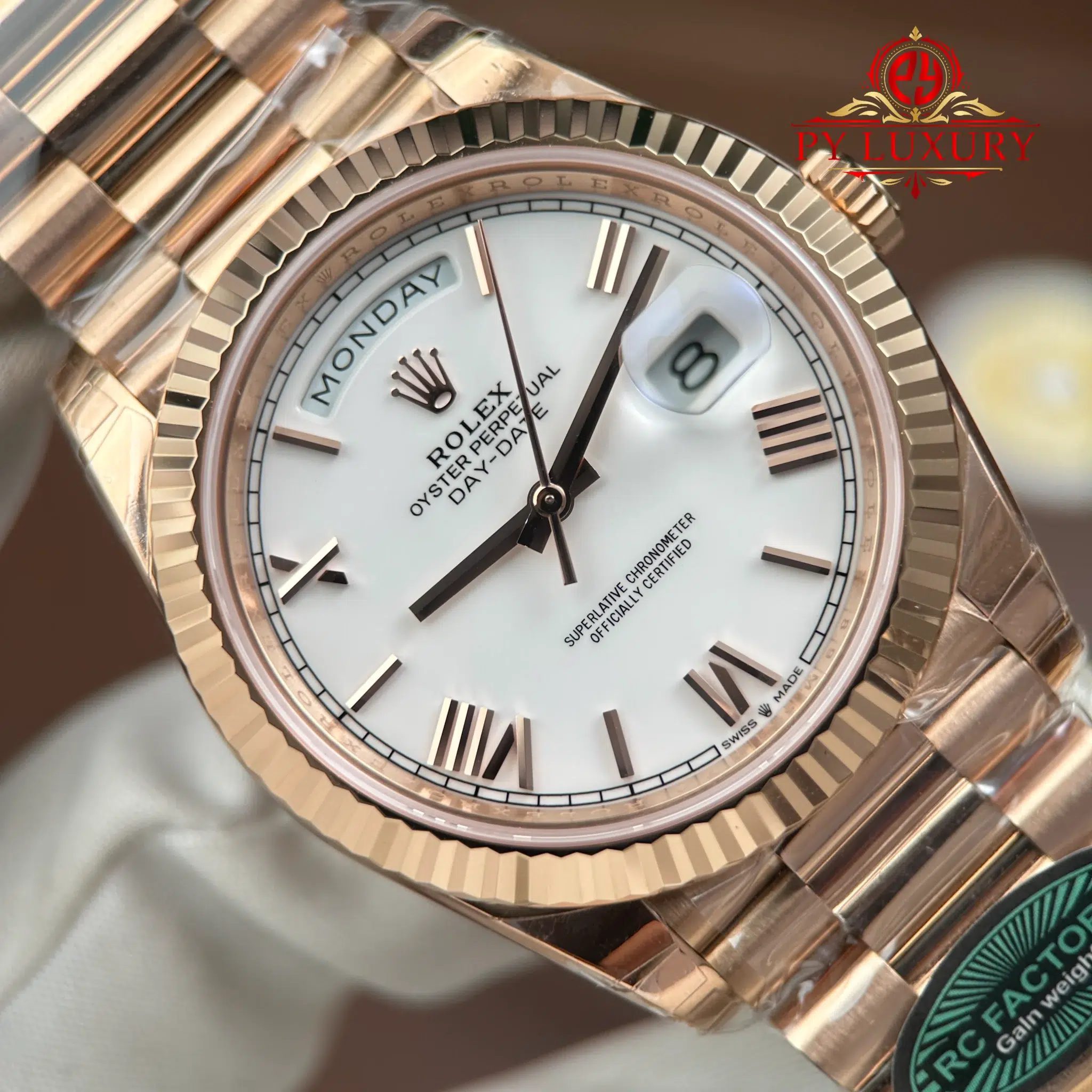 Video of the Rolex Day-Date 228235-0032 Rose Gold White Roman Dial 1:1 Top Quality Super Clone 210g from RC Factory at Py-Luxury: