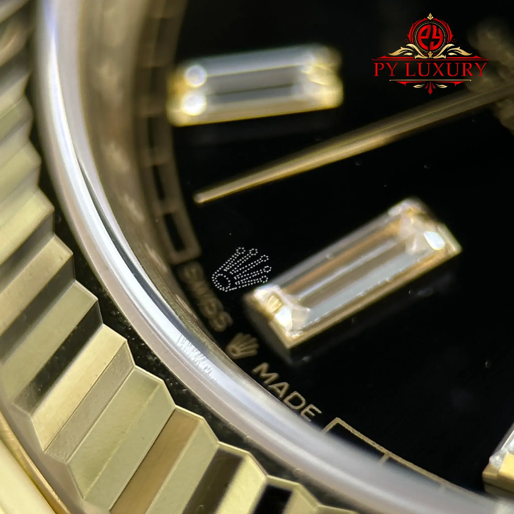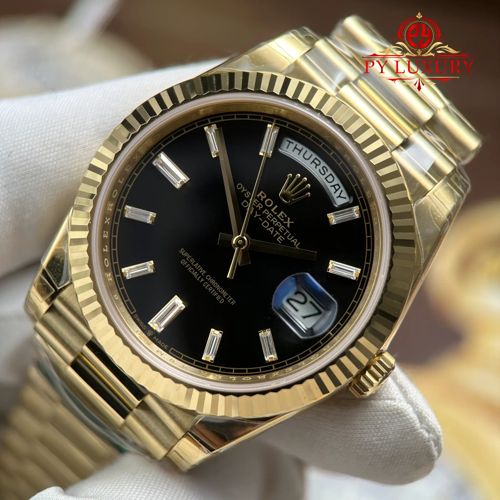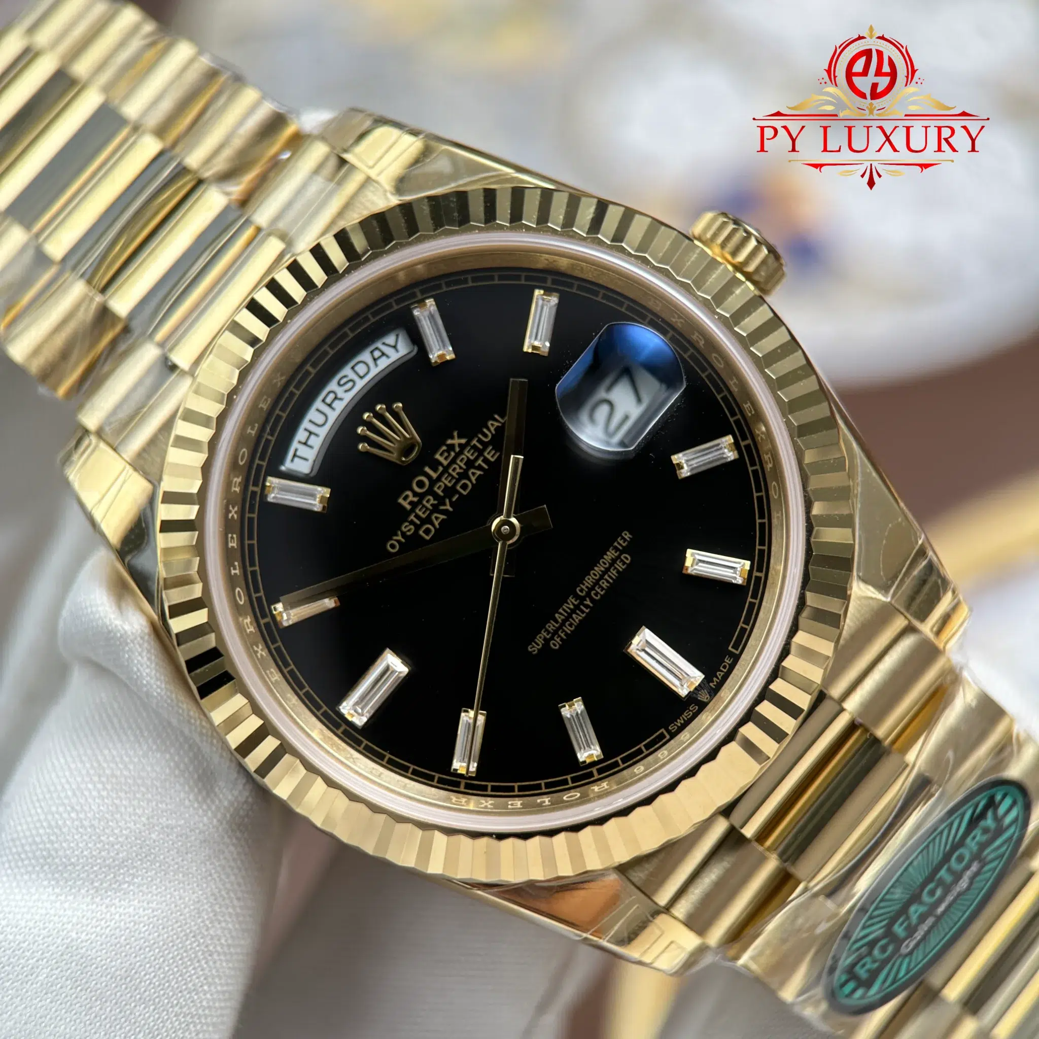 Video of the Rolex Day-Date 228238-0004 Yellow Gold Black Baguette Dial 1:1 Top Quality Replica 210g from RC Factory at Py-Luxury: