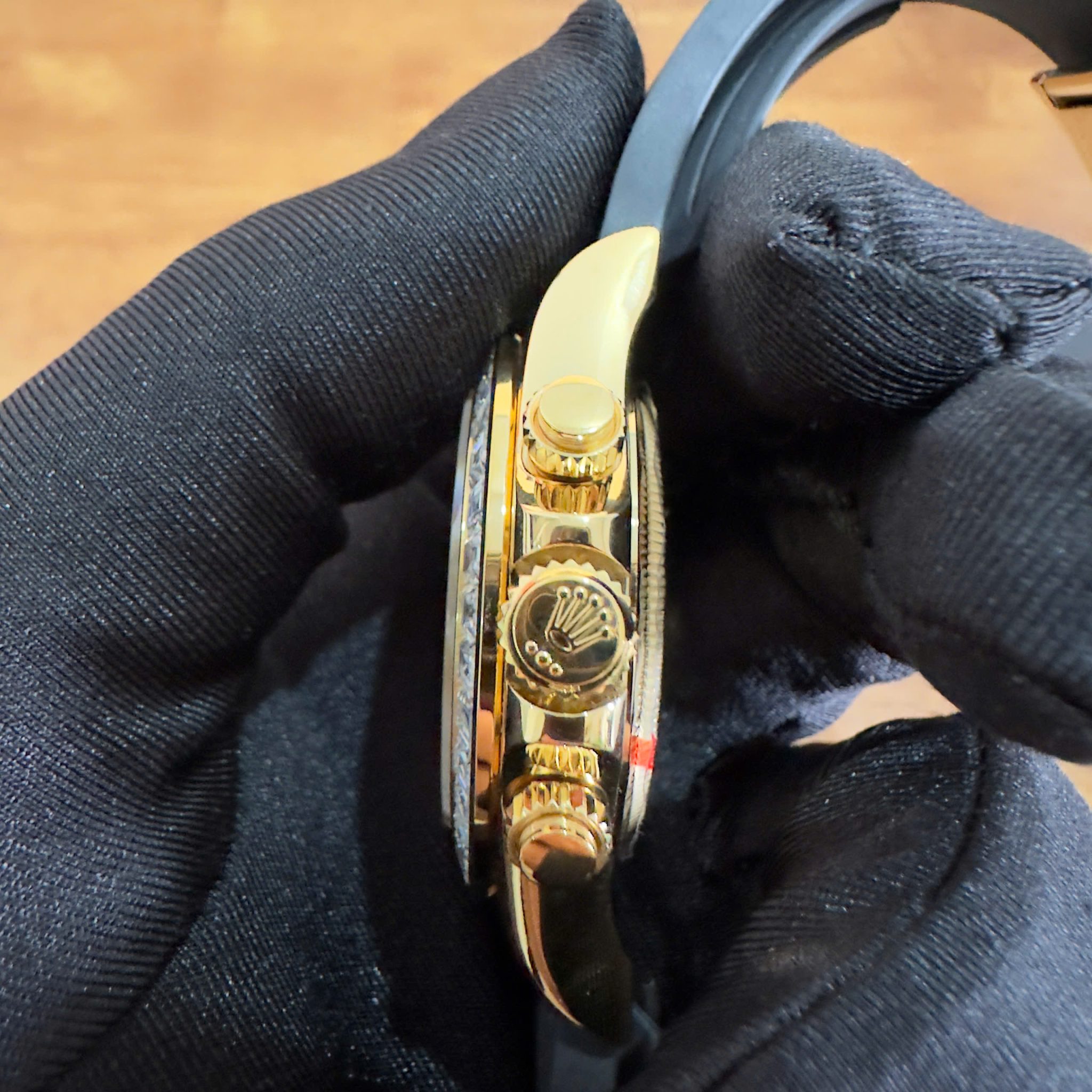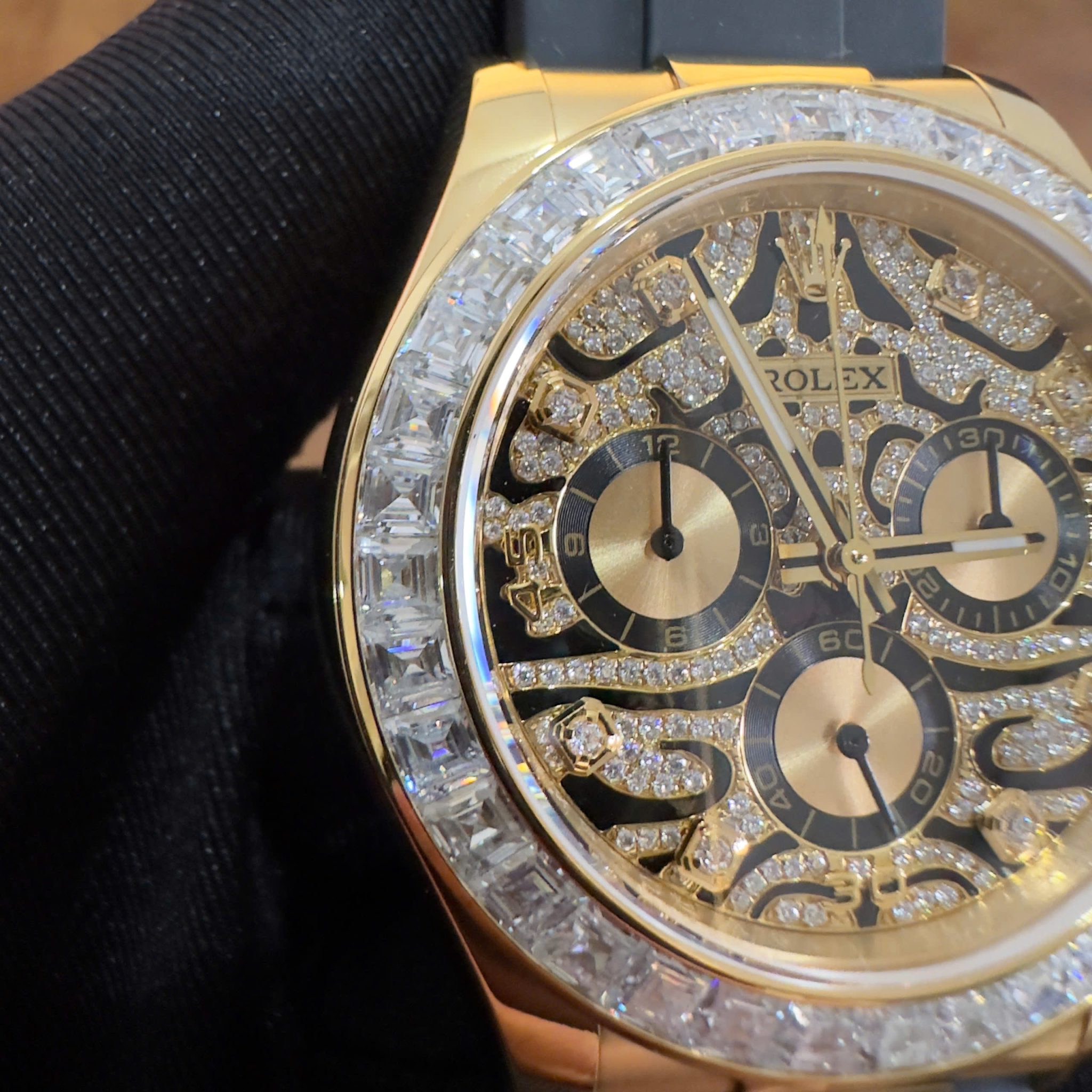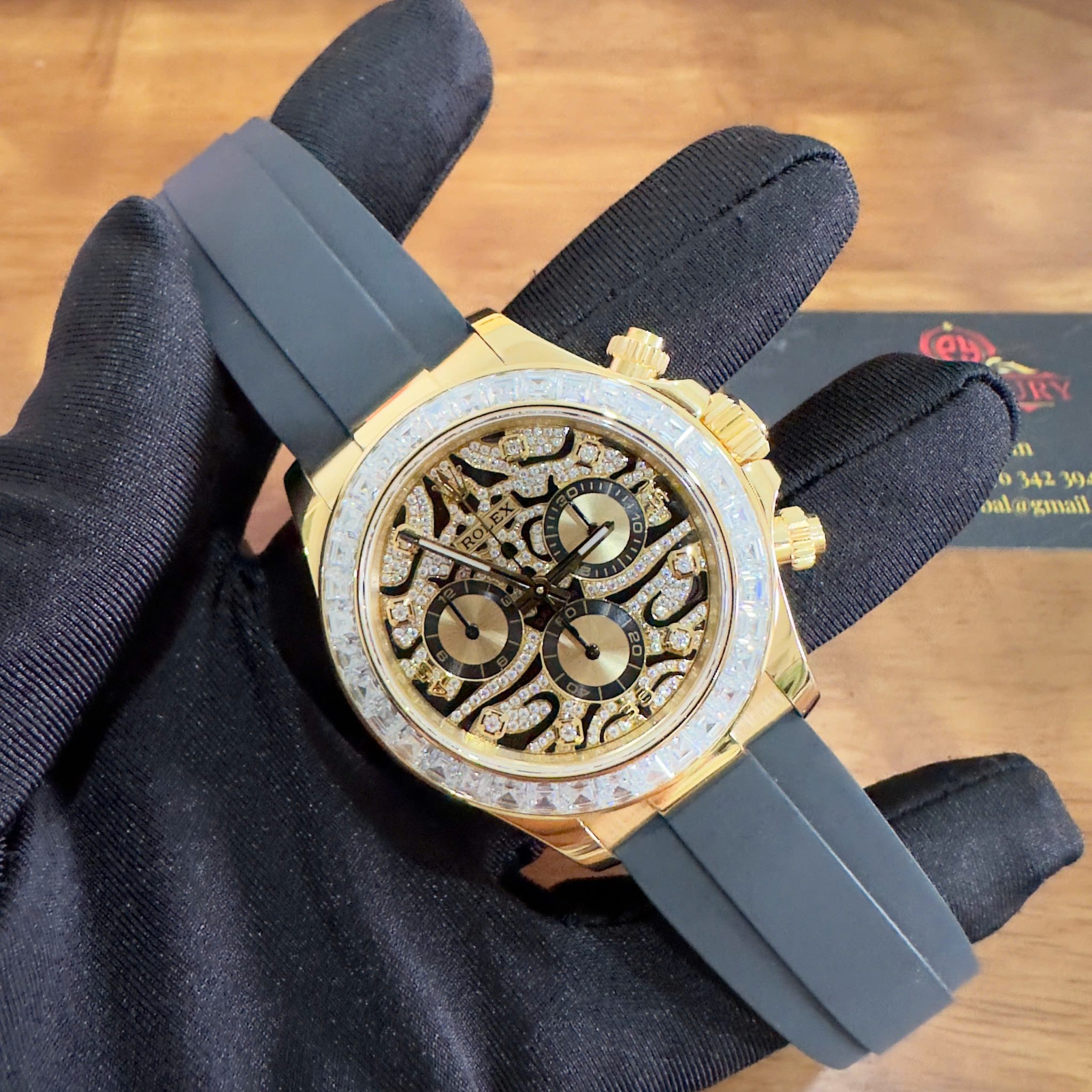 Video of the Rolex Daytona Eye of the Tiger 116588TBR Custom 18K Yellow Gold Plated & Moissanite 1:1 Super Clone 40mm at Py-Luxury: