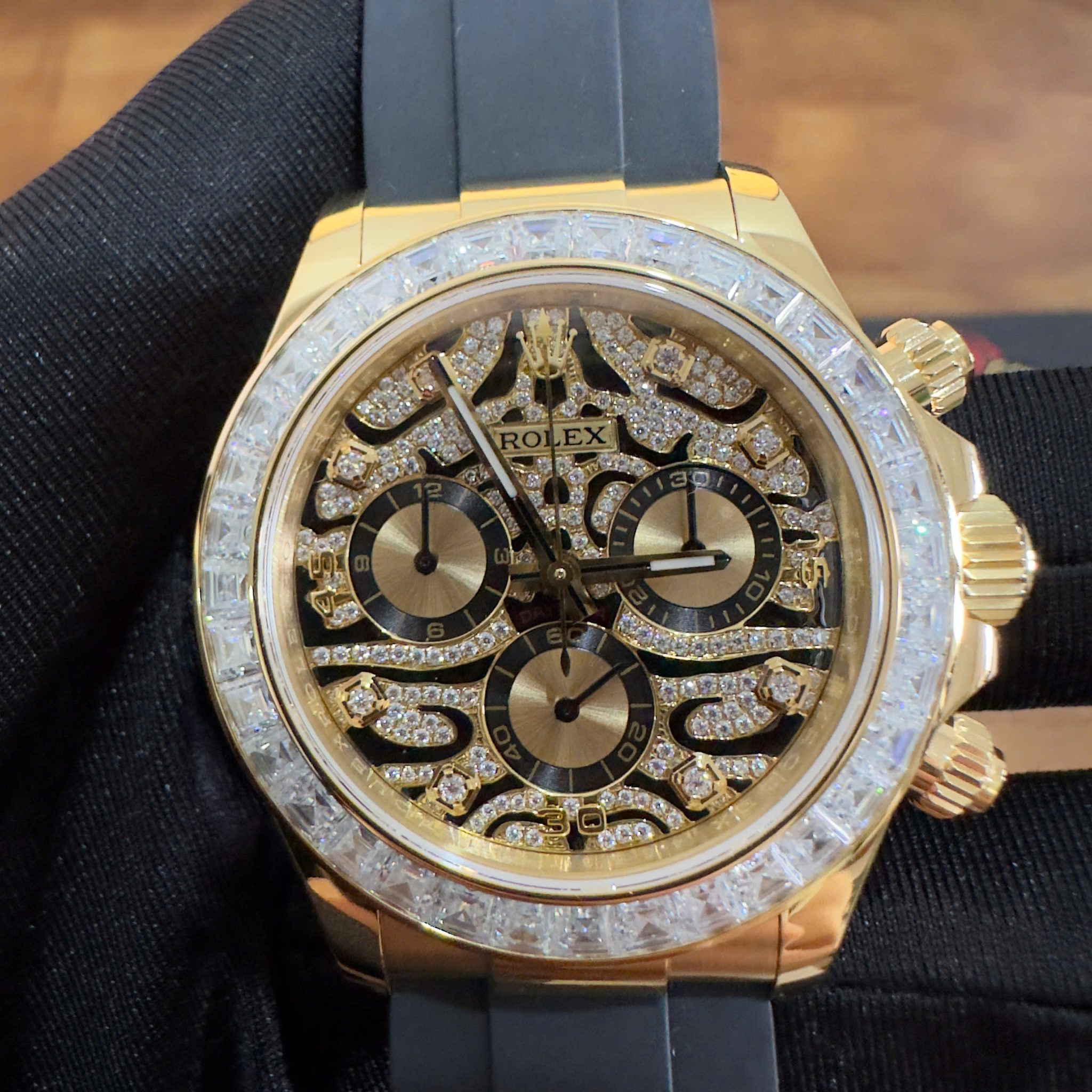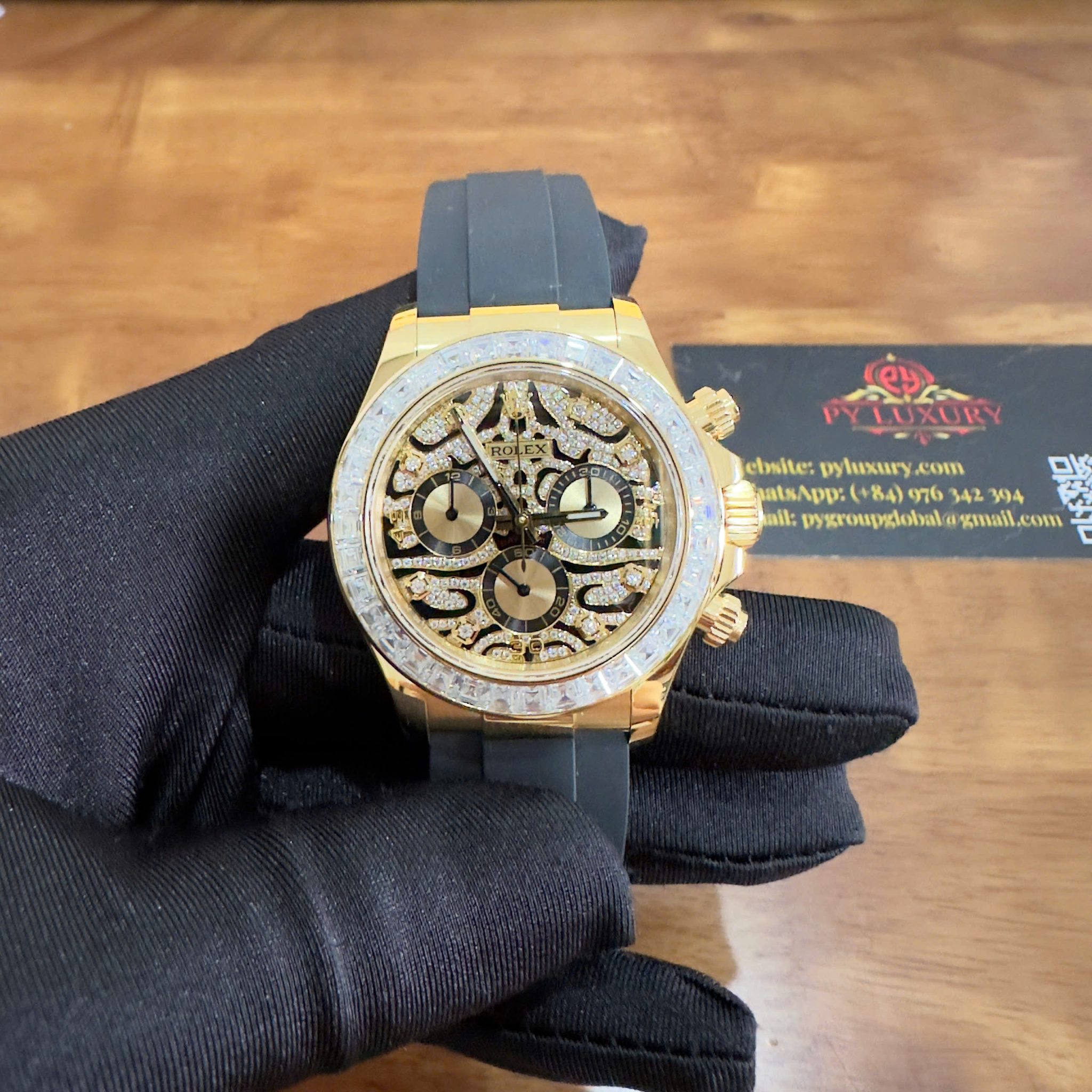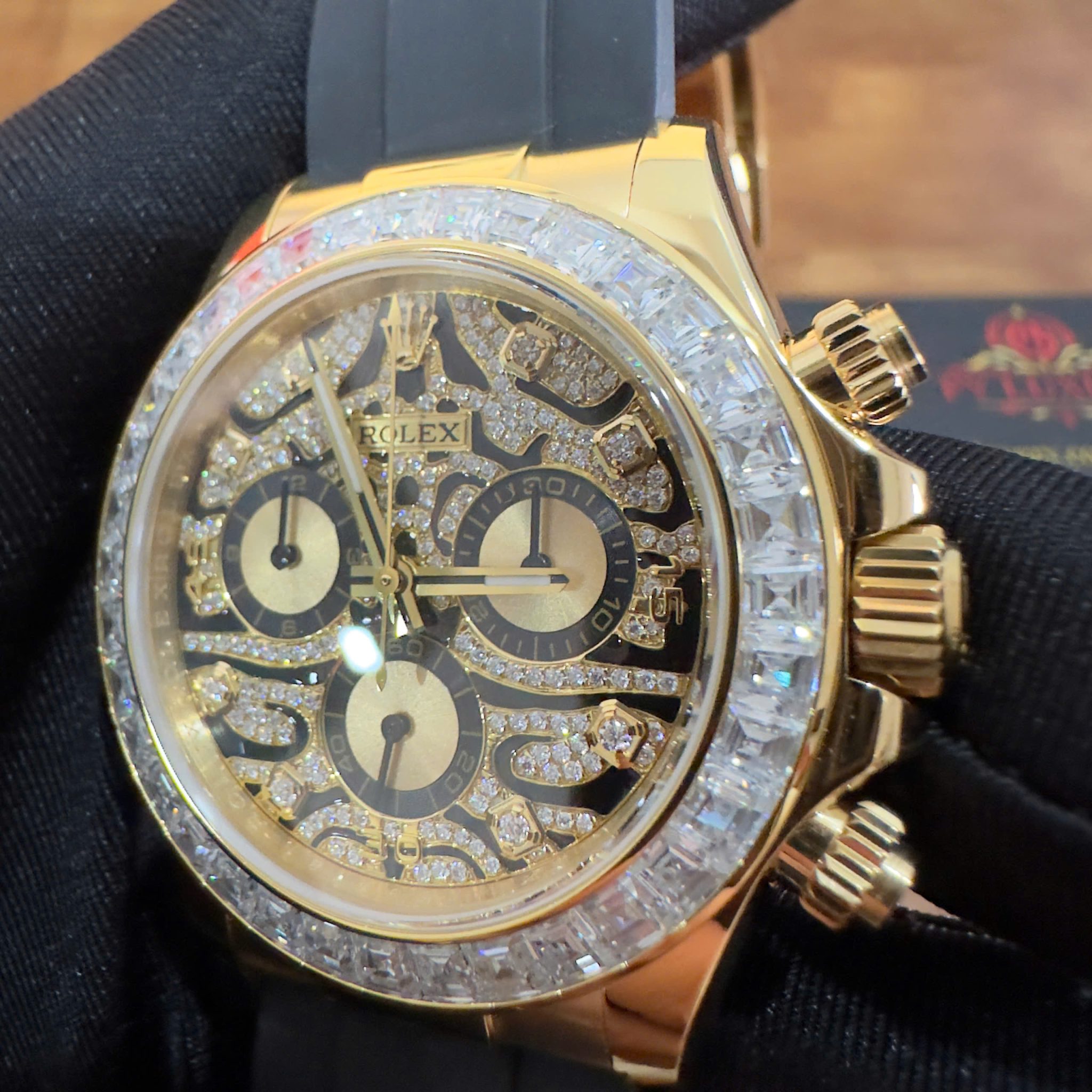 Video of the Rolex Daytona Eye of the Tiger 116588TBR Custom 18K Yellow Gold Plated & Moissanite 1:1 Super Clone 40mm at Py-Luxury: