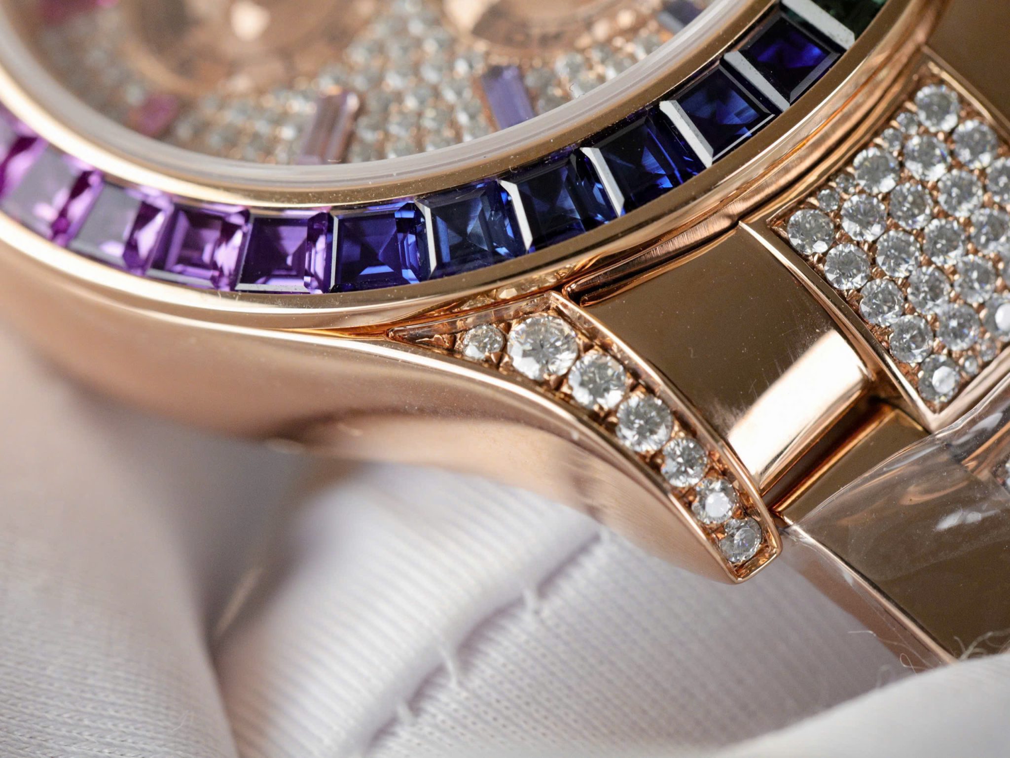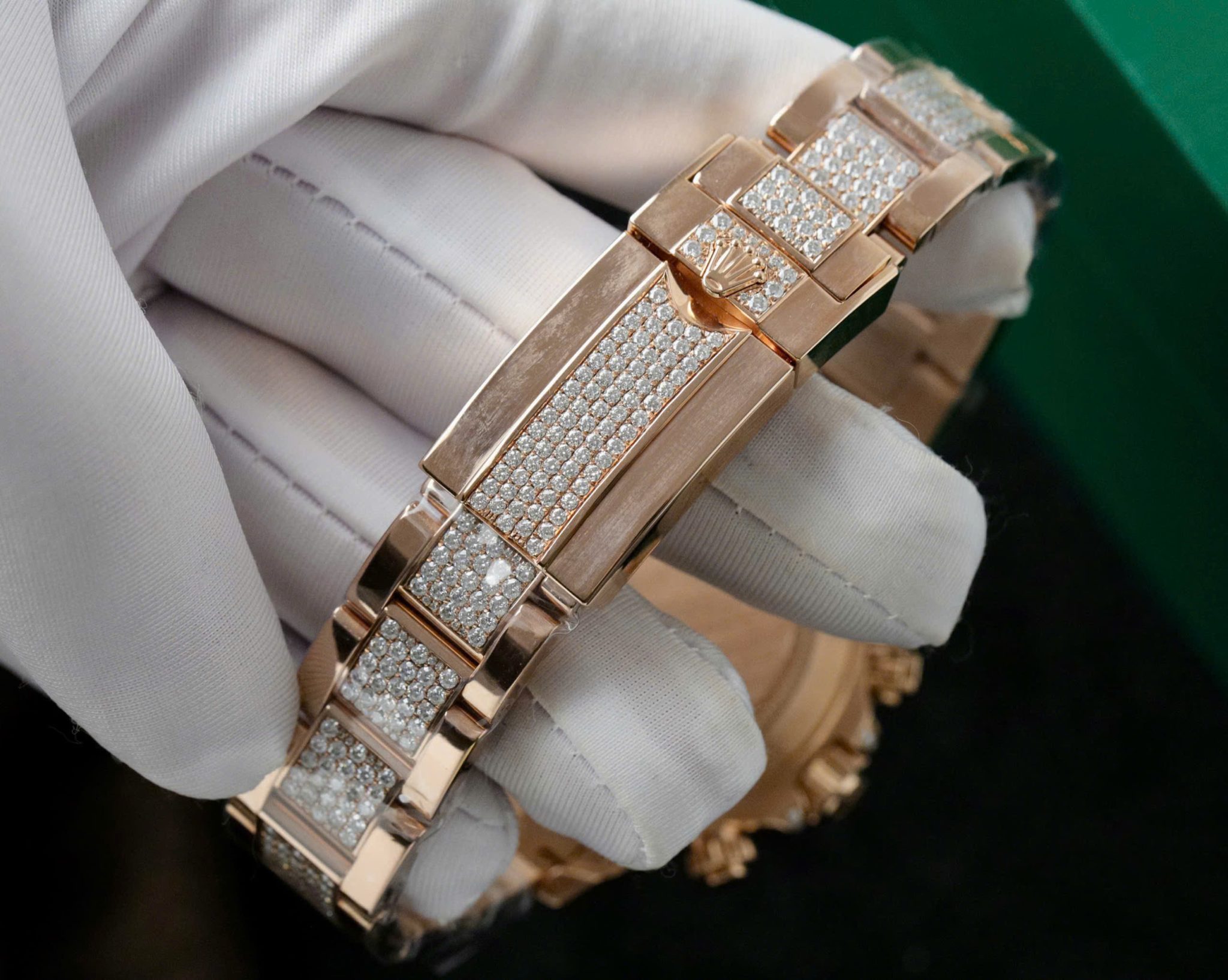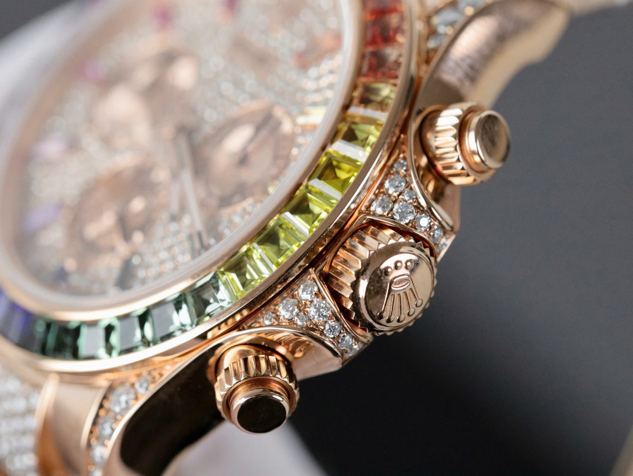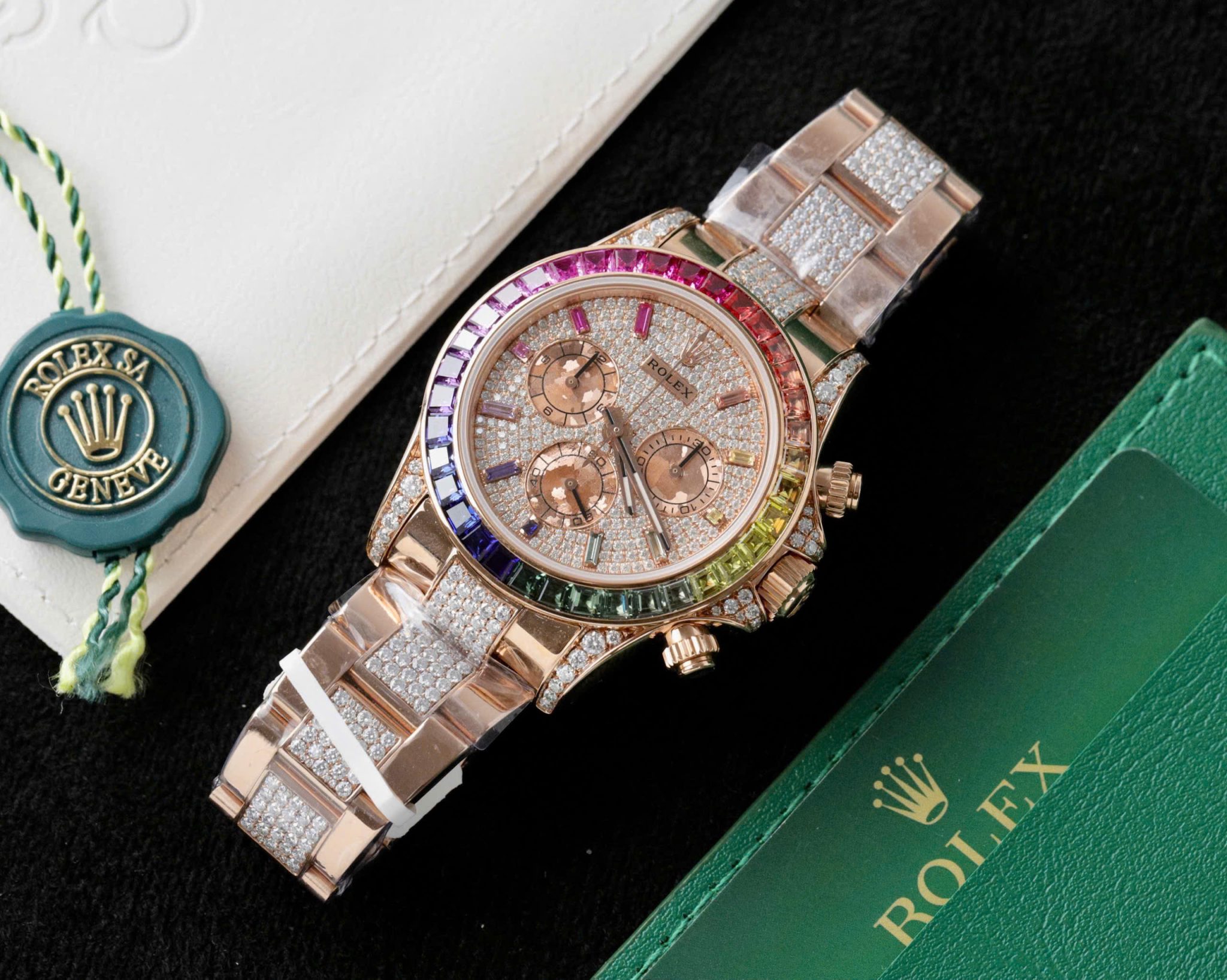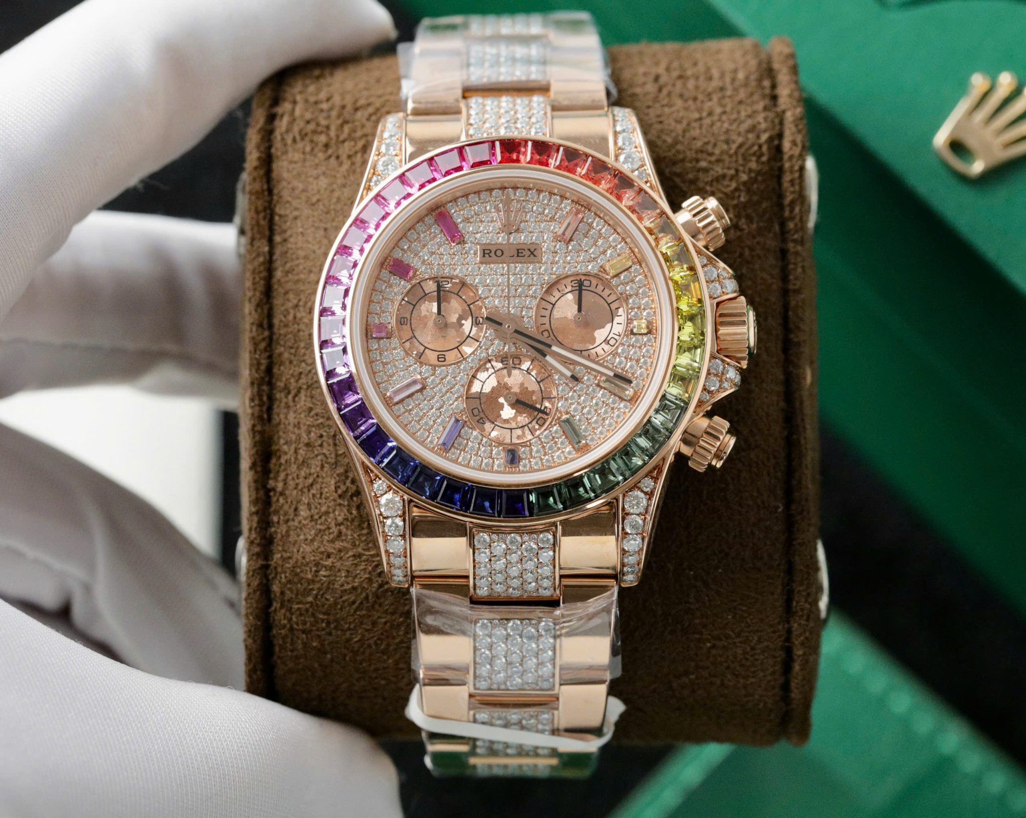 Video of the Rolex Daytona Rainbow 116595RBOW Full Diamond 18K Gold Wrapped Custom Moissanite Best Replica 40mm at Py-Luxury: