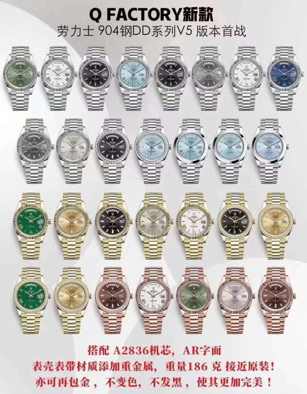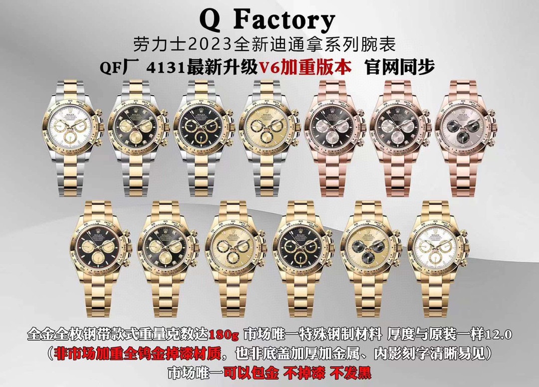 QF is renowned for its Rolex Daytona and Day-Date super clones, offering regular and heavy-weight versions to match authentic Rolex weights. Their Daytona replicas feature a super clone 4130 movement, providing functional chronographs and precise timekeeping. QF’s use of 904L stainless steel and ceramic bezels ensures durability and authenticity. Their heavy-weight Day-Date, with a clone 3255 movement, is praised for its gold-tone finish, making QF a standout in the super clone market.