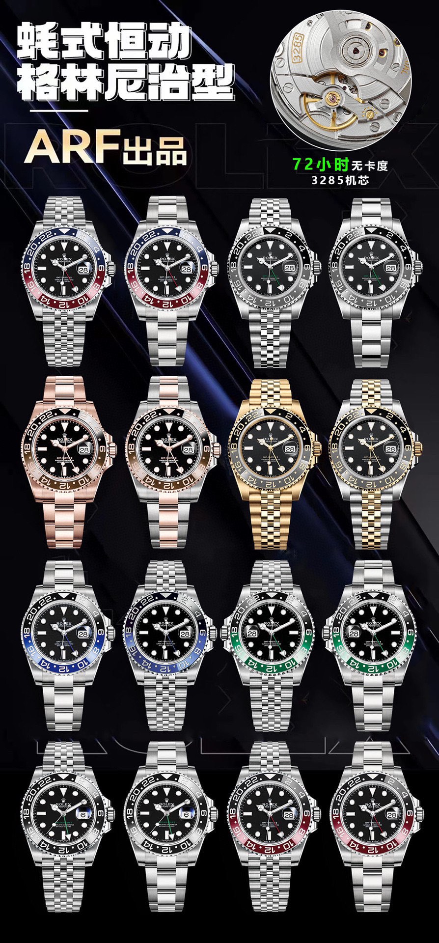 AR Factory is a leader in Rolex super clones, specializing in models like the GMT-Master II “Batman” 116710BLNR, Submariner, and Datejust. Known for superior finishing, ARF uses 904L stainless steel and sapphire crystals, with reliable SH3235 movements for models like the Datejust. Their GMT-Master II replicas feature accurate bezel colors and robust construction, offering a near-authentic feel at a lower price than competitors, making them a top pick for Rolex enthusiasts.